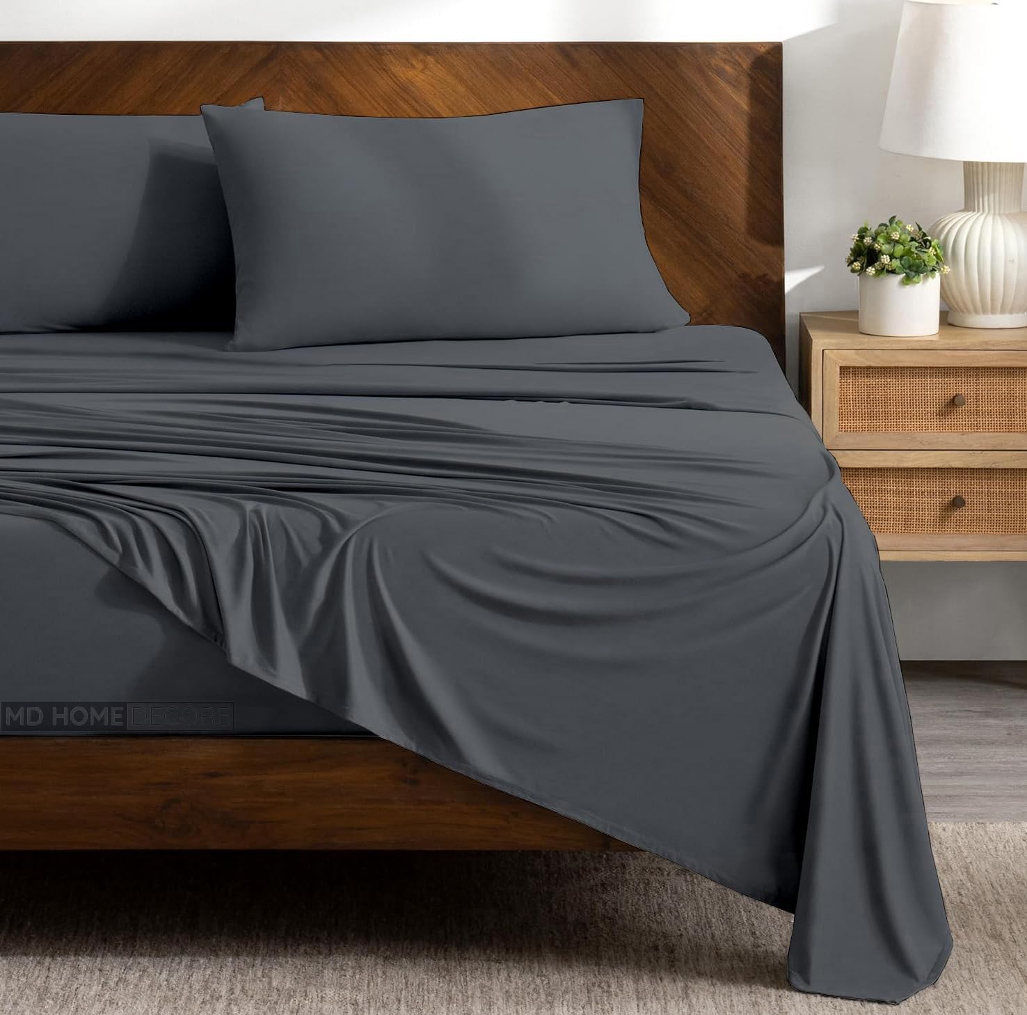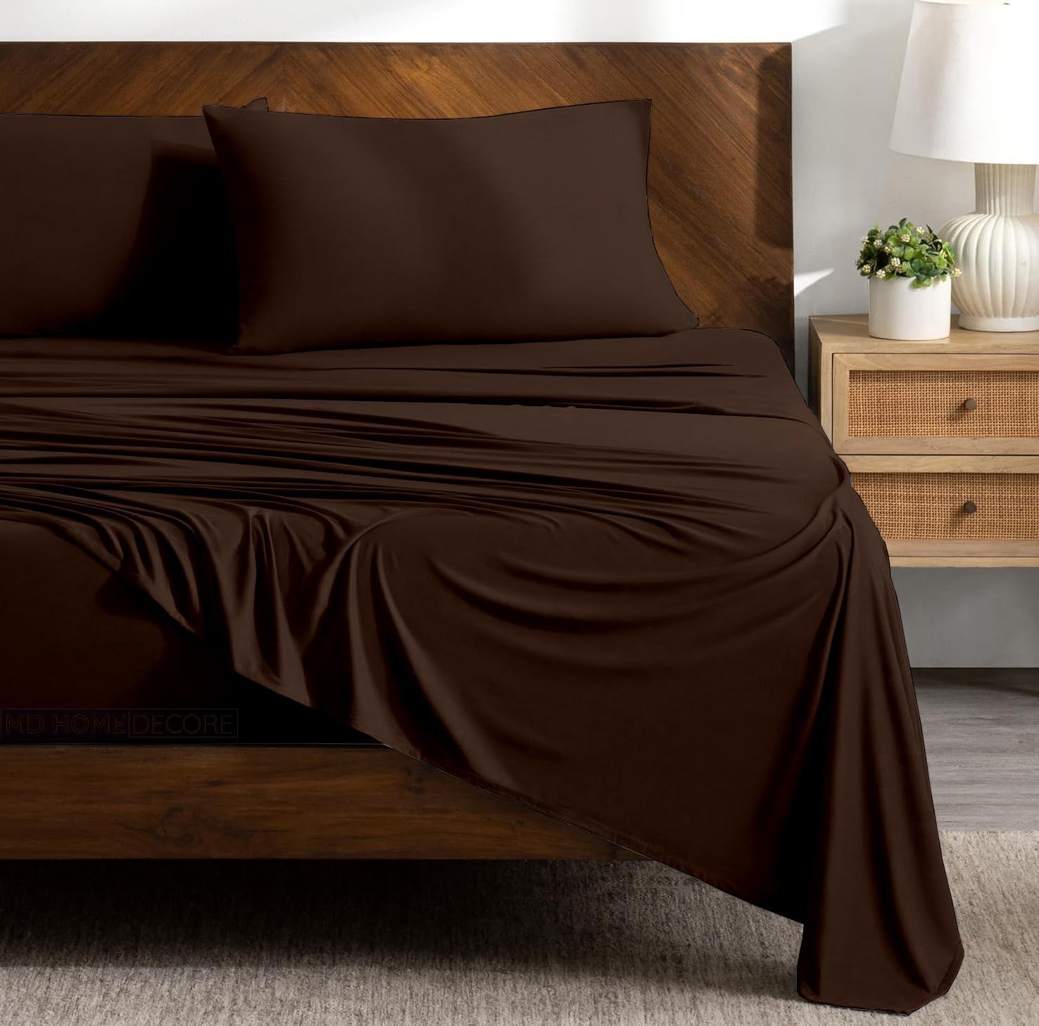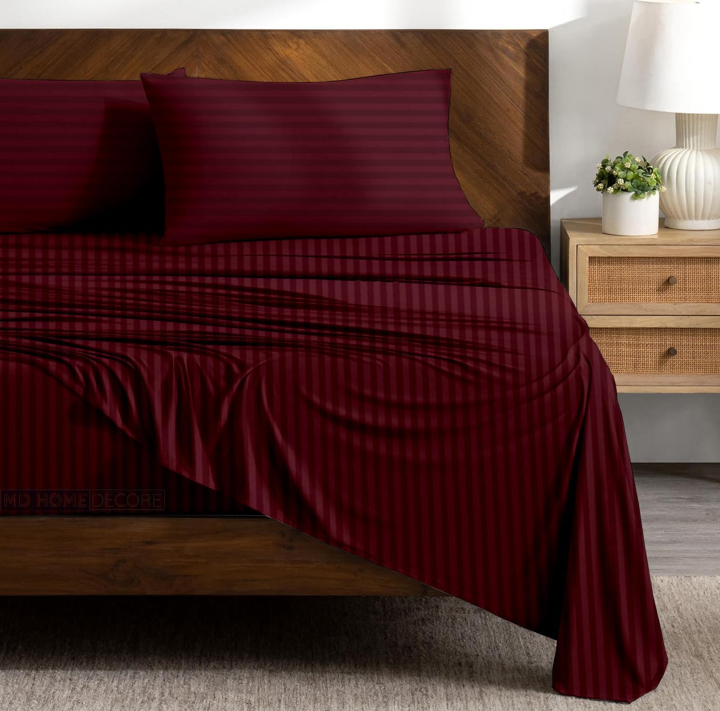 MD Home Decore products are designed to support your body for a healthy night's rest and our bed products are designed to maximize your comfort and luxury for a perfect sleep experience. Egyptian cotton is hand-picked which puts less stress on the fibers, leaving them straight and intact. These fibers can be made longer to create very fine yarns which make it possible to make yarns without sacrificing the length, giving stronger and softer cotton, unlike regular cotton which has more splices. Now you can conveniently buy comfortable luxury bedding in a single package rather than purchasing each item separately. It is often advantageous to buy a sheet set than to buy everything separately. This sheet set include 1 fitted sheet, 1 flat sheet and 2 pillow cases. Available Size- Twin, Twin XL, Full, Full XL, Queen, Short Queen, Queen XL, California Queen, King, California King, RV King, Short King Available Solid/Stripe Color: Burgundy, Chocolate, Ivory, Navy Blue, Sage, Light Grey, Sky Blue, White, Taupe, Dark Grey