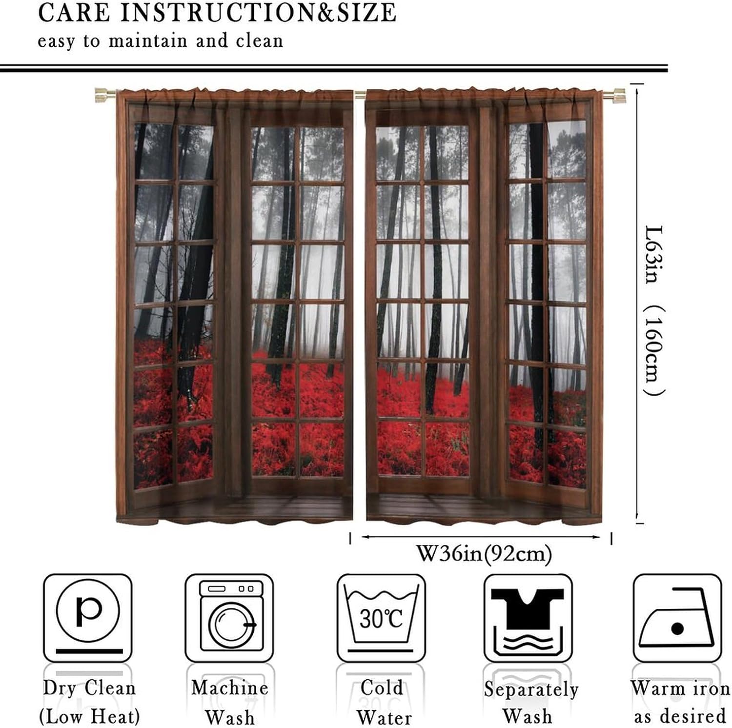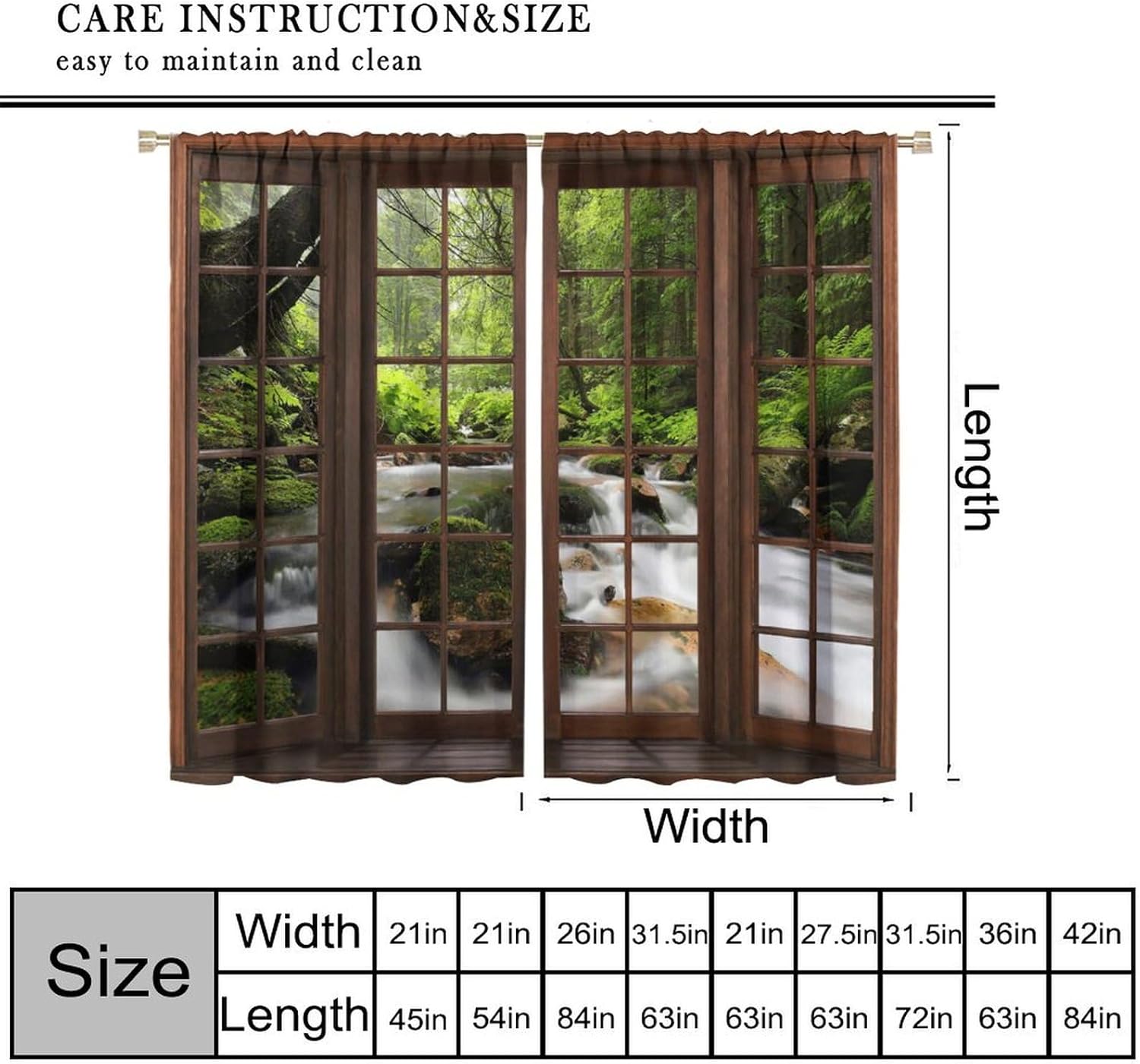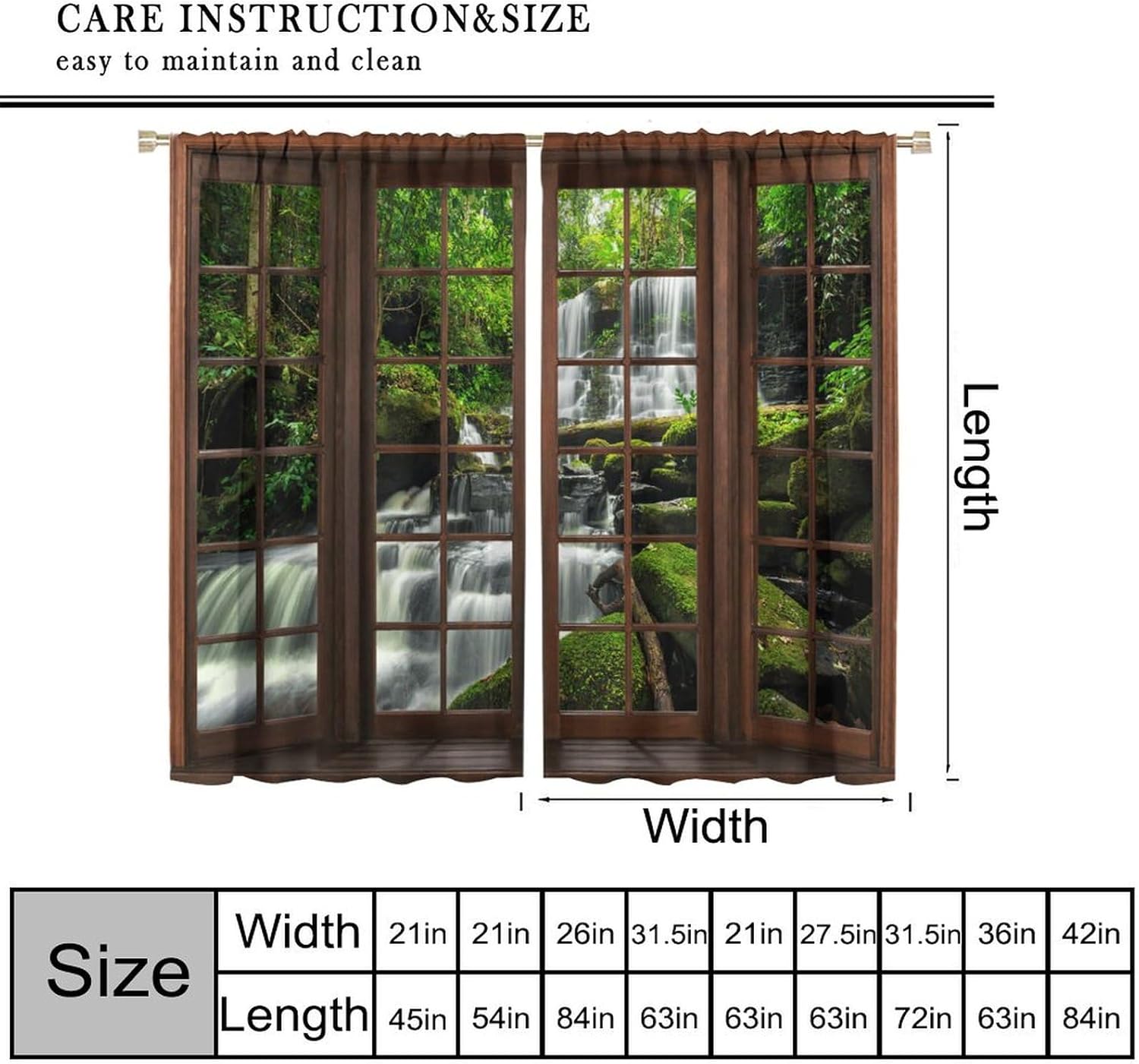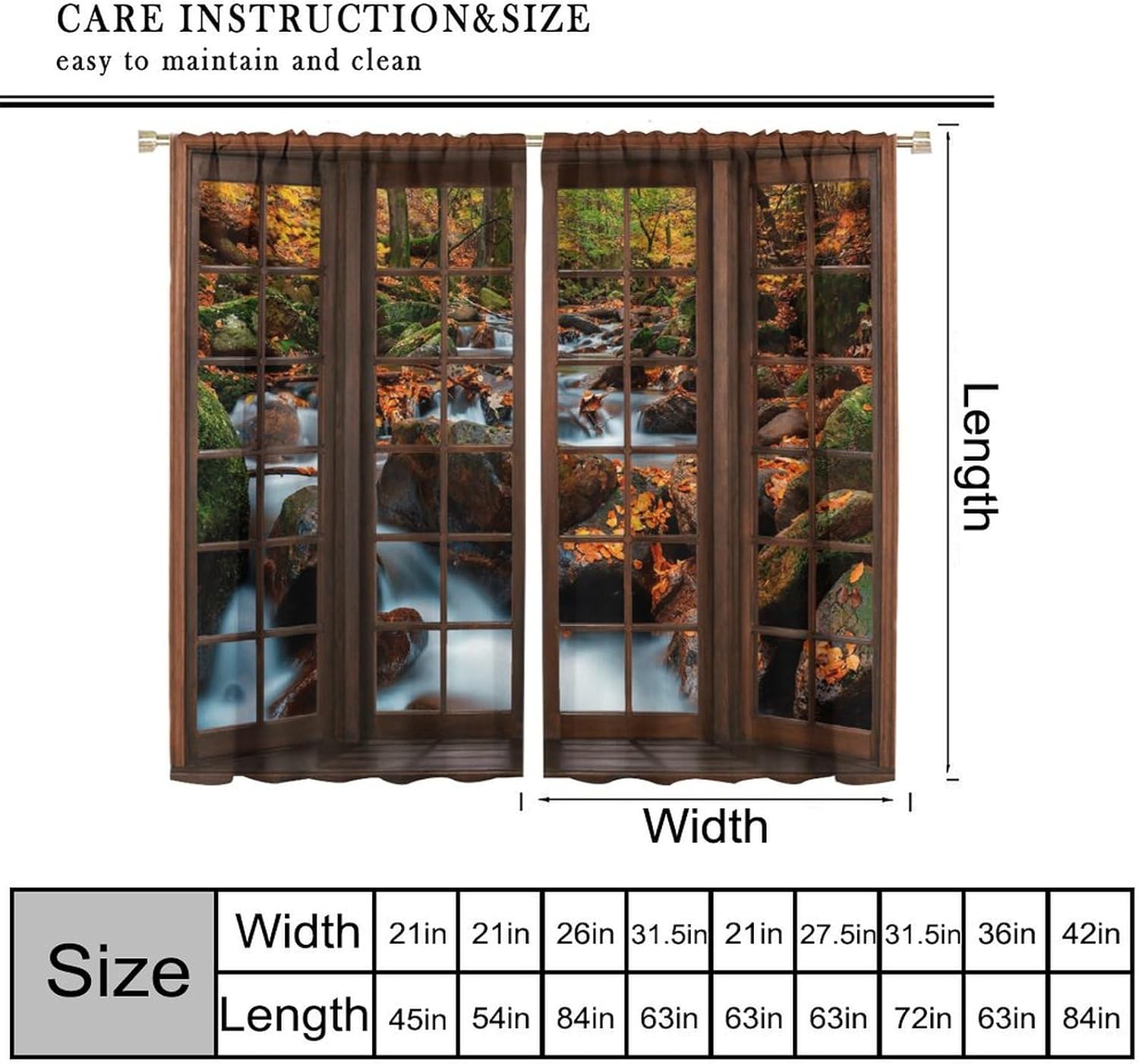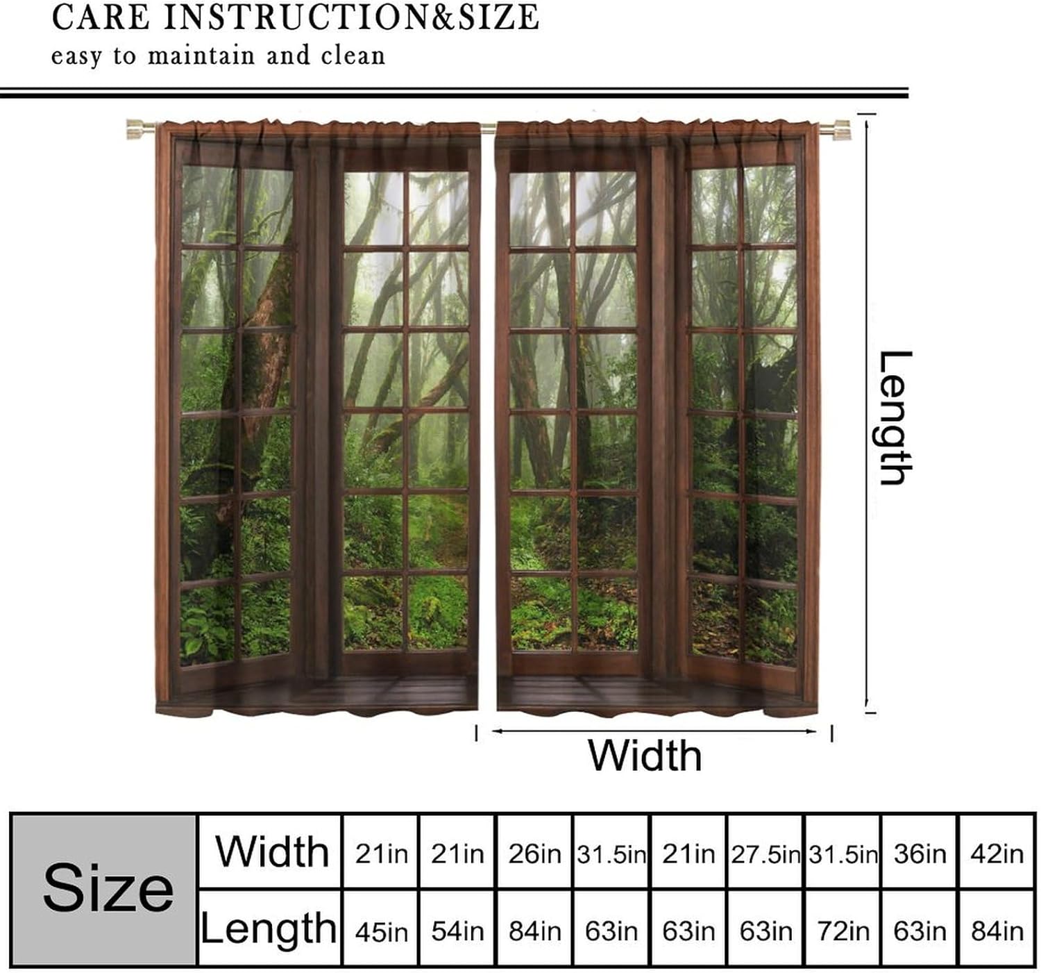 Package included:2 panels per package.Size:One panel measures 21" (W) x 45" (L). The overall size is 42"(W) x 45"(L).One panel piece measures 21" (W) x 54" (L). The overall size is 42"(W) x 54"(L).One panel piece measures 21" (W) x 63" (L). The overall size is 42"(W) x 63"(L).One panel piece measures 27.5" (W) x 63" (L). The overall size is 55" ( W ) x 63" ( L ).One panel piece measures 26" (W) x 84" (L). The overall size is 52" (W) x 84" (L).One panel piece measures 31.5" (W) x 63" (L). The overall size is 63" (W) x 63" (L).One panel piece measures 36" (W) x 63" (L). The overall size is 72" (W) x 63" (L).One panel piece measures 31.5" (W) x 72" (L). The overall size is 63" (w) x 72" (L).One panel piece measures 42" (W) x 84" (L). , The overall size is 84" (W) x 84" (L).About the material:1. Made of fiber polyester fabric.2. High color fastness, no fading even after long term use.3. No chemical coating, no odor, healthier and safer for people, especially for babies and children.About the function.1. It can block out 70%-90% of light and can protect privacy by blocking light or darkening the room.2. It is very suitable for bedroom, living room, kitchen, cafe, office, closet, door, bathroom, dining room, dormitory, nursery, outdoor patio, etc.3. It is also one of the best gifts for family, friends, relatives or yourself.Warm tips:1. Machine washable in cold water.2. The pattern is only on one side, the other side is white.3. Due to manual measurement, please allow 1-2 cm difference.Our service:We focus on customer satisfaction. If you have any questions or problems, please contact us by email, we will reply within 24 hours and provide a satisfactory solution.