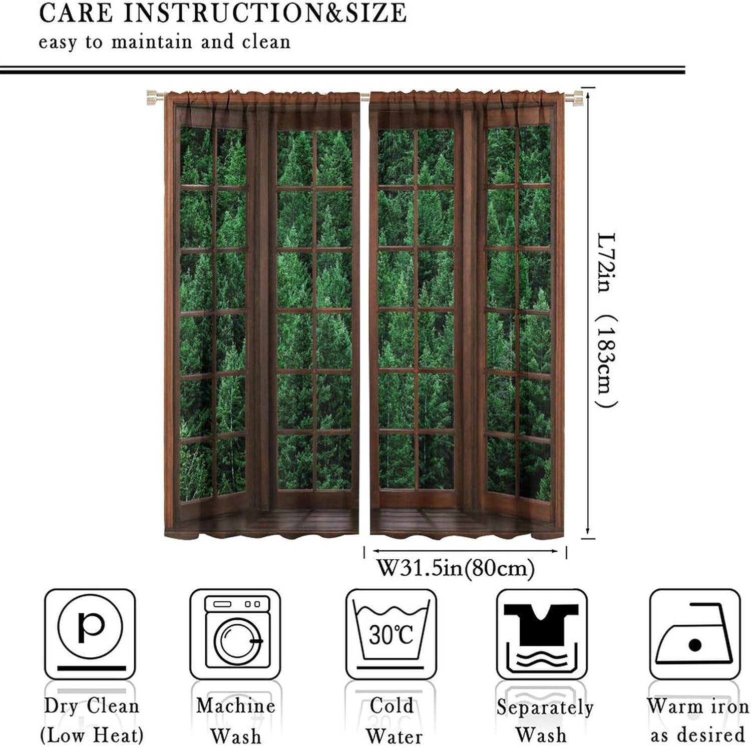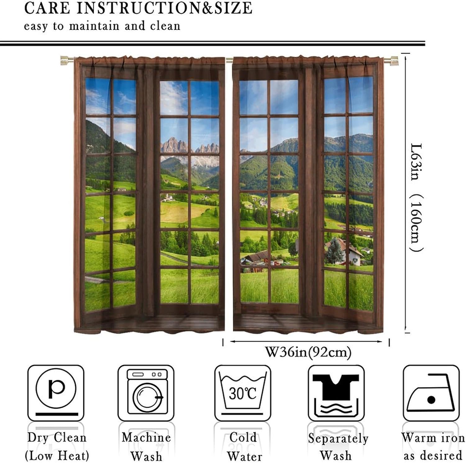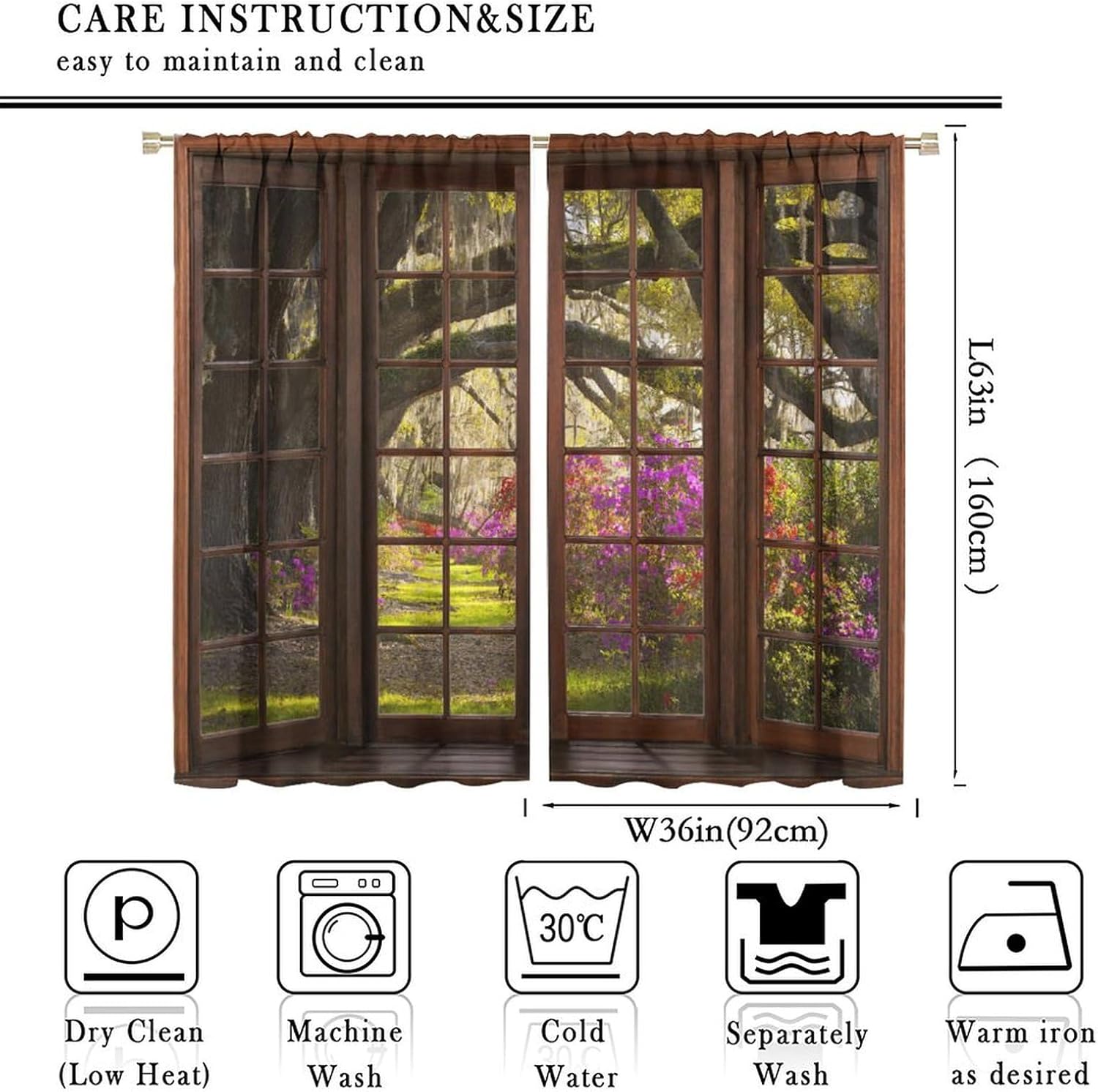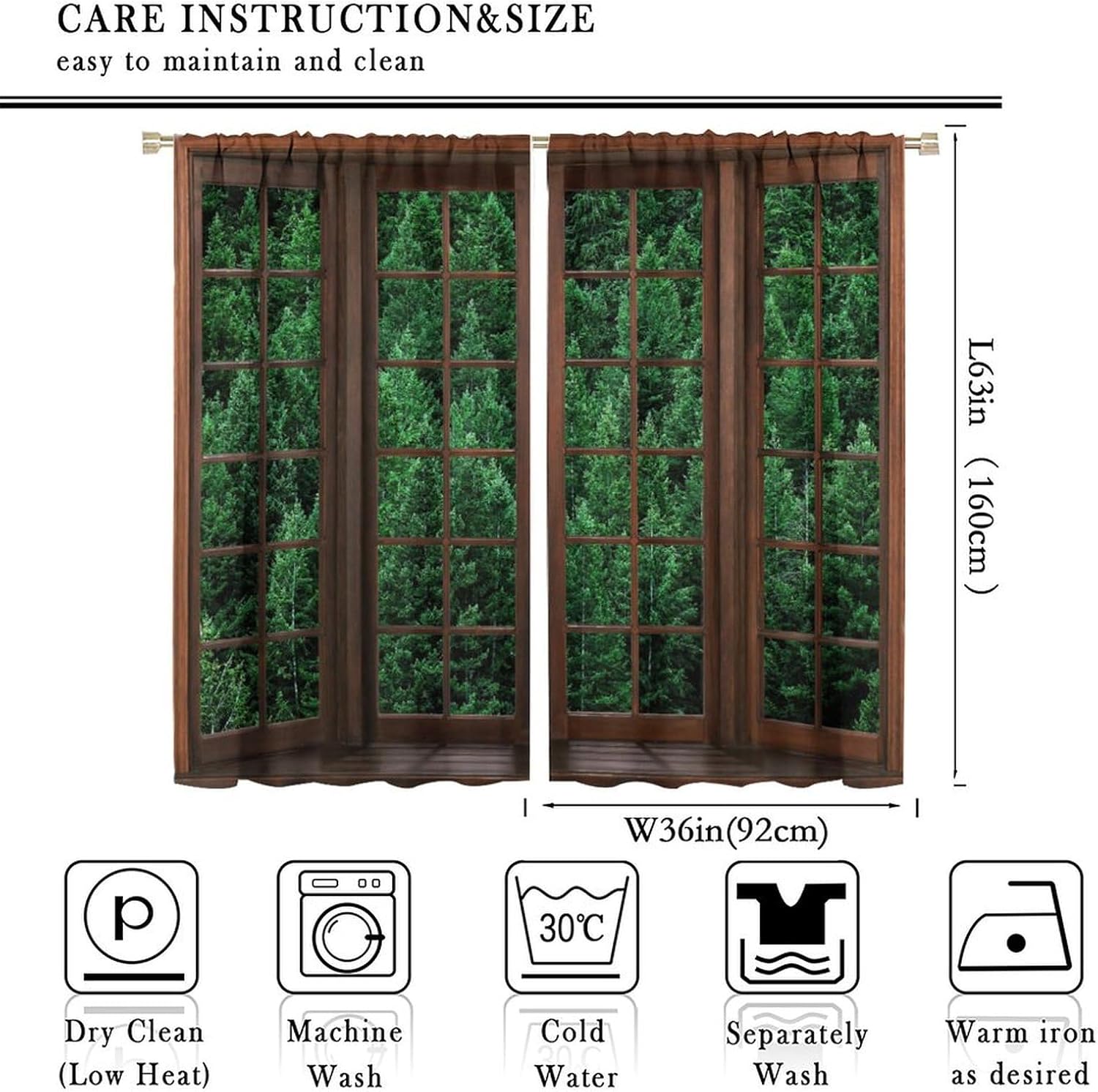 Package included:2 panels per package.Size:One panel measures 21" (W) x 45" (L). The overall size is 42"(W) x 45"(L).One panel piece measures 21" (W) x 54" (L). The overall size is 42"(W) x 54"(L).One panel piece measures 21" (W) x 63" (L). The overall size is 42"(W) x 63"(L).One panel piece measures 27.5" (W) x 63" (L). The overall size is 55" ( W ) x 63" ( L ).One panel piece measures 26" (W) x 84" (L). The overall size is 52" (W) x 84" (L).One panel piece measures 31.5" (W) x 63" (L). The overall size is 63" (W) x 63" (L).One panel piece measures 36" (W) x 63" (L). The overall size is 72" (W) x 63" (L).One panel piece measures 31.5" (W) x 72" (L). The overall size is 63" (w) x 72" (L).One panel piece measures 42" (W) x 84" (L). , The overall size is 84" (W) x 84" (L).About the material:1. Made of fiber polyester fabric.2. High color fastness, no fading even after long term use.3. No chemical coating, no odor, healthier and safer for people, especially for babies and children.About the function.1. It can block out 70%-90% of light and can protect privacy by blocking light or darkening the room.2. It is very suitable for bedroom, living room, kitchen, cafe, office, closet, door, bathroom, dining room, dormitory, nursery, outdoor patio, etc.3. It is also one of the best gifts for family, friends, relatives or yourself.Warm tips:1. Machine washable in cold water.2. The pattern is only on one side, the other side is white.3. Due to manual measurement, please allow 1-2 cm difference.Our service:We focus on customer satisfaction. If you have any questions or problems, please contact us by email, we will reply within 24 hours and provide a satisfactory solution.