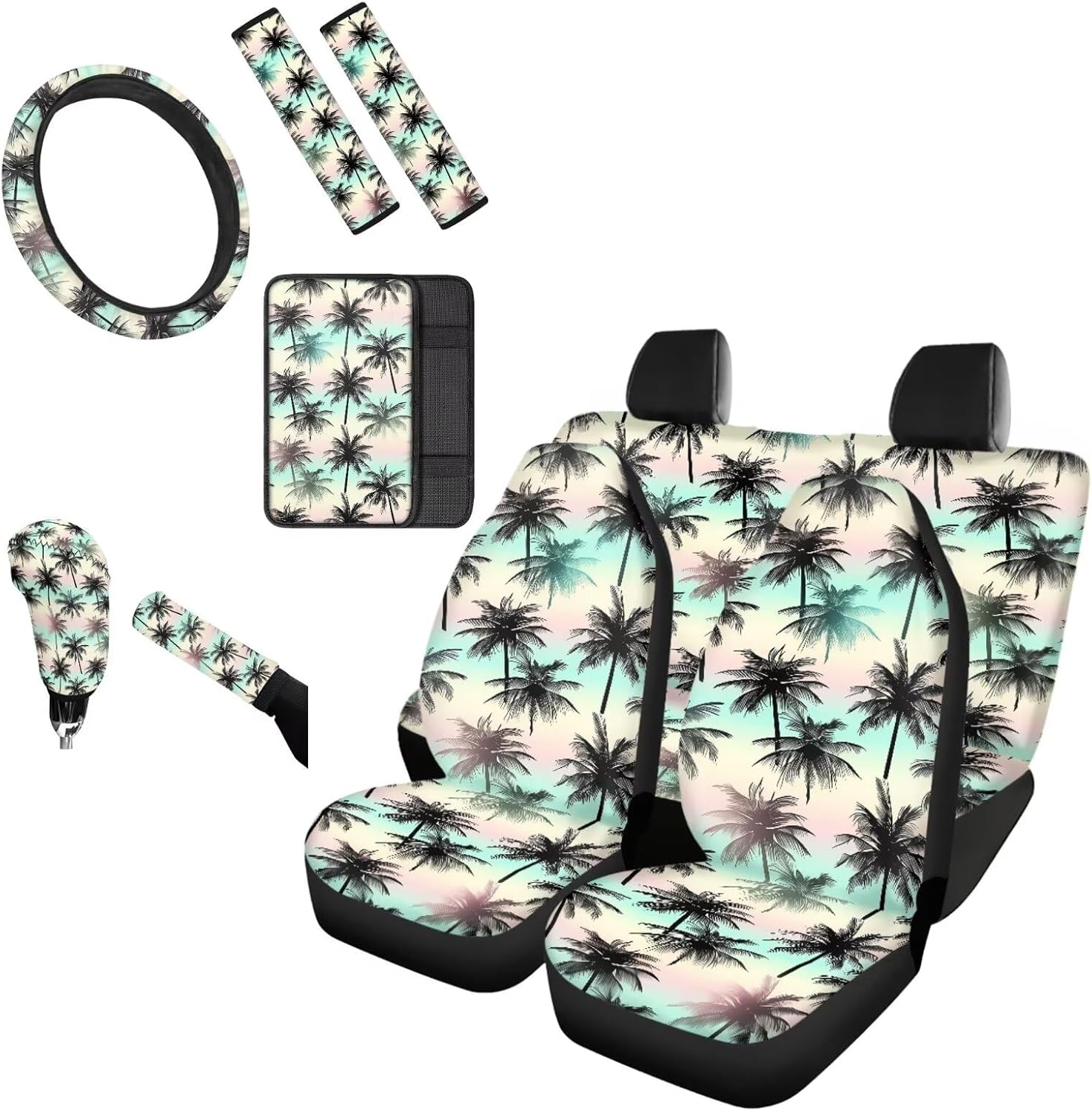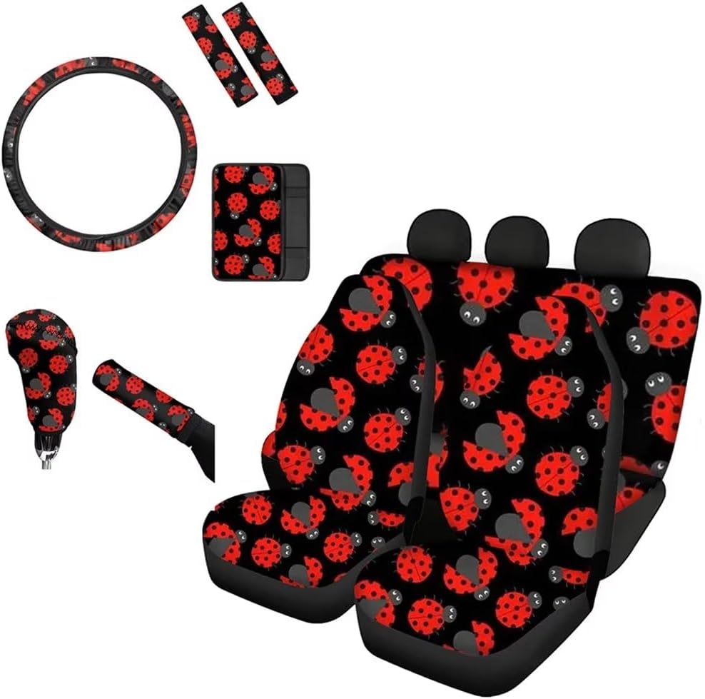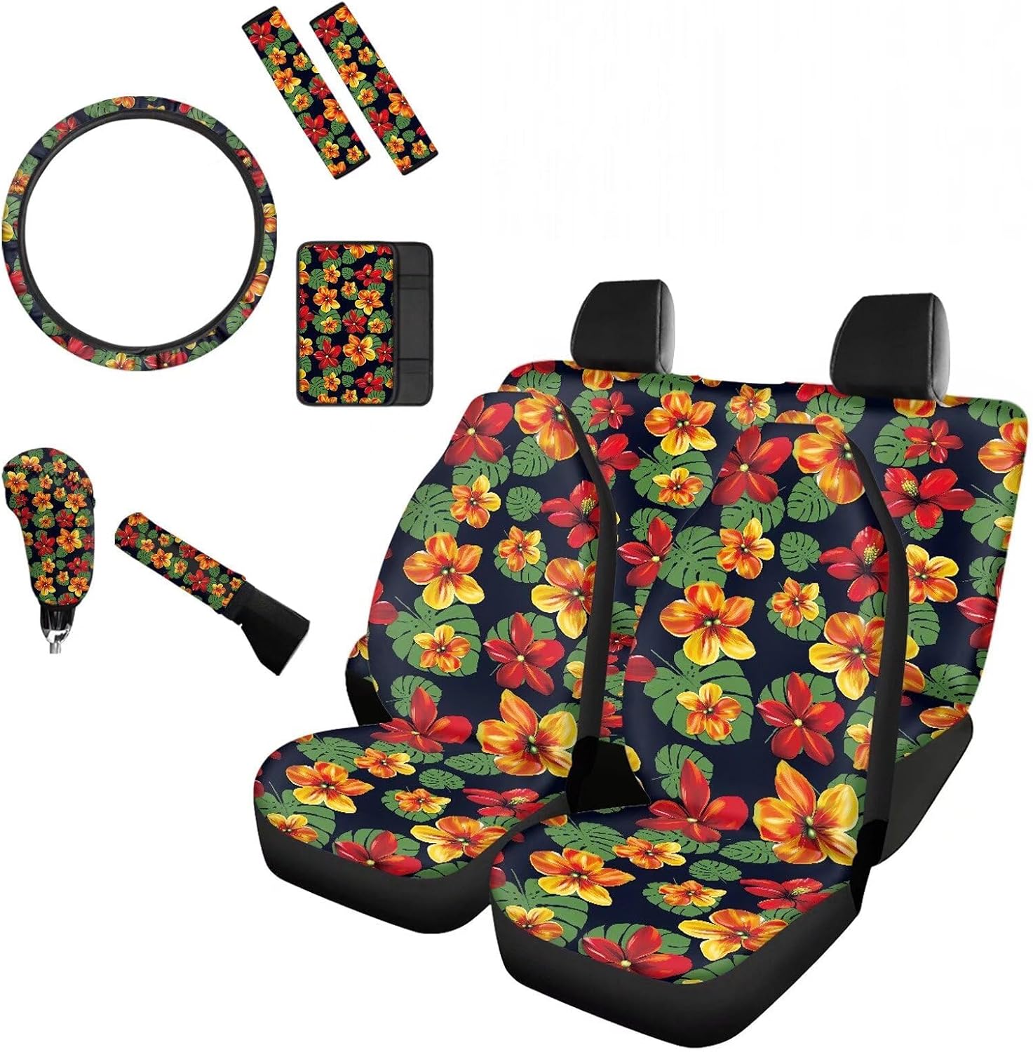 [10 pieces car interior accessories] 2 Front Seat Covers,2 Back Seat cover,2 Seat Belt Cover,1 Steering Wheel Cover,1 Armrest Cushion,1 Handbrake Cover,1 Gear Shift Cover. Universal Auto Accessories Set fit for most vehicles,cars trucks suvs vans. Heavy duty car interior protector,keep clean and easy to care. With special pattern and vivid colors print,great car interior decoration for you,make your driving more ethnic and comfortable. If you are not sure car seat covers is suitable for your car seat,please measure your seat size before order to ensure it is fit.