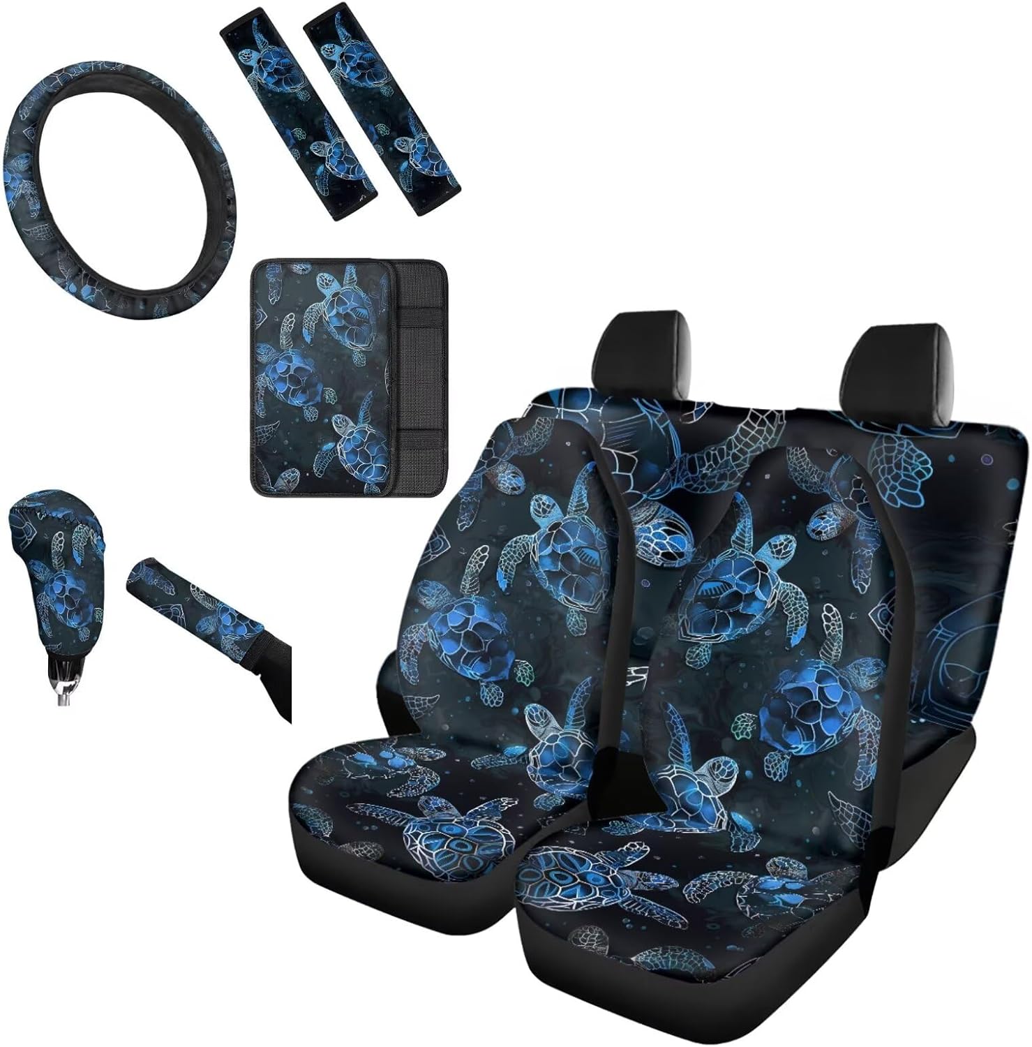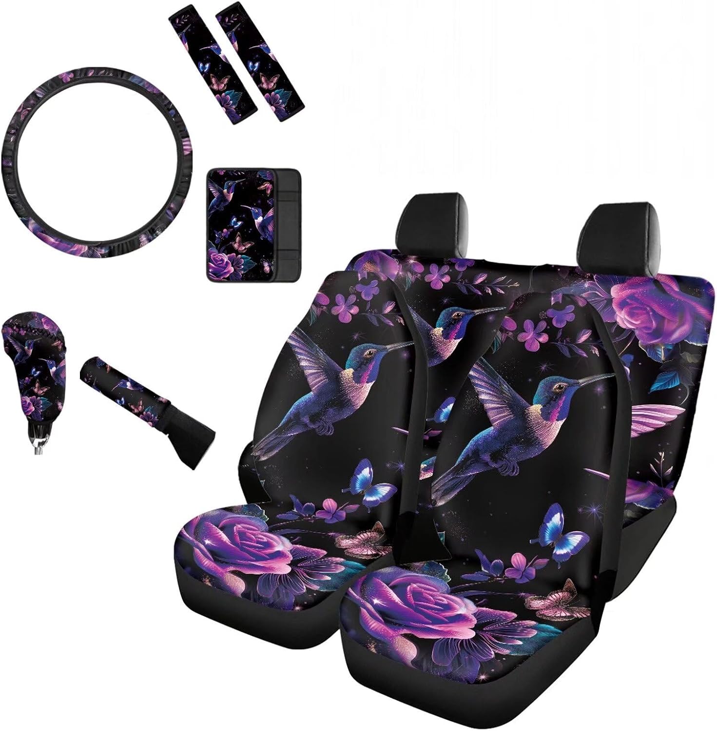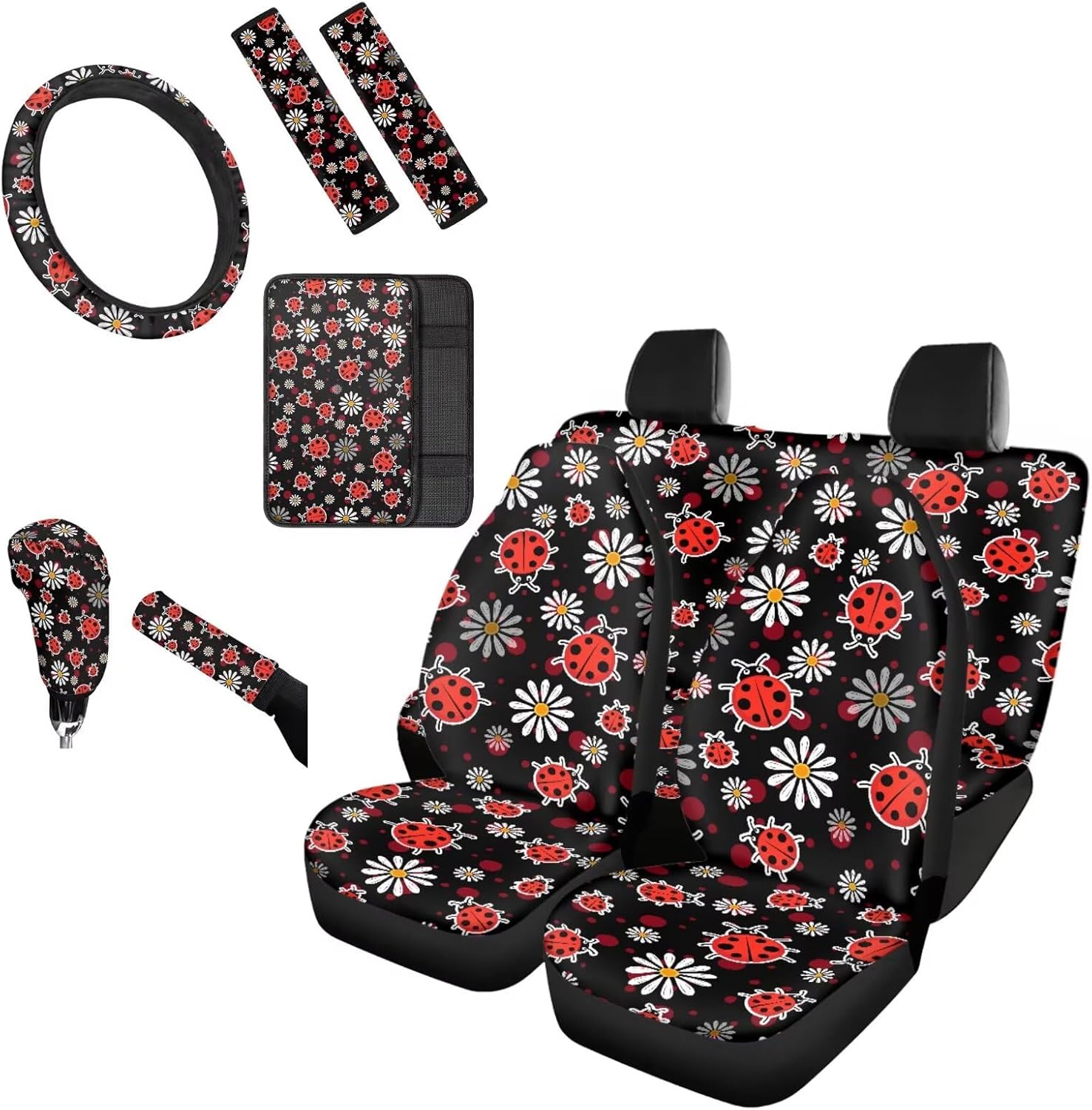 [10 pieces car interior accessories] 2 Front Seat Covers,2 Back Seat cover,2 Seat Belt Cover,1 Steering Wheel Cover,1 Armrest Cushion,1 Handbrake Cover,1 Gear Shift Cover. Universal Auto Accessories Set fit for most vehicles,cars trucks suvs vans. Heavy duty car interior protector,keep clean and easy to care. With special pattern and vivid colors print,great car interior decoration for you,make your driving more ethnic and comfortable. If you are not sure car seat covers is suitable for your car seat,please measure your seat size before order to ensure it is fit.