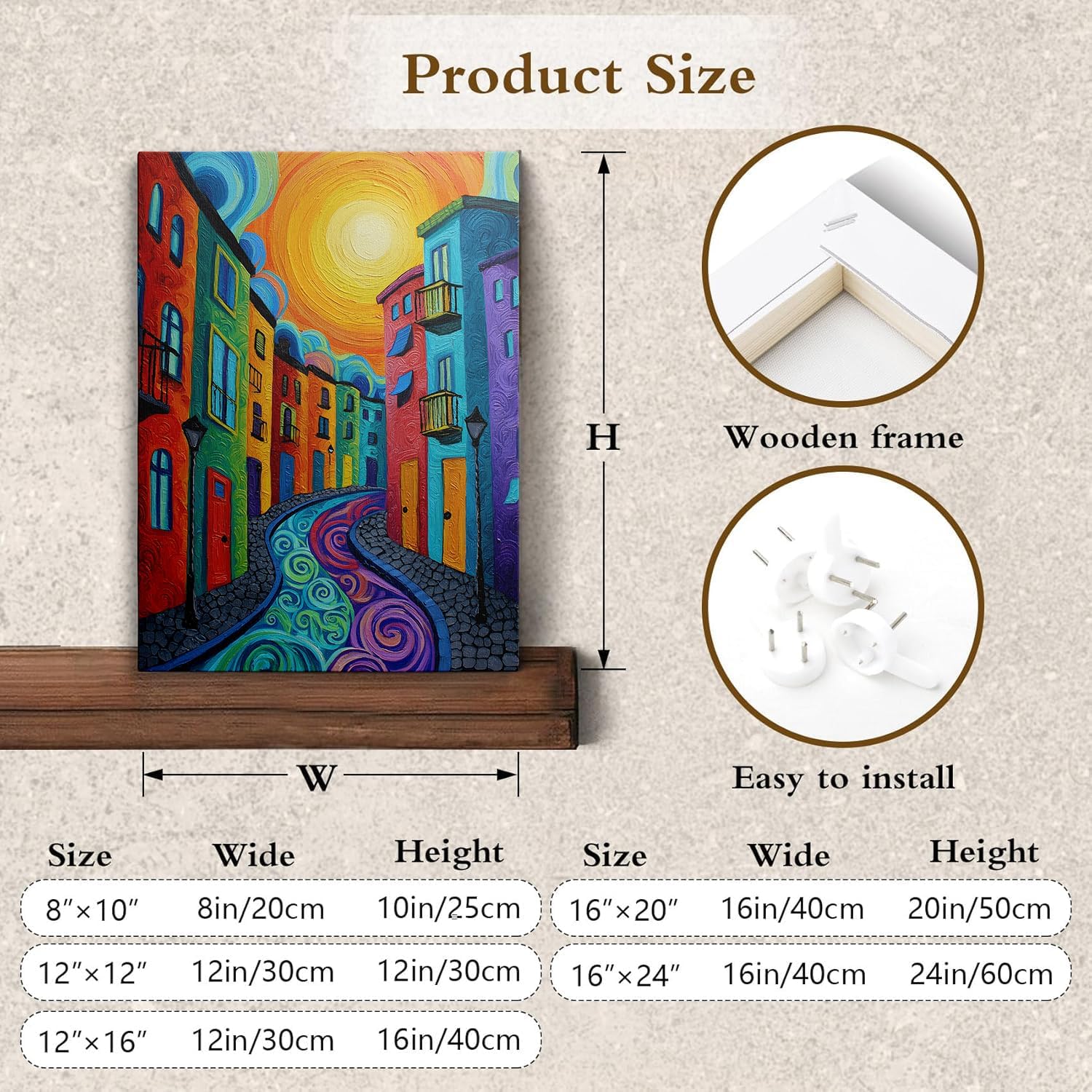 Transform your living space with this captivating modern canvas wall art that brings an urban streetscape to vibrant life. This striking piece features a mesmerizing array of colorful buildings in bold reds, greens, yellows, and blues, set against a dramatic golden sun and swirling sky. The cobblestone street below flows with dynamic spiral patterns in harmonious blues and purples, creating a sense of movement and energy. The textured brushwork and rich color palette make this abstract architectural painting a stunning focal point for any room. Perfect for contemporary home decor, this artwork adds a splash of color and artistic flair to living rooms, bedrooms, offices, or hallways. The canvas construction ensures durability while maintaining the artwork's professional gallery appearance. This piece seamlessly combines urban sophistication with whimsical charm, making it an eye-catching addition to modern and eclectic interior designs. The vivid composition draws viewers in, creating an engaging visual experience that sparks conversation and brightens any space.
