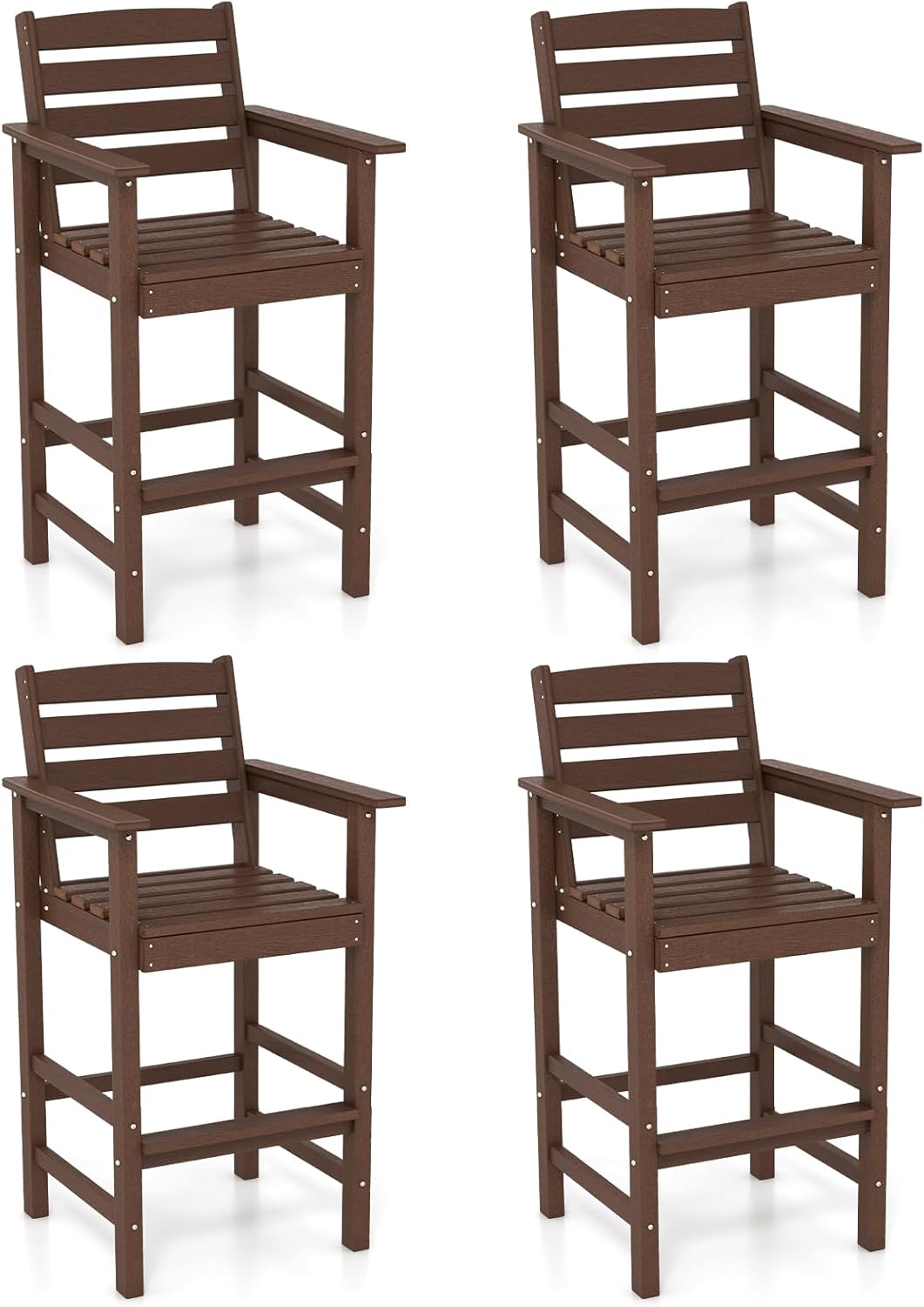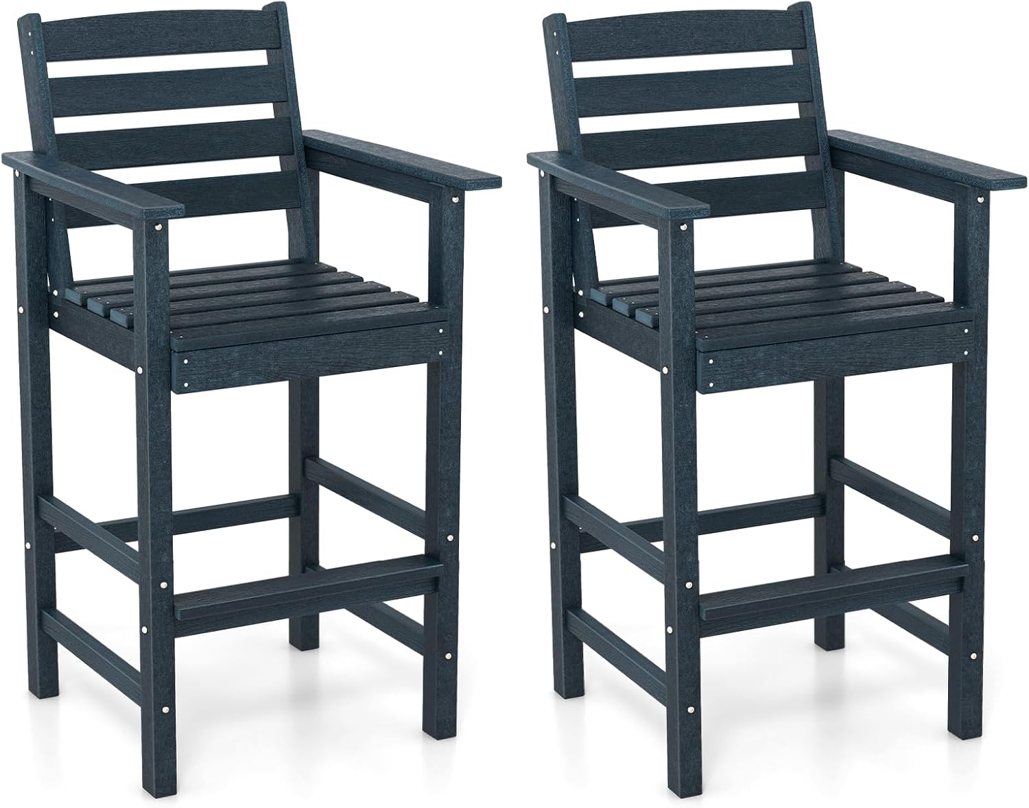 Description:Transform your outdoor space with our premium set of 2 HDPE bar stools! Crafted for outdoor living enthusiasts, these high top patio chairs are made from high-quality HDPE material and feature rust-resistant stainless steel screws, ensuring daily use without fading or damage. Designed for comfort and style, they boast Adirondack-style backrests, wide armrests, and footrests for optimal relaxation. The faux wood grain finish adds a touch of nature to any environment, making them a versatile choice for both home and public settings. Ideal for use with tables ranging from 39.5” to 45.5” high, these bar height chairs will elevate your outdoor seating area with both functionality and style. Upgrade your outdoor decor with these outdoor bar stools today!Features:Constructed from weatherproof HDPE materials Tilted backrest provides a classic look and comfortable reclineWide armrests and footrests offer enhanced supportIdeal for balcony, poolside, deck, yard, and other outdoor settingsRust-resistant stainless steel screws ensure durabilityFaux wood grain finish adds a touch of natural charmEasy maintenance with a quick wipe of a wet clothSuitable for 39.5” - 45.5” bar tables or pub countersAssembly required for setupSpecifications:Material: HDPE, Stainless SteelOverall Dimension: 25.5" x 24" x 46" (D x W x H)Seat Height: 29"Footrest Height: 12"Weight Capacity: 330 lbsSuitable Table Height: 39.5"-45.5"Total Net Weight: 72 lbsPackage Includes:2 x Patio Bar Stools1 x User Guide