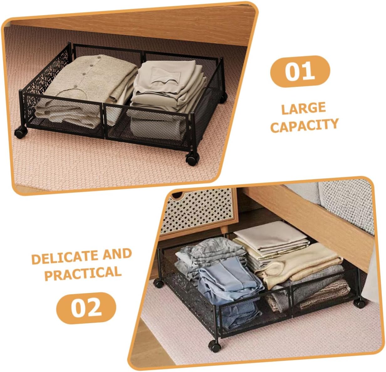 Package Include 1 x under bed storage Characteristics -Material:Stainless steel, plastic large under bed storage -Color:Black under bed storage containers -Size:62.60X42.30X15.80cm/24.60X16.62X6.21in storage under bed - The foldable design allows for easy storage when not in use, making it for small spaces under bed storage drawers. - The smooth-rolling wheels make it easy to move the storage rack around, even when it's fully loaded under bed storage containers with wheels. - Two of the wheels can be locked in place to keep the storage rack securely in place storage for small bedrooms. - The easy-to-install design requires no tools and can be set up in minutes under bed clothes storage. - The sturdy stainless steel construction ensures that this storage rack will last for years to come bedroom storage.Goods Descriptionunder bed storage It without being easily damaged.under bed storage cart This product is a under bed organizer, made of solid materials, and .under bed storage drawers The product is an excellent under bed organizer that can bring you more convenience, allowing you to have a more comfortable experience