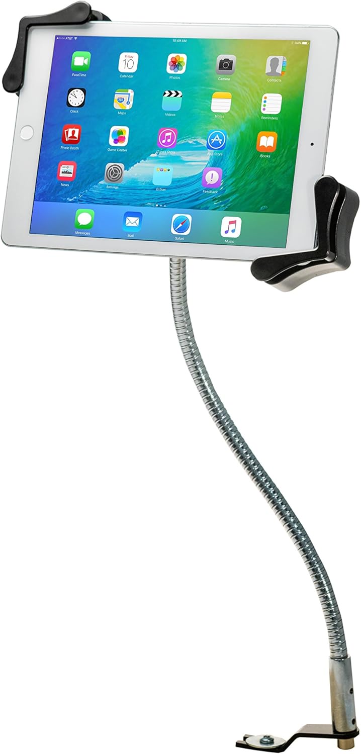 This flexible security mount safely displays your tablet at any angle in the front seat of your car, while also allowing handheld use. Simply press the release button at the rear of the tablet security holder to disconnect from the stand. In handheld mode, The holder remains tethered to any permanent fixture inside the car with an included steel security cable. Designed for use with commercial and passenger vehicles alike, this drill-free car mount installs easily to your vehicle’s seat rail. The flexible gooseneck can be repositioned to support your tablet at any angle while still providing enough rigidity to withstand stops, starts, and turns. The Slide-adjustable tablet holder tilts and rotates 360 degrees for portrait and landscape orientations. Features: mounts to your vehicle’s seat rail with No drilling required lock and key security protects tablet from theft quick release holder disconnects from gooseneck for handheld use holder stays tethered to car with included steel security cable flexible gooseneck can be repositioned for easy angle adjustment tablet holder tilts and rotates 360 degrees for portrait and landscape orientations unique corner-grip holder allows access to all ports, buttons and jacks perfect for passenger or commercial vehicles, like taxis, delivery trucks, emergency vehicles, and more Compatible with 7-14 inch tablets, including iPad Pro 12.9, iPad Mini, iPad Air, Surface Pro 4, Galaxy Tab S3, and more. *CTA Digital's security products are designed to protect your device from theft. Products are made with high-quality materials, like reinforced heavy aluminum slots, steel cables, and secure lock-and-key systems. Where CTA Digital makes every effort to protect against destruction of or loss of property. and cannot be responsible for any event that leads to the damage or theft of a device. Package Contents: (1) car mount (1) tablet holder (1) Security cable (2) holder keys (2) cable keys (1) Set of mounting hardware