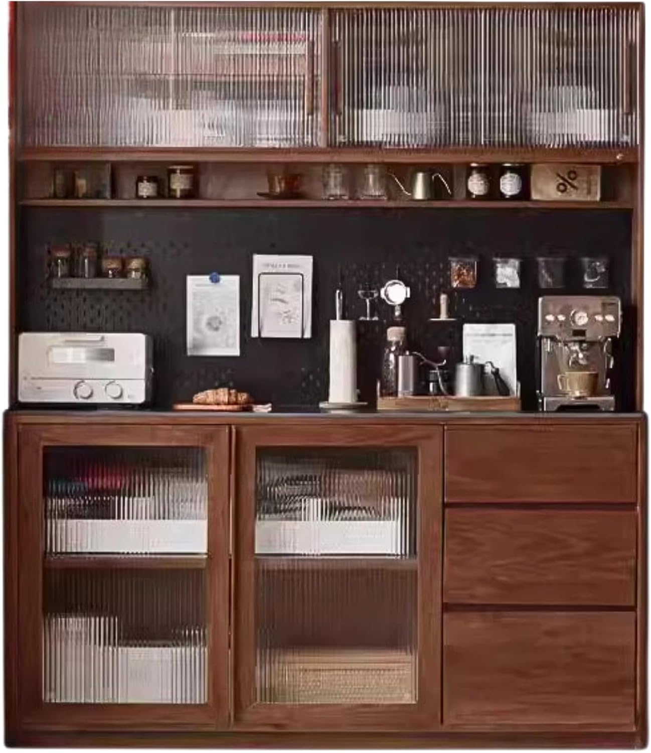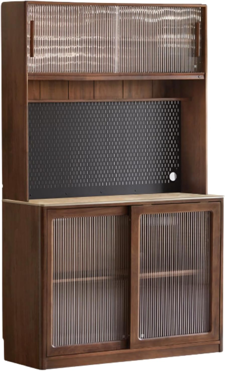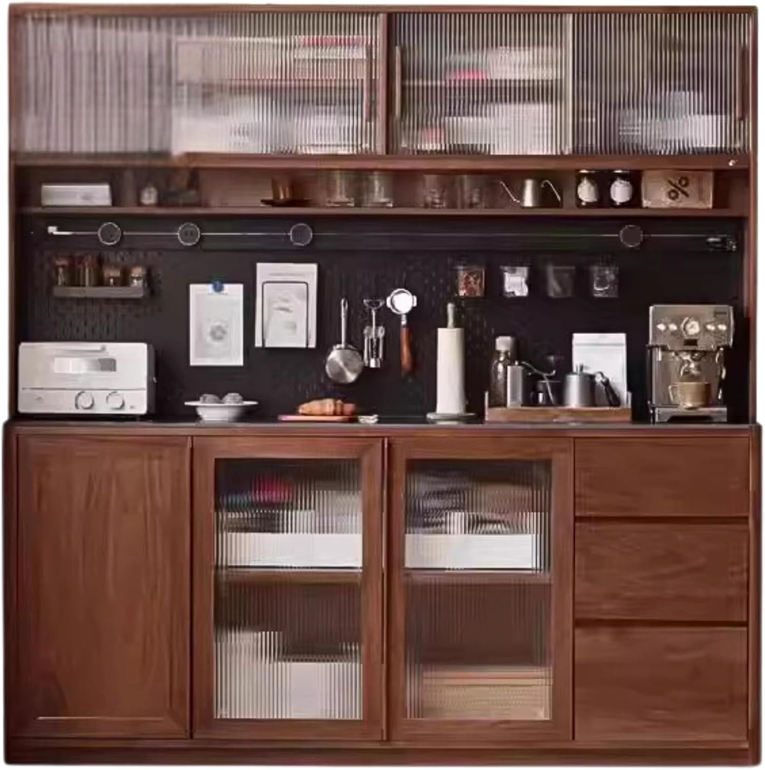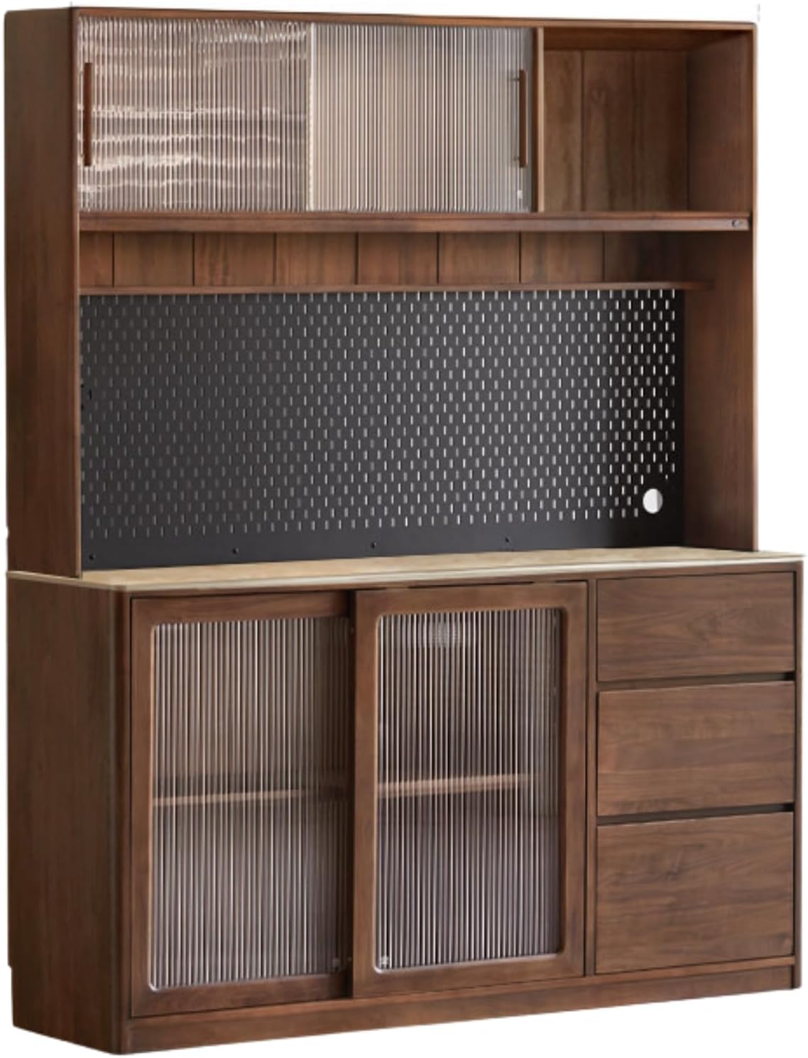 Closed display areaTouch sensor lightOpen storage area 2MBull power trackMetal hole boardWidened rock slab countertopThree draw classification storageThree-door painting cargo area 2M1. The entire product is made of 100% solid wood, without any artificial boards, veneers, or finger-jointed boards. It is genuine and of high quality.2. The main material is imported North American black walnut wood; it has rich and varied patterns, few knots, and no mold, making it a luxury wood.3. The auxiliary material is Okoume; it is used for the middle vertical panel, back panel, lower rear horizontal panel, and upper and lower seat panels. The wood grain is natural straight, without flaws, knots, scars, or marks. It feels delicate, smooth, and textured, similar to North American black walnut, so it is often used as a substitute.4. Ultra-clear fluted glass, pure black slab.The plant-based wood wax oil, applied by hand with two coats of base oil and one coat of top oil, preserves the texture and grain of black walnut wood to a greater extent, and is natural and environmentally friendly.