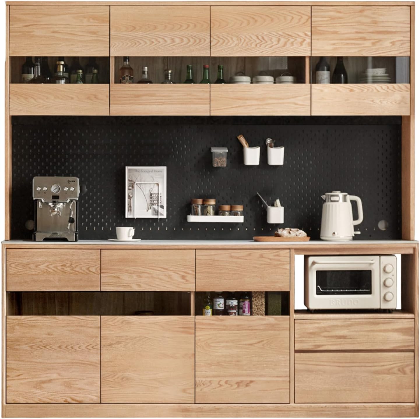 1. The entire product is made of 100% solid wood, without any artificial boards, veneers, or finger-jointed boards. It is genuine and of high quality.(1) The main material is imported FAS grade oak from North America, with beautiful grain, few knots, and no mold.(2) Auxiliary material: paulownia wood, used for drawer boxes and back panels. It is corrosion-resistant, wear-resistant, high-temperature resistant, does not deform, and is not easy to mold. It has been the material for bellows rods since ancient times and is also a famous ancient Chinese musical instrument wood.(3) The perforated board is black.Made of imported ash wood, which is tough and elastic with a neat and beautiful wood grain.The auxiliary materials are paulownia wood (back panel and drawer box).3. Other materials: Ultra-clear glass (cabinet doors), Bull electric track.Simple, natural, healthy, environmentally friendly, sturdy and durable.Uses Zhancheng odorless paint, open-pore spraying. It undergoes four coats and natural drying to better preserve the oak grain and texture, making it natural and environmentally friendly.