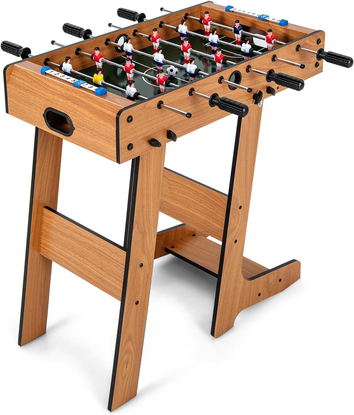 Description:Elevate your family game nights with our folding foosball table, designed to bring excitement and active fun to your home. This competition-sized soccer table is built for both children and adults, combining robust construction with a practical folding feature. Whether you’re hosting a gathering, enjoying a casual party, or relaxing at home, it provides hours of interactive fun. What’s more, its high-quality build features comfortable handles, realistic graphics, goals, and smooth ball launch and return holes for an authentic experience. In addition, it is perfect for families looking for a space-saving game table that ensures both fun and practicality.Features:Folding design for saving space in small rooms Anti-slip handles for comfortable and precise controlRealistic soccer field graphics for an immersive experienceBall launch holes and automatic ball return holes for quick replaysSturdy legs and reinforced crossbars for enhanced stabilityDual slide scorers for simple score trackingPerfect for home, game rooms, parties, and gatheringsFull accessories set included for endless funSpecifications:Color: Black/NaturalMaterials: MDF, PVC, Metal, ABS27 inch:Overall Dimensions: 27” x 14” x 28”Fold Up Dimension : 13" x 14" x 43" (L x W x H)Item weight: 13 lbs48 inch:Overall Dimensions: 48” x 24” x 32” (L x W x H)Folding Dimensions: 24” x 19” x 62” (L x W x H)Size of Tabletop: 41” x 23” (L x W)Net Weight: 43 lbsPackage Included:1 x Game Table2 x Balls1 x Instruction
