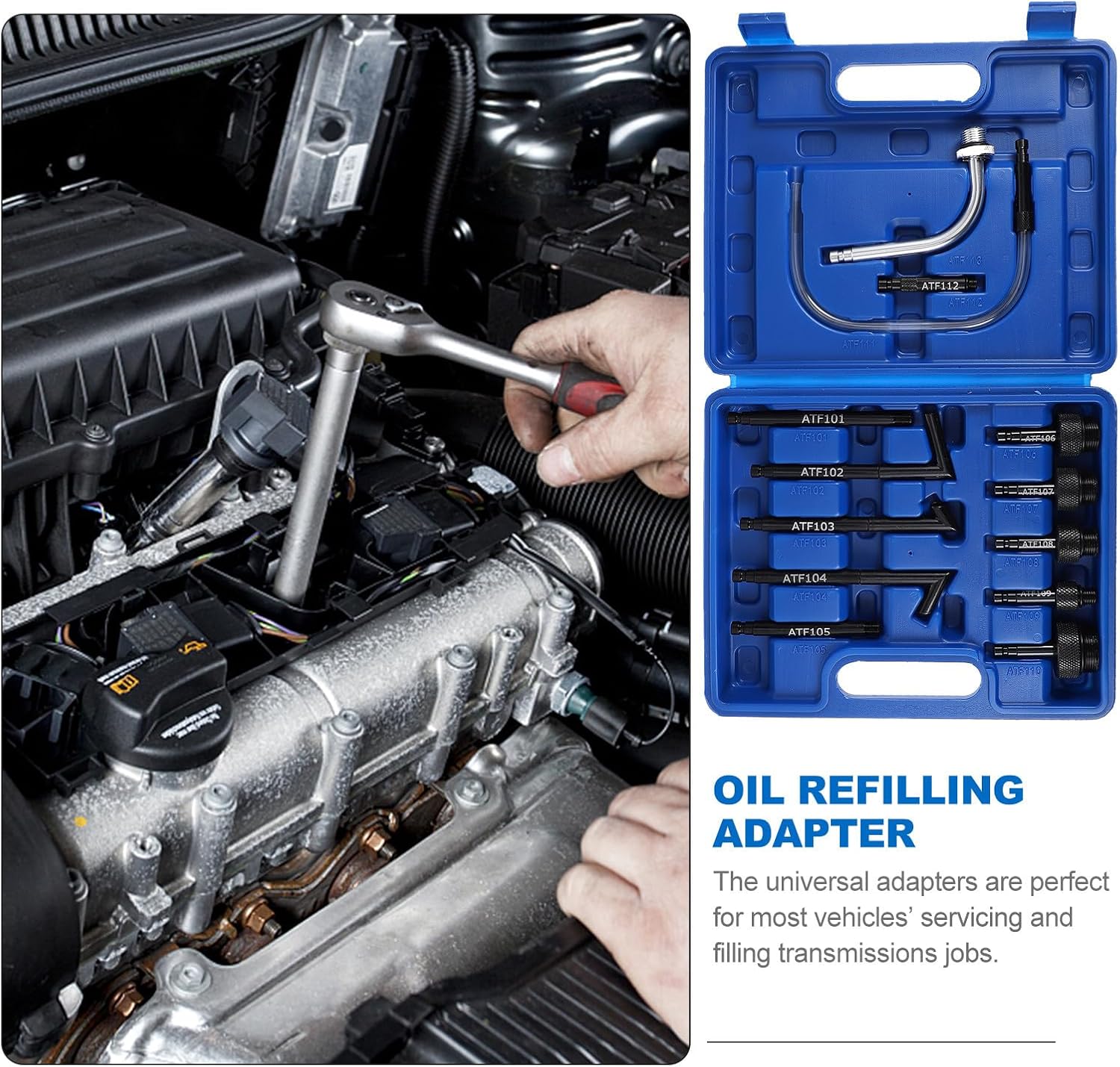 Package Include 1 set x oil fill adapters Characteristics - Material: Steel. - Color: As shown. - Size: 27.00X21.50X6.00cm/10.61X8.45X2.36 inch. -Product Info:Transmission oil replacement machine - It includes a variety of adapters to meet your needs and is convenient and practical transmission fluid adapter. - Equipped with a storage box, convenient for storage and transportation, it can be placed on the car, and also easy to carry Metal Transmission Fluid Adapter. - The surface is smooth, will not cause damage to the hand, wear-resistant, strong, and Steel Transmission Fluid Adapter. - It is made of steel material, and the surface is plated and treated to prevent static electricity. - The quantity is enough to meet your daily needs, ergonomically designed, and easy to grasp Steel Oil Fill Adapter.Goods DescriptionMetal Oil Refill Connector It will not break, the threaded interface is easy to seal and screw in, and it is suitable for most vehicle maintenance and filling operations.Oil Refilling Connector Tool It is also an gift for car enthusiasts.Metal Oil Fillers Adapter The joint of the dispenser is compact in size and takes up little space.transmission fill adapter kit High grade steel material, and wear-resistant, can be used many times.transmission fluid fill adapter kit It can be placed in the trunk of the car and is a must-have for self-driving tours