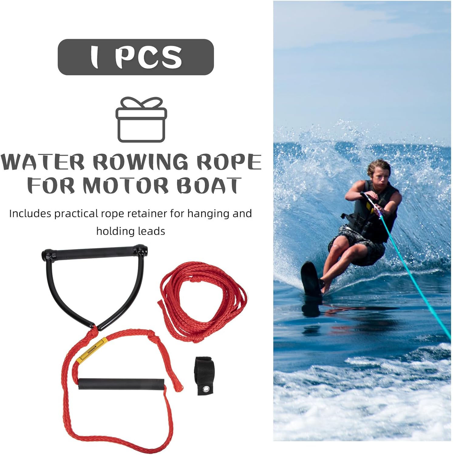 Package List 1 Ski Rope Characteristics -Product Info:Water skiing rope -Size: 730.00X1.50X1.50cm/286.89X0.59X0.59in kneeboard rope with handle -Color: As Shown water rope -Material: Polypropylene, Aluminum handle water rope -The wakeboard rope is designed with handle, comfortable and easy to hold, helping you to wear-resistant rope. -The rope is specially designed to be resistant to kinking and twisting, sturdy rope with high bearing force, perfect for water ski lovers to use for water sports wakeboarding lines. -Fine details with good material, you can to your water skiing lover friends, they will like it portable wakeboard rope. -High security and durability, the wakeboard rope is lightweight and compact, easy to carry and takes no much space for storage wakeboarding rope. -Manufactured from good material, durable for use, safe and secure for water games and sports portable rope.Goods Descriptiontubing rope Are you water skiing lover? Or want to have a try for water ski sports? Please look at our wakeboard rope for professional water skiing use! Heavy duty material for trustworthy using experience, strong tensile force makes it secure and safe for both professional and beginner's water skiing