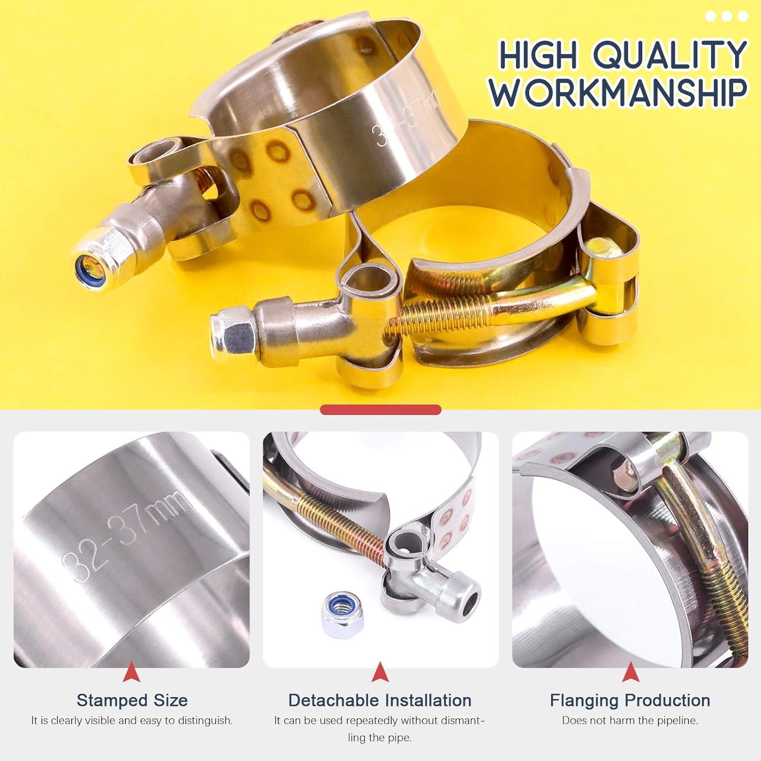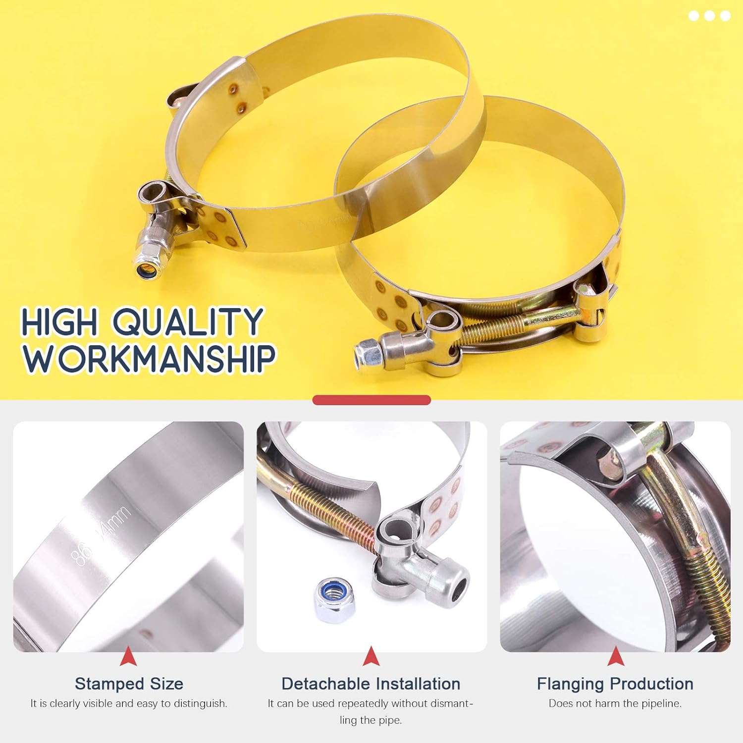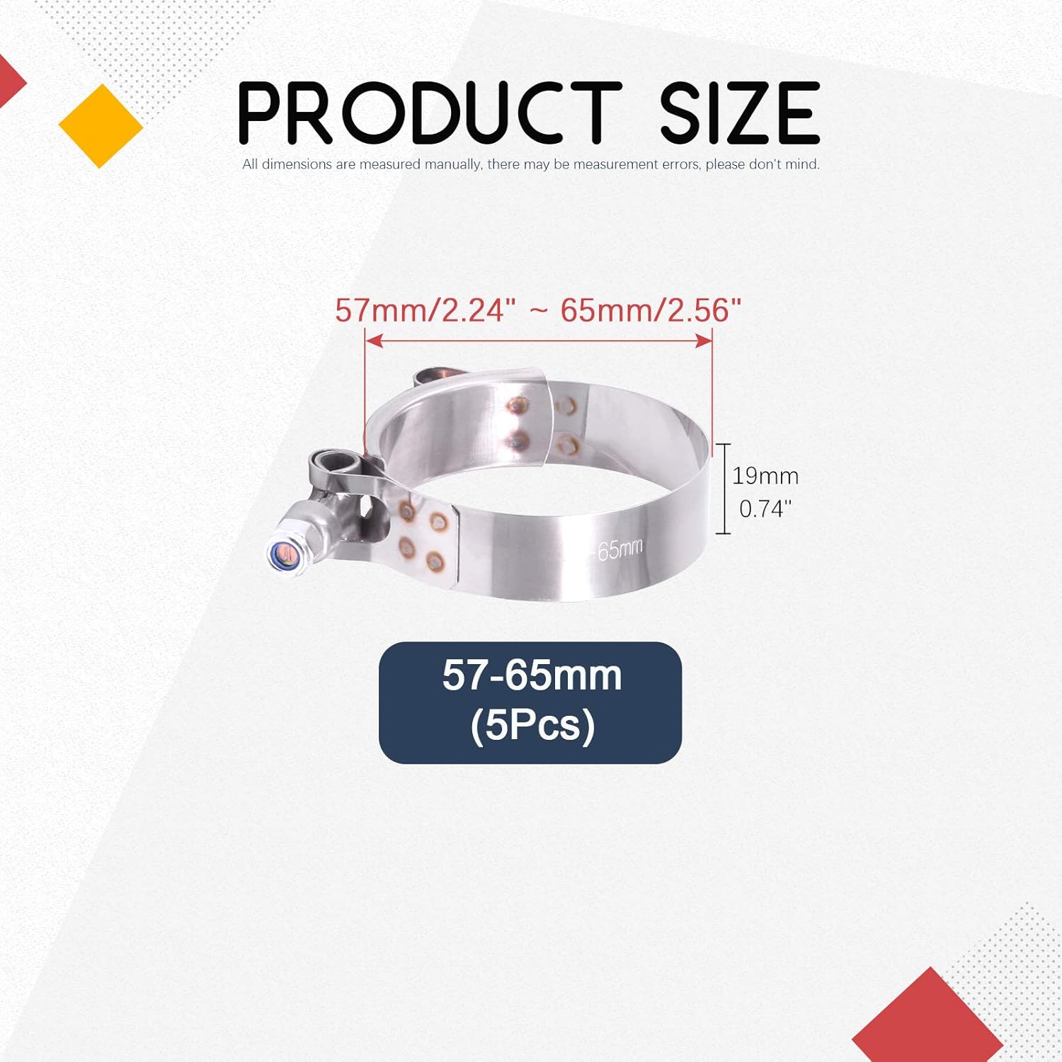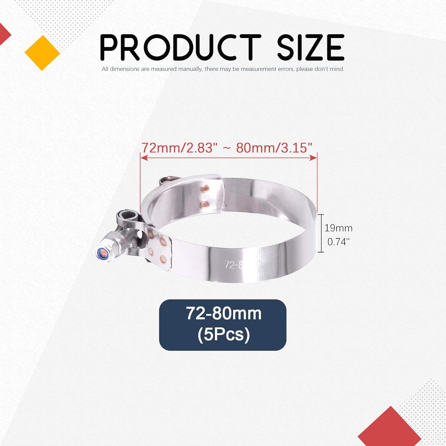 Hilitchi 5Pcs Stainless Steel T-Bolt Clamps with Rounded Band Edges Heavy Duty Turbo Intake Intercooler Clamp (63-71MM) for 2 1/4 Inch FEATURES: Focusing on quality and with fine buffing Smooth surface without burr Good tightening effect, durable, no rust, corrosion resistance Smooth and no uneven marks Complete model Removable installation and reusable Specification Product Type: T-Bolt hose clamp Material: Stainless steel Size: 63-71mm Number of items: 5Pcs
