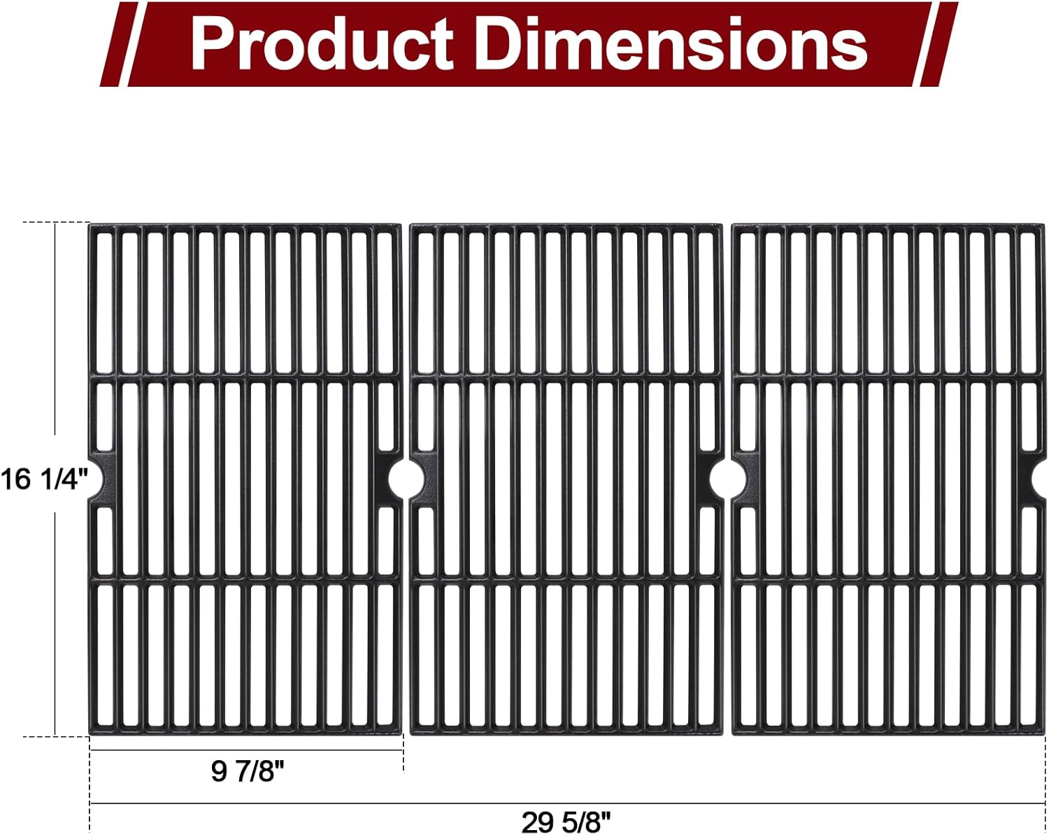 【Specification】 【Compatible Models】 For Dyna Glo Gas Grills DGF510SBP, DGF510SSP, DGF510SSP-D For Backyard Gas Grills by13-101-001-13, BY14-101-001-04, BY15-101-001-02, GBC1460W, GBC1461W, GBC1355W-C, GBC1462W-C, GBC1555W-C For BHG Gas Grills BH13-101-099-01, BH15-101-099-02, BH14-101-099-01, GBC1562W, GBC1362W 【Product packaging】 3 x Grill Grate, Dimension: 16 1/4'' x 9 7/8" each, 16 1/4'' x 29 5/8" for total 5 x Stainless steel Heat Plate, Dimension: 15" x 3 13/16" 1 x Grease Tray, Grease Tray Dimension: Width 15 1/2", Adjustable width between 24" and 30" 1 x Catch Pan, Catch Pan Dimension: 7 13/16'' x 5 3/4'' 1 x Middle-sheet 2 x Side-sheet 1 x Grease Cup 2 x Brackets 4 x M5 Flat Bolts 8 x M5 Round Bolts 12 x M5 Flange Nuts 【Product Features】 High-temperature resistant Durable and long-lasting Does not rust easily Easy to install Easy to clean