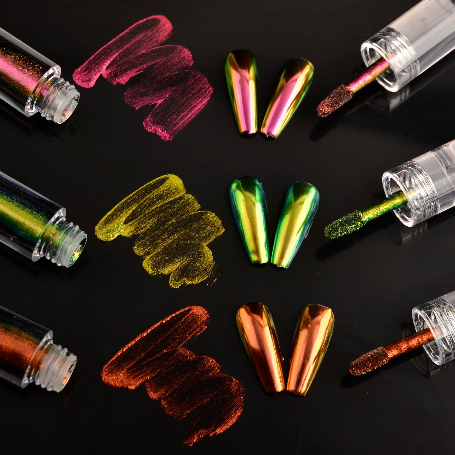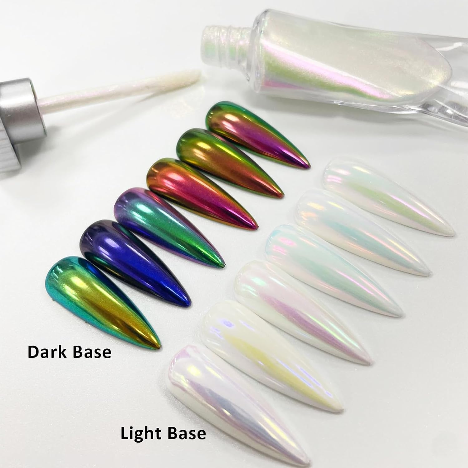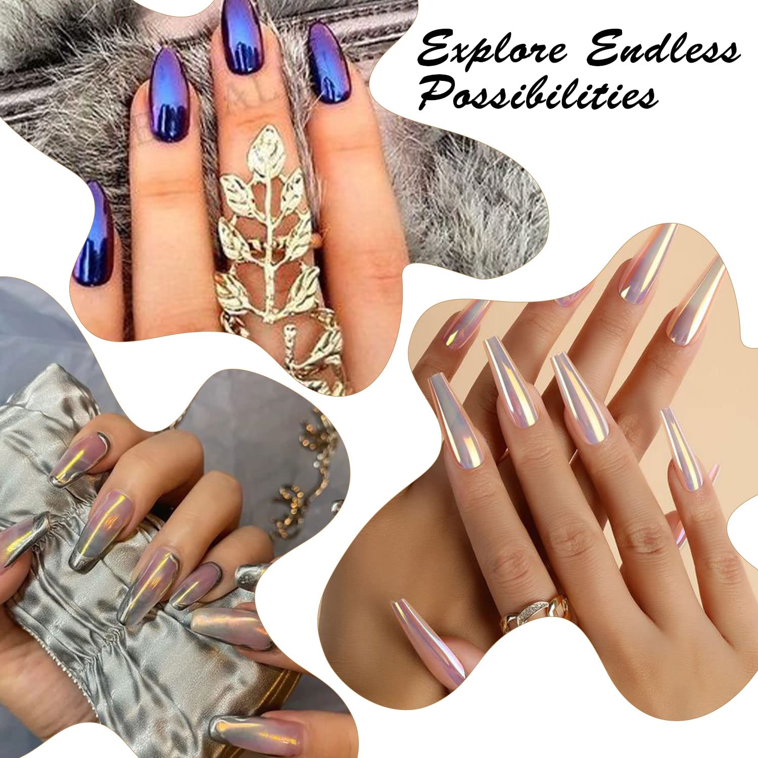 SPECIFICATION Product Name: Holographic Chrome Nail Powder Set Material: Powder & Silicone Quantity: 9 Jars Color: 9 Different Colors Effect: Metallic Mirror Effect, Chameleon Chrome Effect, Aurora Effect Package Weight: 72g / 2.54 ounces Package Size: 3.94*3.07*0.79 inch Package Include: 9 X Holographic Chrome Nail Powder with Silicone Nail BrushFEATURE PACKAGE -- 9 jars newly upgraded chrome nail powder set with 9 silicone nail brush. With the silicone brush head and powder in one piece, there is no need to worry about the powder flying everywhere. QUALITY -- Superfine metallic mirror nail powder made of 100% pure synthetic resin powder, harmless, long-lasting. Smooth and non-grainy texture. MULTI-CHROME EFFECT -- You can get aurora mermaid effect when you apply over the light color base gel; you can get chameleon chrome effect when you apply over black/dark base gel. Different polish will give different actual effects. EASY TO USE -- Apply base coat and top coat before the chrome powder is a must! No special nail art skill needed,ideal nail art set for any starter and professional nail manicure. WIDE APPLICATION -- WEILUSI Holographic Chrome Nail Powder is suitable to be applied on UV gel nails, acrylic nails, natural nails, etc, a helpful DIY tool for nail art design. Silicone Nail Brush smooth surface and flexibility make it easy to create various DIY nail art.