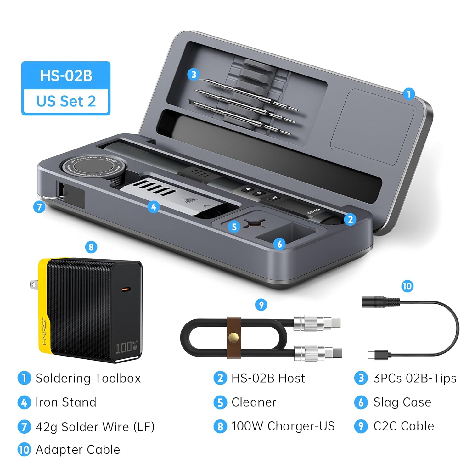 HS-02 is a portable screen display intelligent soldering iron launched by our company. 1. HS02 Soldering Iron: We upgraded HS01, HS02 has a better grip, shorter tip, larger 0.96'' display, and faster heating speed.It is suitable for electronic component repair, jewellery repair, circuit board soldering, micro soldering 2. 100 W High Power & 2 S Tinning: The power of the soldering station is higher than the 65 W on the market. It can achieve fast heating for soldering. The temperature is adjustable within the range of 212-842 °F. It automatically adjusts to the power output 3. Portable and Lightweight: We provide a storage case for the soldering pen, which will make it easier for you to carry it outside.Its ergonomics are ensures greater results and comfort 4. 3 Groups Pre-set Temp: Preset multiple groups of fixed temperature, fast temperature adjustment without time-consuming 5. Smart & Safe: features sleep, automatic power-off, child lock mode and other modes.Customize setting,set soldering iron parameters according to needs to meet daily usage 6. Extensive accessories: HS02B is equipped with 3 soldering iron tips (I, IS, K). The integrated design allows the soldering iron to heat up quickly and maintain a stable temperature. And the 100 W charging adapter allows you to use it immediately