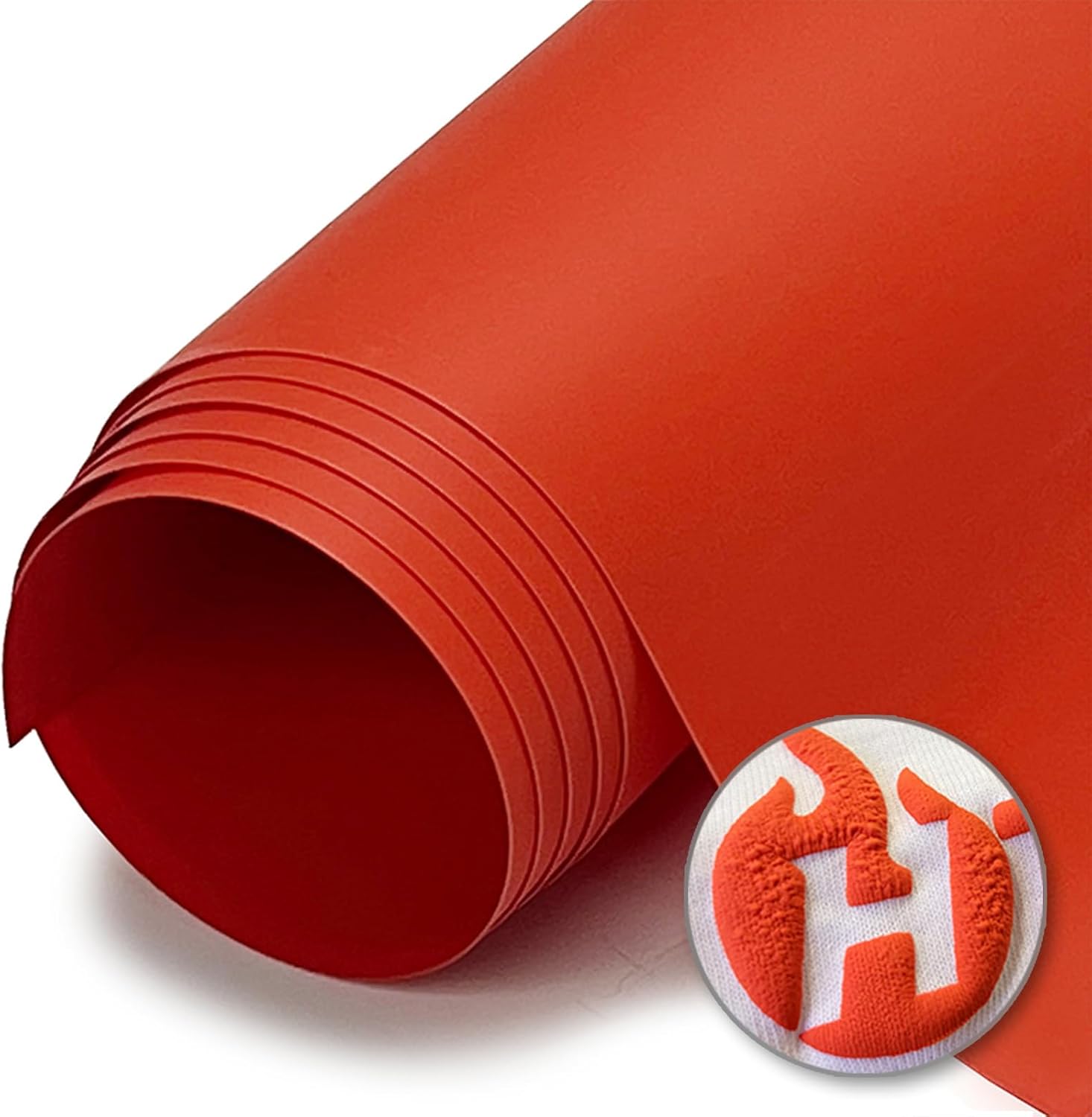 "HT-Puff Try our new HT-Puff Heat Transfer Vinyl for 3D soft puff look! Offering 23 color options, this vinyl puffs up after heat press on your garment. Be as creative as you can be with this fun, innovative vinyl! The puff vinyl will have your finished product with the ""puffed up"" appearance. It will produce a three-dimensional feel and touch to the print. When heat is applied, 3D puffs up to create a unique texture to letters and shapes. It can create an authentic look without using embroidery for the popular retro vintage look. It can be used for numbering uniforms such as baseball, soccer, or basketball or for a wide range of novelty or fashion shirts. Imagine creating special effects for a design with a snowman, clouds, or letters. *If the vinyl doesn't press smoothly down onto the flat surface it may result in some strange wrinkles and indentations. We recommend to test-press before starting your project. **Please consider that the black puff vinyl will turn into dark gray after puffed."