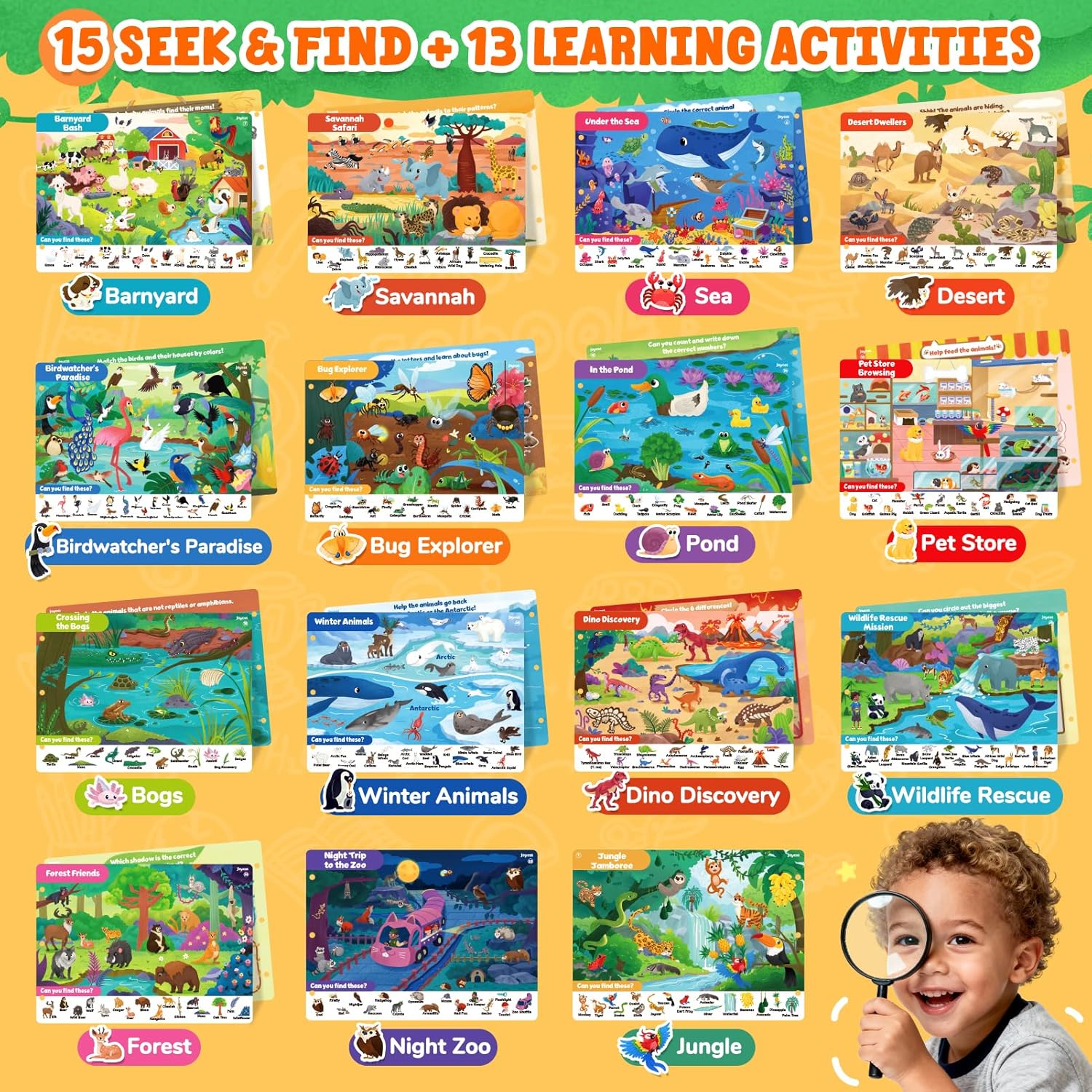 • What's in it: The JoyCat Seek & Find Game Books set includes: 1 reusable activity book (with 15 Seek & Find themes and 13 educational activity themes), 4 dry erase markers (2 black, 1 blue, 1 red), 1 dry erase cloth, and 1 convenient storage bag