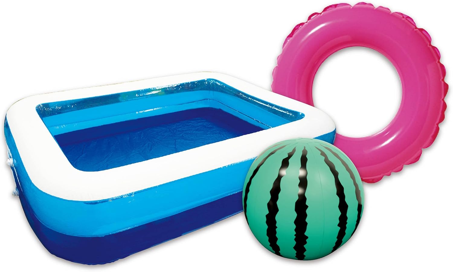 Comes with a convenient electric air pump. 1.5 meter jumbo family pool set It can be used as a square. Perfect Home Size! You can feel like a resort while you are at home. The 2 air chamber design provides a sense of stability and is extremely comfortable to use. The drain plug makes it easy to clean up with a 2 air chamber construction for improved stability. The 2-stage valve makes it easy to inflate and discharge the product. Pool: Main Unit Size (W x D x H): Approx. 59.1 x 39.4 x 16.5 inches (150 x 100 x 42 cm); Water Fill Size (W x D x H): Approx. 41.9 x 21.1 inches (104 x 54 x 42 cm); Size (W x D x H): Approx. 5.7 x 4.3 x 4.3 x 4 x 4.3 inches (1 x H 1 inches (1 x H 1 x H 11 x 111 x 11 x 11 x 11 x 11 x 111 cm). Box Size (W 1 x 1 x 11 x 1 x 11 x 1 x 11 cm). Material: ABS (body). PP (nozzle) Weight: Approx. 10.2 oz (290 g) (main unit), Approx. 12.2 oz (310 g) (total set), Approx. 13.6 oz (370 g) (included box), 3 types of nozzles x 1 set (0.3 inch (7 mm), 0.1 inch (18 mm) nozzles); Power supply) Estimated inflation required); Recommended for inflation: Household vinyl pool. More than 10 minutes. Do not use continuously. 2-way air pump that can be inflated and deflated. Easily inflate large swim rings, pools, floats and boats. Battery operated, so it can be used in places where there is no power source such as an AC outlet or DC cigarette lighter socket. Convenient air pump for going out to the beach or pool.