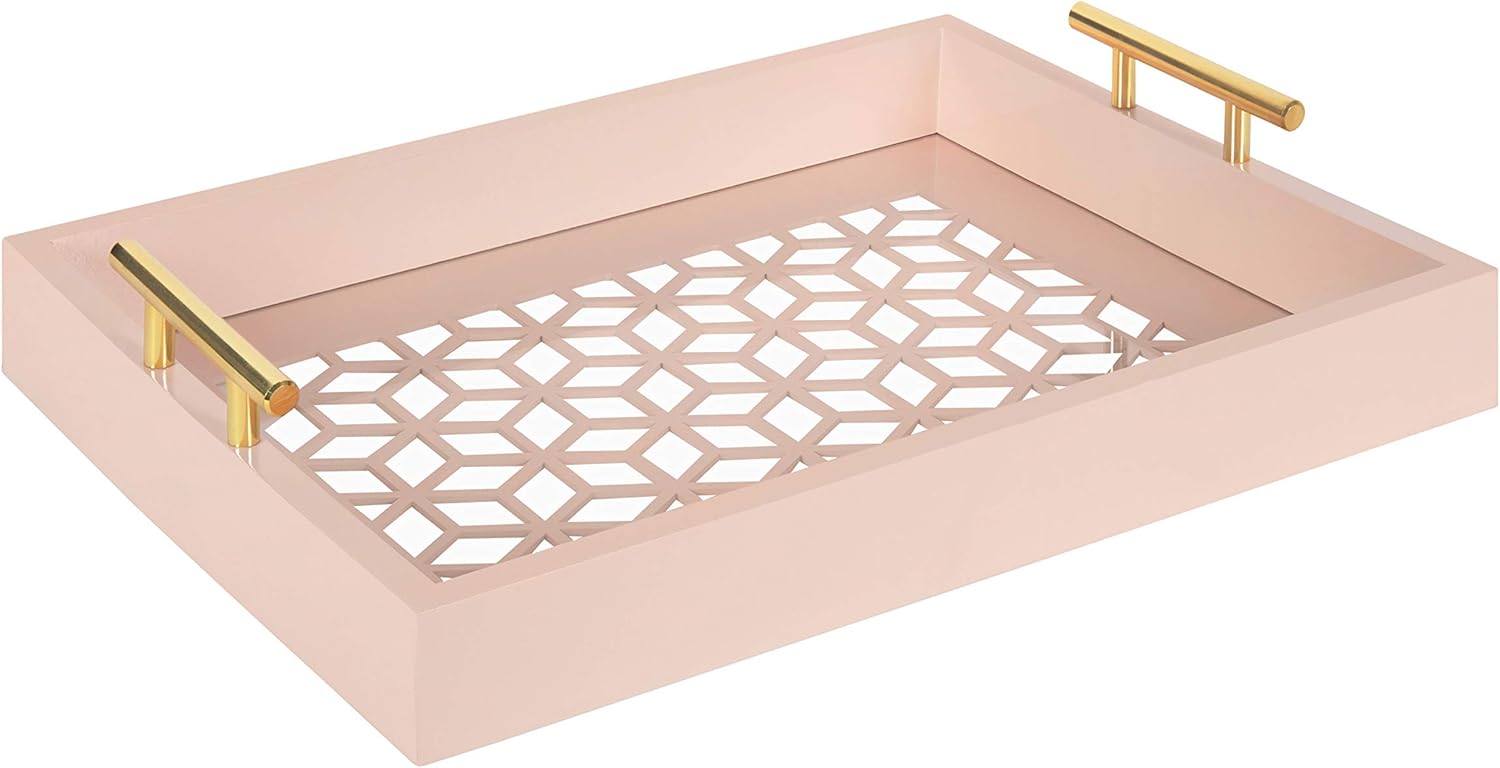 Bring contemporary glam style into your home with this sweet cut-out pattern accent tray with silver metal handles. Place this narrow rectangle tray on your entrance console table as a trinket tray to hold your keys and change as you come and go. This tray can also be used as a decorative accent on an ottoman to hold your beverages or on your vanity for makeup organization. Constructed of glass and sturdy wooden material with a glossy finish and polished silver metal handles, this tray is dependable to carry your cocktails from room to room! An update to the classic accent tray, the base has a geometric pattern cut out under glass. The tray has pads on the bottom to protect surfaces. The tray measures 10 inches wide by 24 inches deep. From a dining room table to a living room ottoman, this geometric tray brings tremendous versatility anywhere throughout your home. Its charming size makes it great for serving snacks on little plates or as a decorative display option. Bring a chic and glamorous decorative accent into your home with this dazzling tray.
