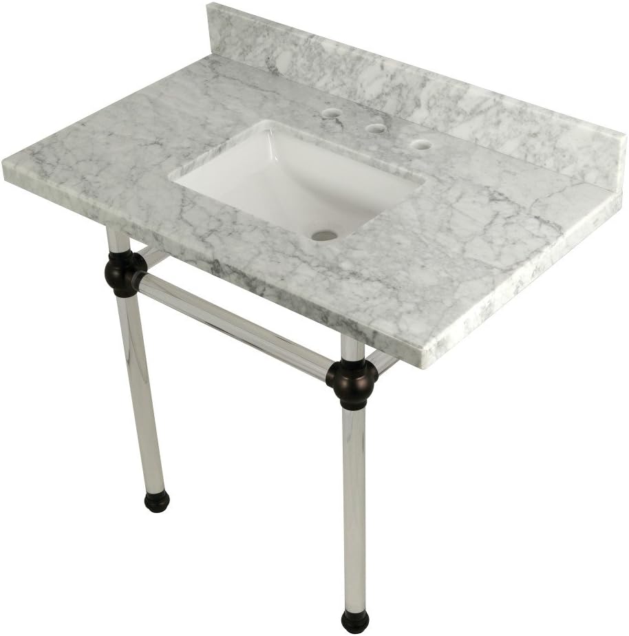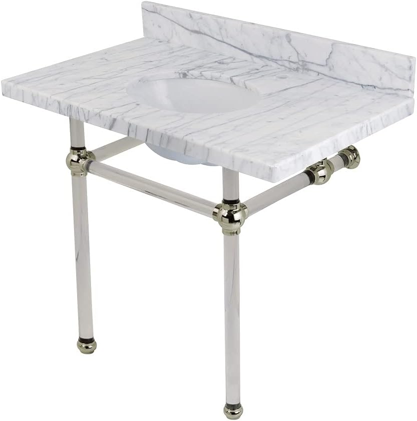 With a beautiful Carrara marble counter top, this console sink set is a long lasting, durable, and elegant addition to your bathroom. A fabulous alternative where space is limited or tight, making them friendly for the whole family. With different shades and natural designs, otherwise known as veining, no two sinks will be alike. Also for your convenience, anti-slip rubber pads are included with the acrylic legs to ensure steadiness. Water supply kit, drain assembly, and the faucet are sold separately. Kingston's carrara marble tops are polished, but they are not sealed. Polished marble has a shiny surface and resists stains. Natural stone, even when polished, is still somewhat porous and does remain susceptible to etching by acidic compounds like fruit juice, vinegar, some cleaning solvents, etc. For customers that wish to further protect their investment the granite can be sealed. The following is intended solely for informational purposes. Kingston does not warranty nor accept liability for damages or other negative outcomes resulting from any treatment or coating applied to the countertop after purchase, whether applied by the customer or by a third party. For anyone unfamiliar with this nature of project, Kingston recommends consulting an experienced professional in your area. When looking for a sealant product, please be sure to seek a product specifically designed for use on polished granite surfaces. Be sure to always avoid anything containing a citrus ingredient, acid ingredient, tung oil, linseed oil, or other natural oils. These can damage or discolor your granite.