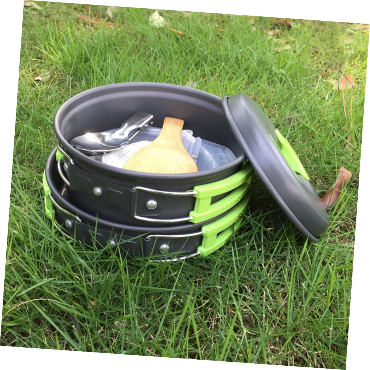 Package List 1 x Pot 1 x Frying pan 2 x Bowl 1 x Shovel 1 x Plastic spoon Features - Bowl: diameter 11CM/4.33inch; height 4CM/1.57inch Camping Frying Pan. - Size: Pot: diameter 14.5CM/5.71inch; height 7CM/2.76inch Outdoor Pots. - Shovel: 12 x 5cm/4.72 x 1.97inch Camping Cookware. - Material: Aluminum alloy Camping Accessories. - Color: Assorted Color Outdoor Cooking Equipments. - Frying pan: diameter 15CM/5.9inch; height 3.5CM/1.38inch, handle 10cm/3.94inch Folding Tableware. - Plastic spoon: long 16cm/ 6.3inch, diameter 7.8cm/3.07inch, deep 2cm/0.79inch Nonstick Pots. - The non-sticky and collapsible design gives you great convenience Camping Supplies. - The anti-skid design of the handle can provide a firm and comfortable grip for your hand Camping Pot. - Made of material, to use, using Portable Cutlery. - It's easy to clean, using these, it can give you a wonderful camping experience Outdoor Cooker. - Perfect for picnic, camping, hiking or activities Camping Cooking Utensils.Goods InformationFolding Tableware It is the for you.Camping Cookware A complete and cookware for camping, hiking, backpacking, picnic, lightweight and portable.Camping Cooking Utensils want to have a set of camping cookware? Then, our camping cookware set is carefully prepared for you