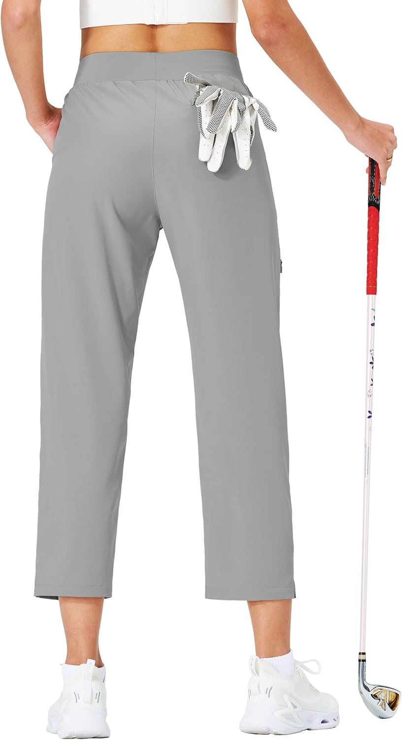 Ksmien Women's 7/8 Length High Waisted Golf Pants with Four Pockets 7/8 Length: The ankle pants give you a energetic and stylish look during work or exercise. High Waisted Design: High waistband give you a tummy control to flatter your shape. The stretchy ankle pants have a elastic design with custom fit, allowing full range of movement for golfing. 4 Functional Pockets: 2 deep hand pockets are deep enough to store your essentials. One leg zippered pocket can store cards or phone. One back zip pocket to hold golf gloves. Split Hem Design: Split hem design makes you more stylish and charming. 4-Way Stretch & UPF 50+: The fabric is soft, breathable and stretchy to keep you comfy. This waterproof golf pant has sun protection, making you stay cool and dry. Scenarios: Perfect for golfing, hiking, business, travel, walking, lounge and casual wear.