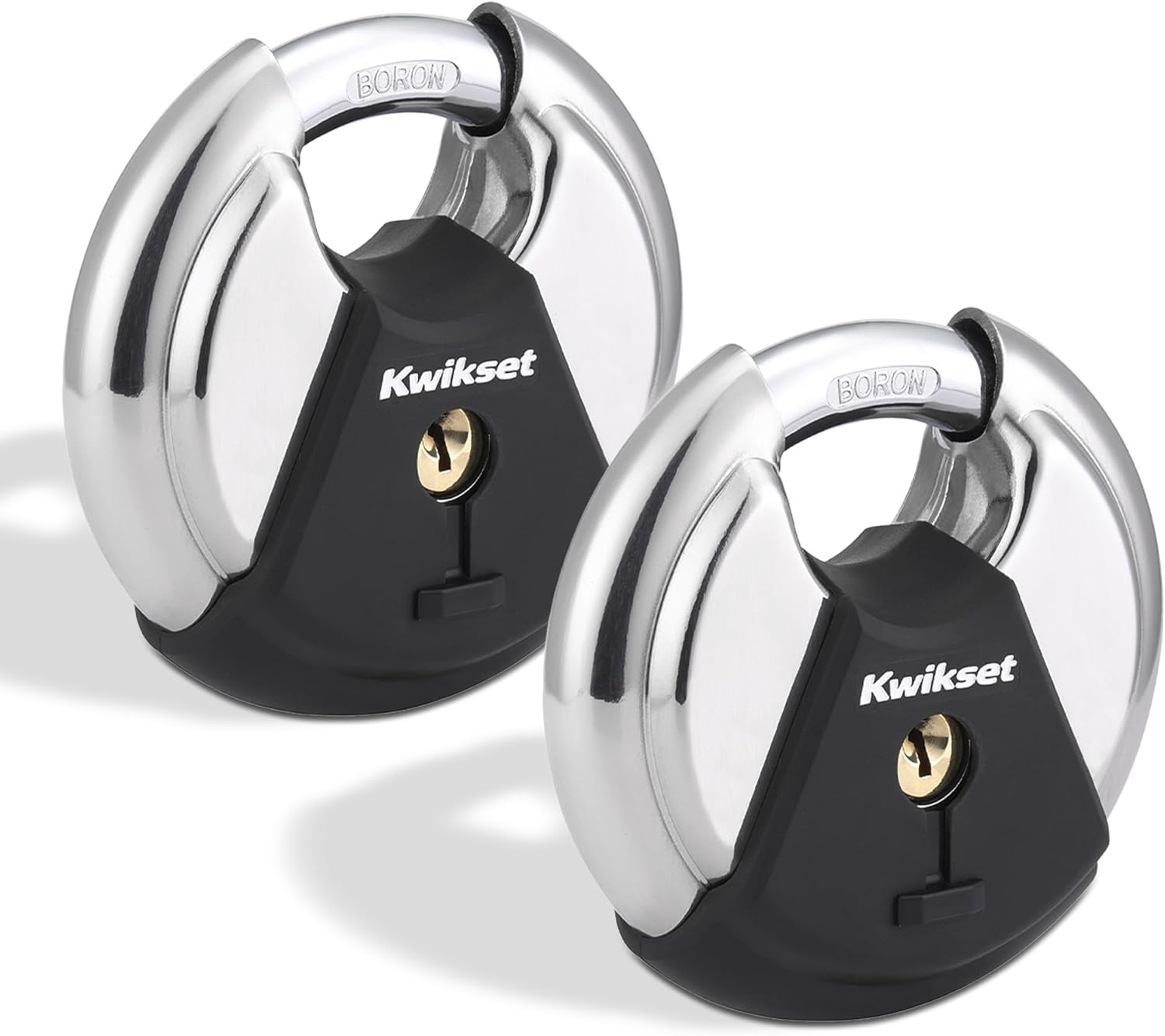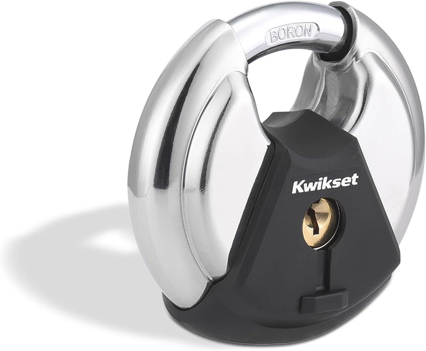 The Kwikset Discus Padlock delivers high-security protection in a fully shrouded stainless steel design built for demanding outdoor environments. The polished stainless steel body resists corrosion and wipes clean fast, while a fully shrouded shackle eliminates exposed metal to minimize bolt-cutter access points. A premium boron-carbide shackle provides maximum cut and saw resistance, and a covered keyway keeps moisture and debris out for reliable outdoor performance. Ideal for storage units, roll-up doors, gates, and trailers, backed by a Limited Lifetime Warranty.