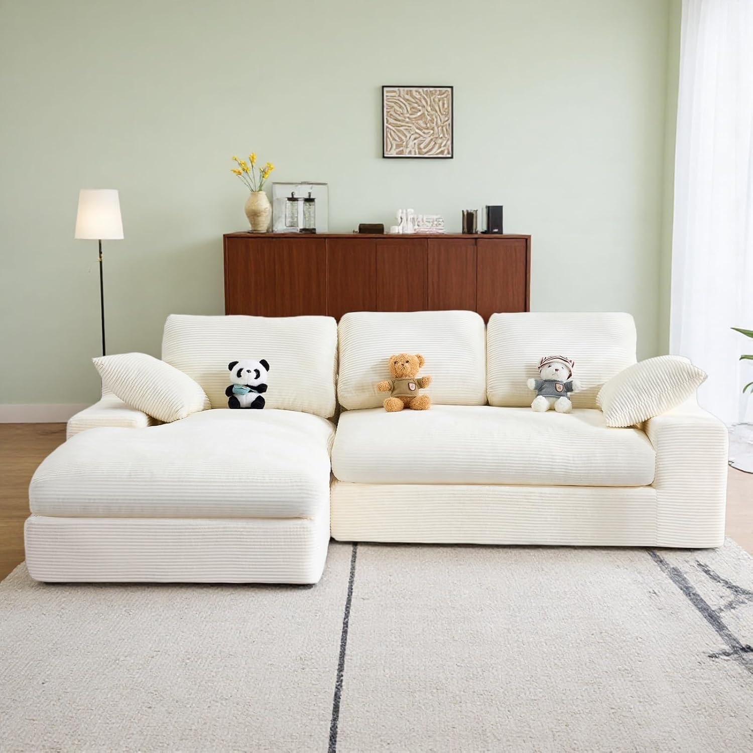 Trygoal L Shaped Compression Sofa, Modular Couch with Curved Armrests & 4 Coordinating Pillows, Modern 101'' Chenille 4 Seater Sofa with Wide Seat for Living Room, Bedroom, No Assembly, Beige