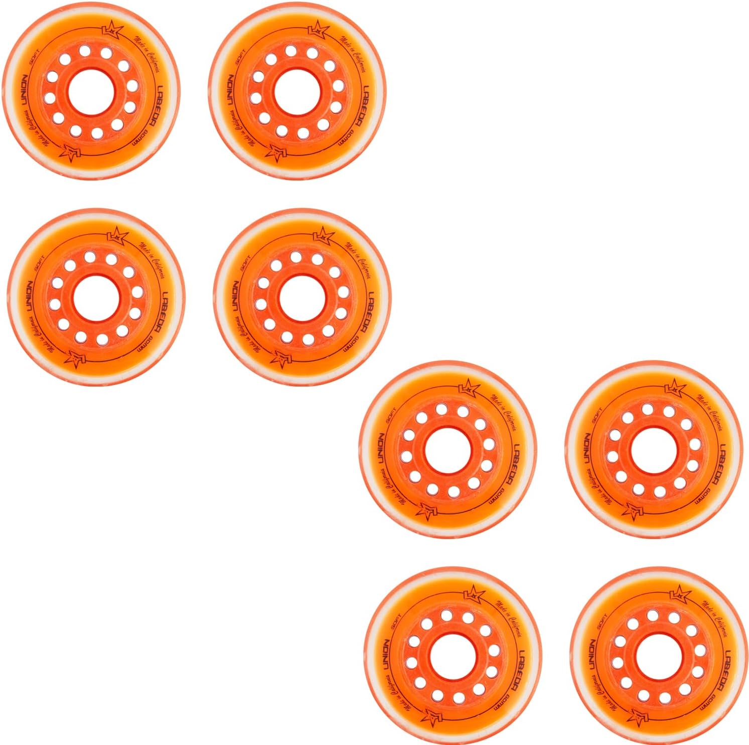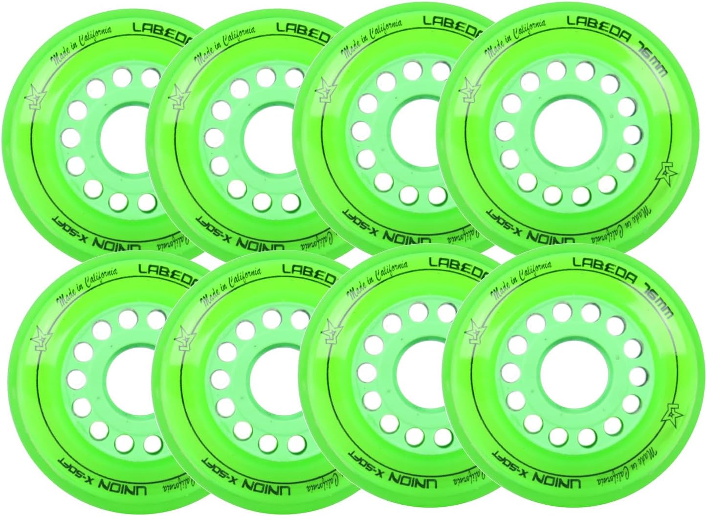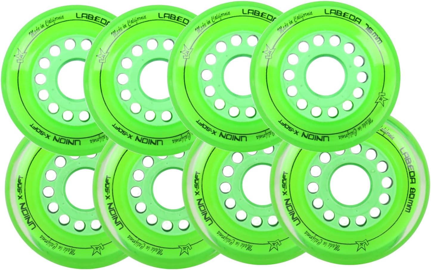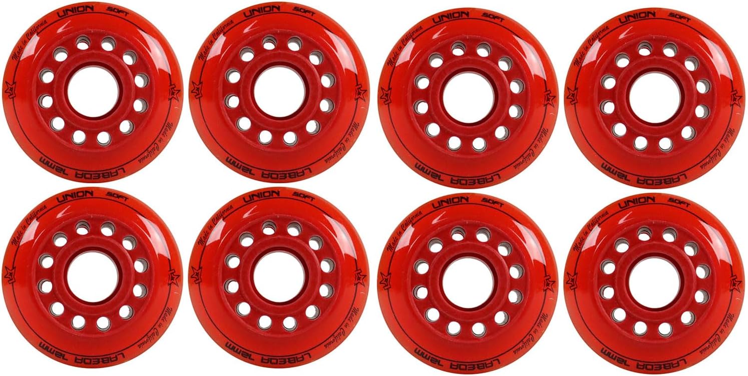Includes an 8-Pack of Labeda Union premium performance roller hockey wheels.The Labeda Union Wheel showcases an all-new inner core and inner ring that make it the fastest wheel Labeda has ever made. The rigid Revolver core delivers blazing speed and agility by maximizing energy transfer through each and every stride. This works with the new Apex ring that initiates wheel flex and compression earlier than past wheels, thus allowing for even quicker stops and better overall braking power.Ideal Playing Surface: Sport Court, Hockey Tiles, Wood, Smooth Concrete. (Note: using using wheels on smooth concrete has less grip and will wear down quicker.)Features the Revolver Core which maintains a stiff, rigid base for premium top-end speed and quick agility. Also features the Apex Ring which Provides better responsiveness and control by initiating earlier wheel flex and compression points for immediate braking power.These wheels are built for premium performance. X-Soft 74A is ideal for a body weight of up to 175lbs, while Soft 76A is designed for body weight over 175lbs.