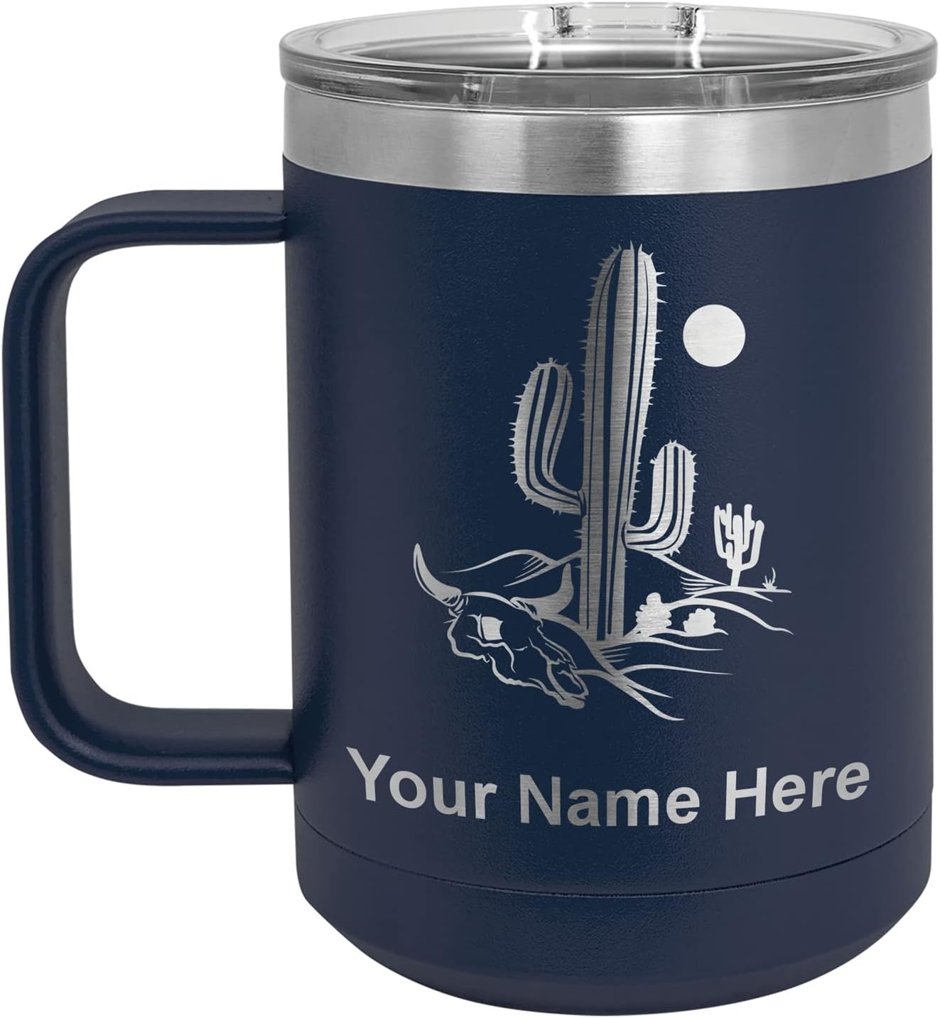 LaserGram 40 ounce Travel Mug with Handle that is laser engraved with the image that you see in the photo. Your own personalized text will be laser engraved below the image. Features double-walled stainless steel vacuum insulation with a clear lid. Click the "Customize Now" button to begin customizing your mug.