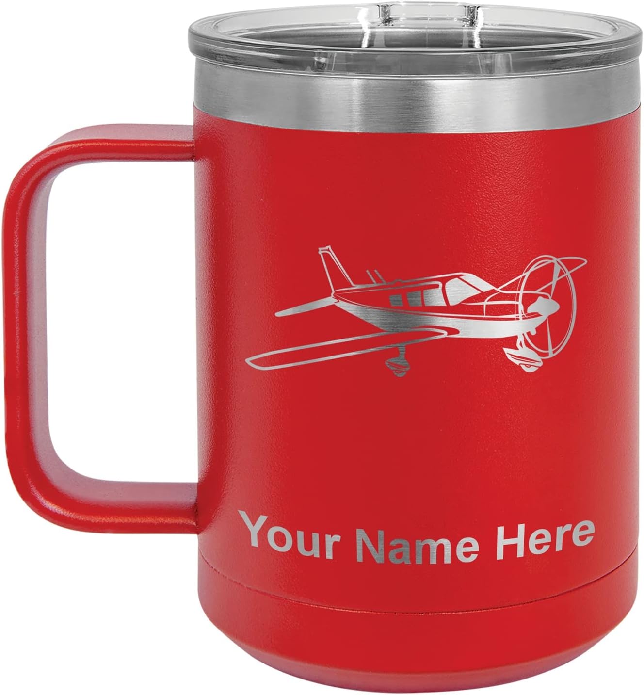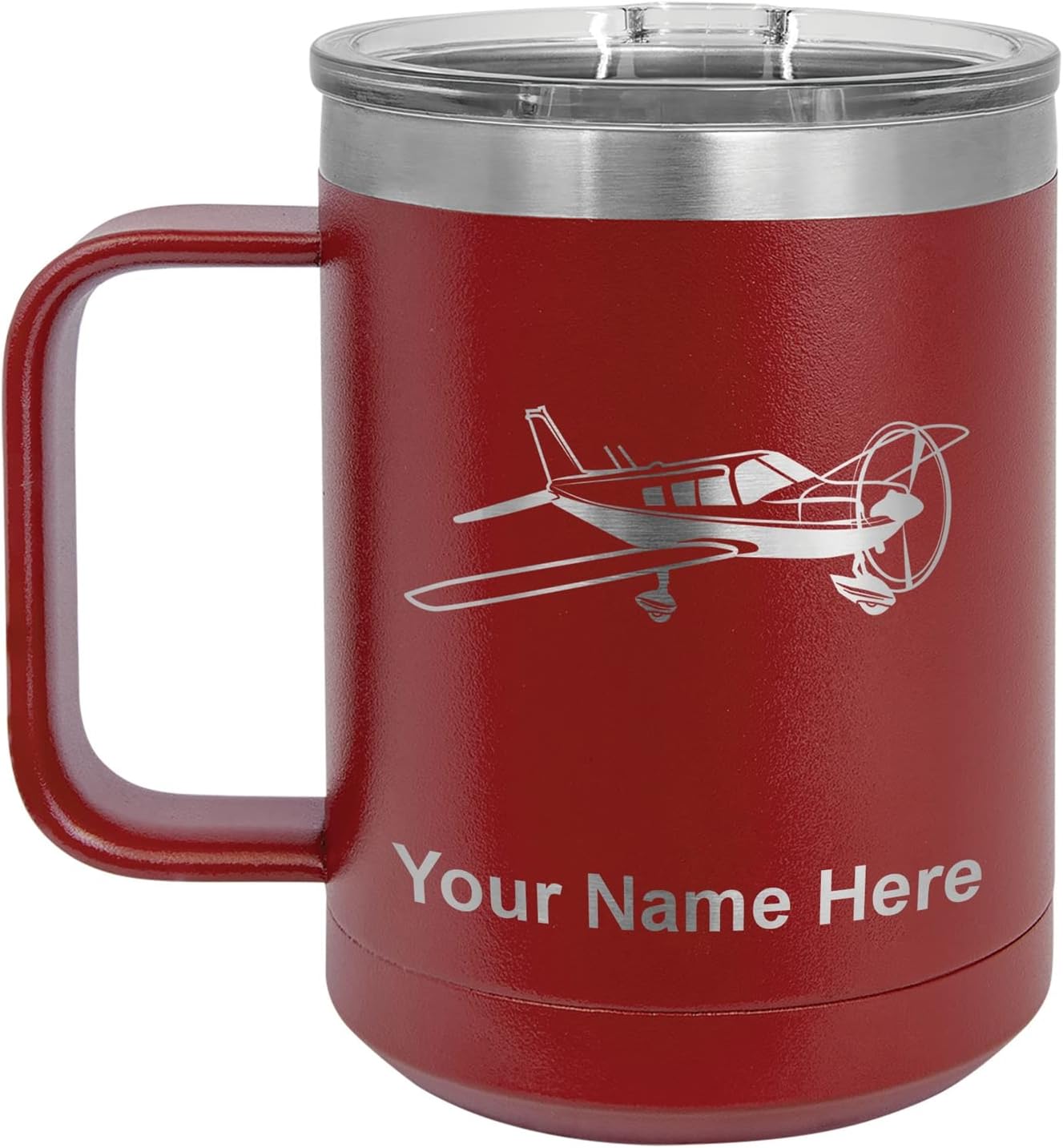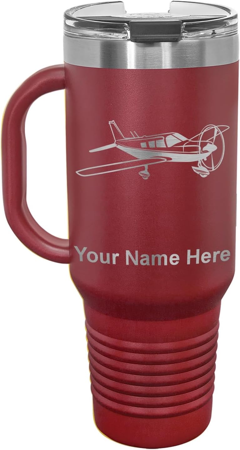LaserGram 40 ounce Travel Mug with Handle that is laser engraved with the image that you see in the photo. Your own personalized text will be laser engraved below the image. Features double-walled stainless steel vacuum insulation with a clear lid. Click the "Customize Now" button to begin customizing your mug.