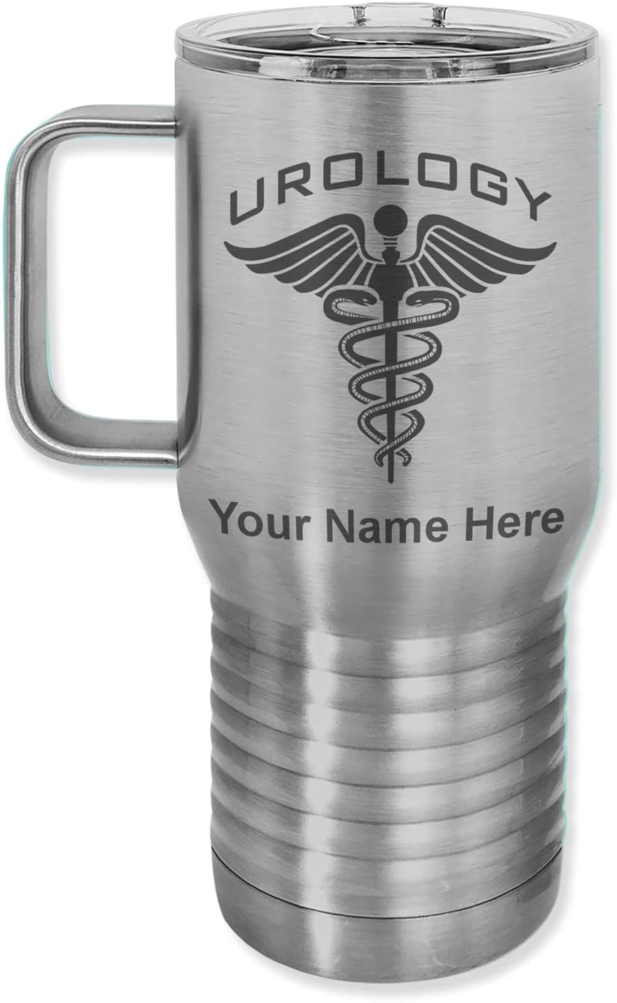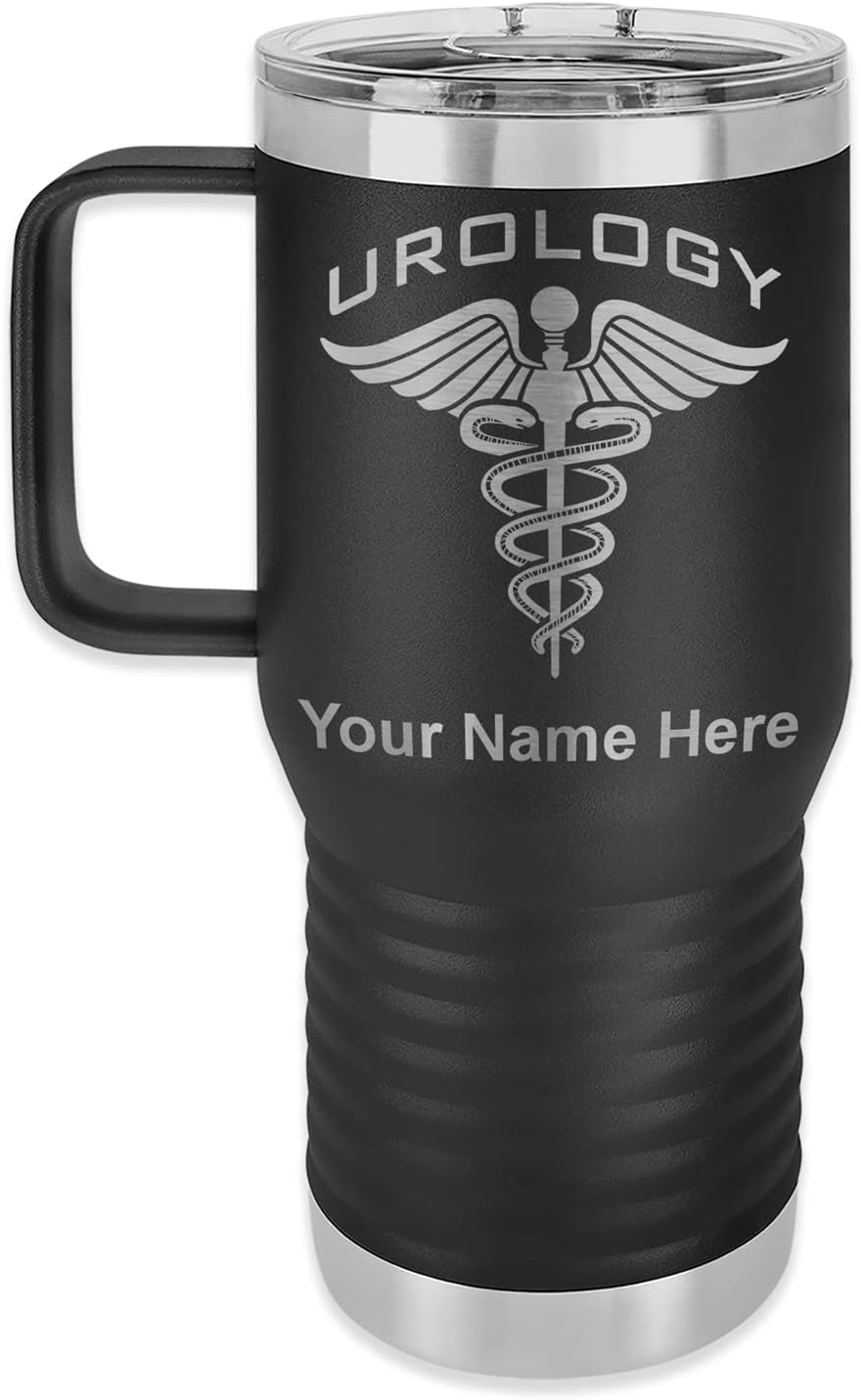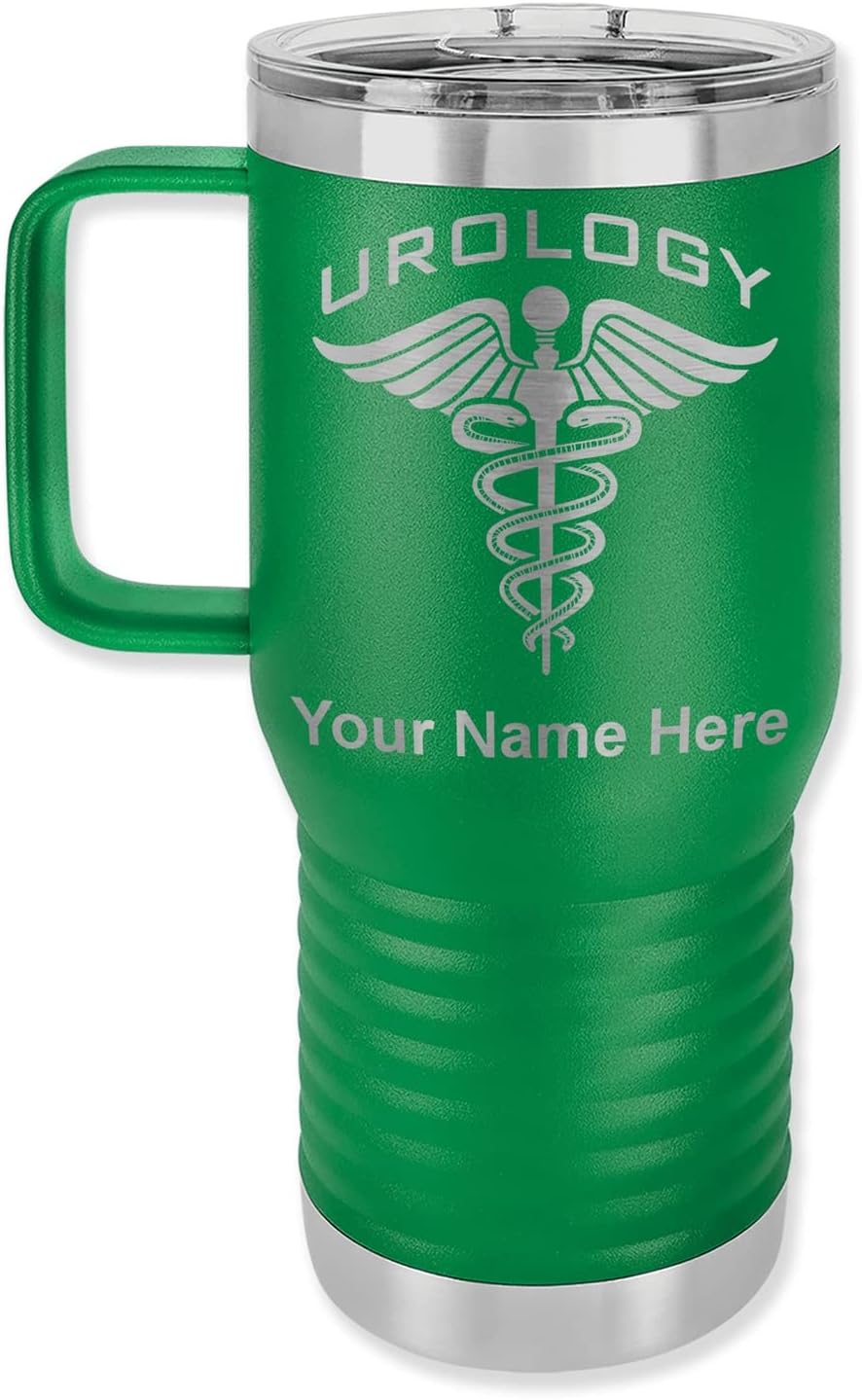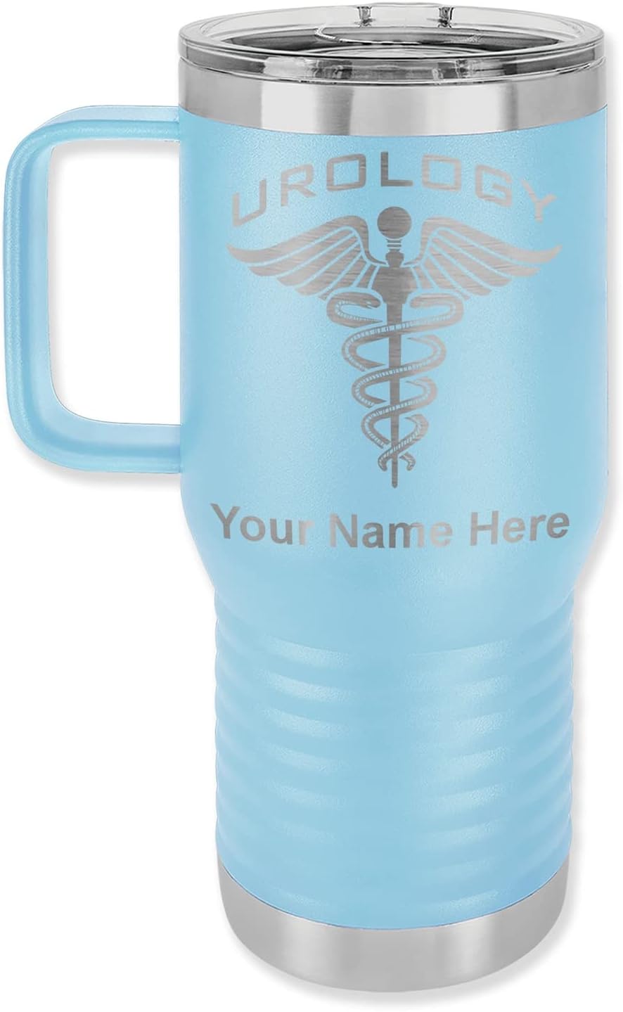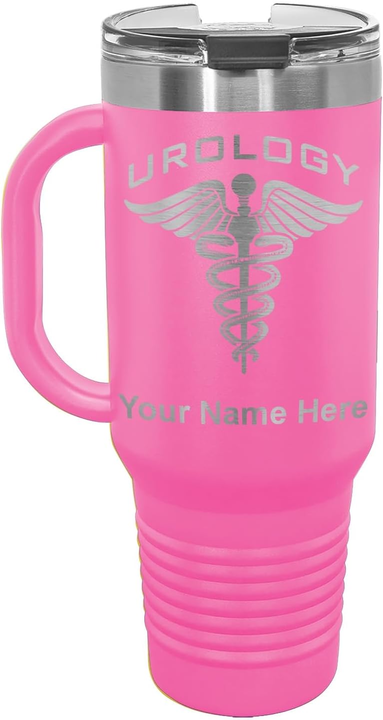 LaserGram 40 ounce Travel Mug with Handle that is laser engraved with the image that you see in the photo. Your own personalized text will be laser engraved below the image. Features double-walled stainless steel vacuum insulation with a clear lid. Click the "Customize Now" button to begin customizing your mug.