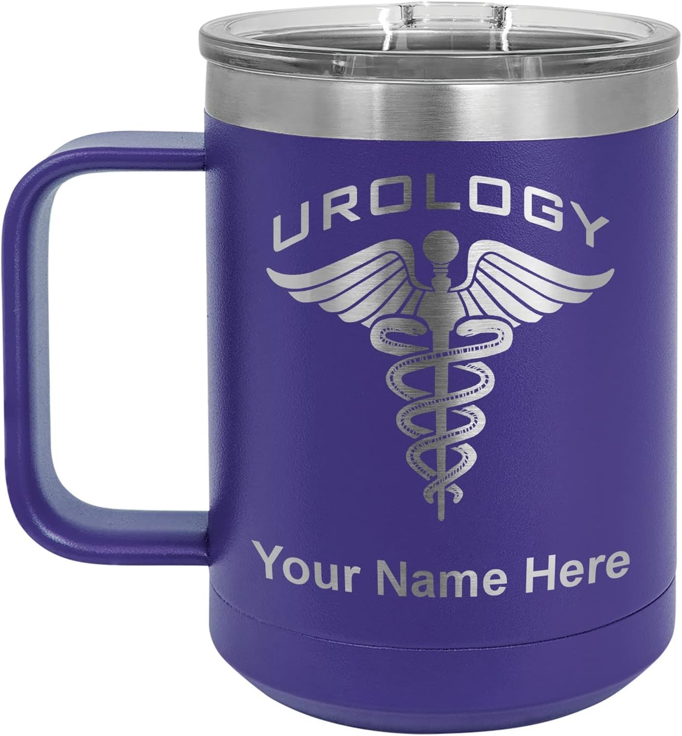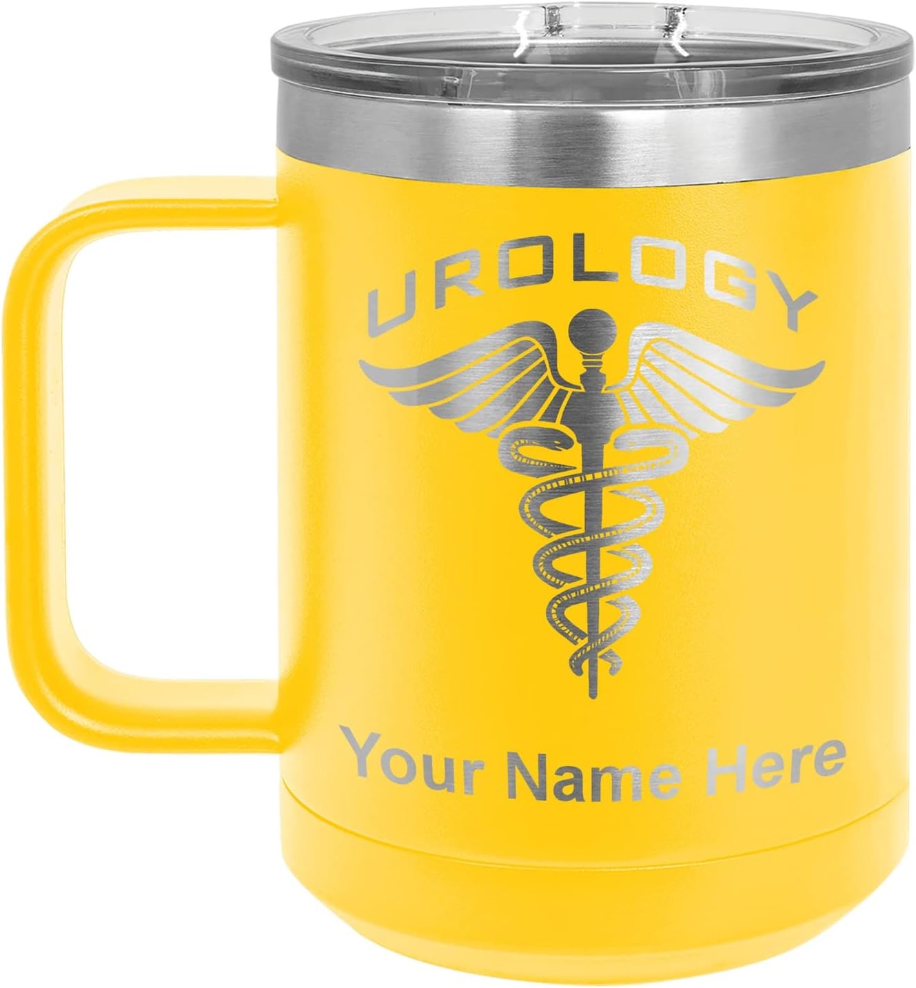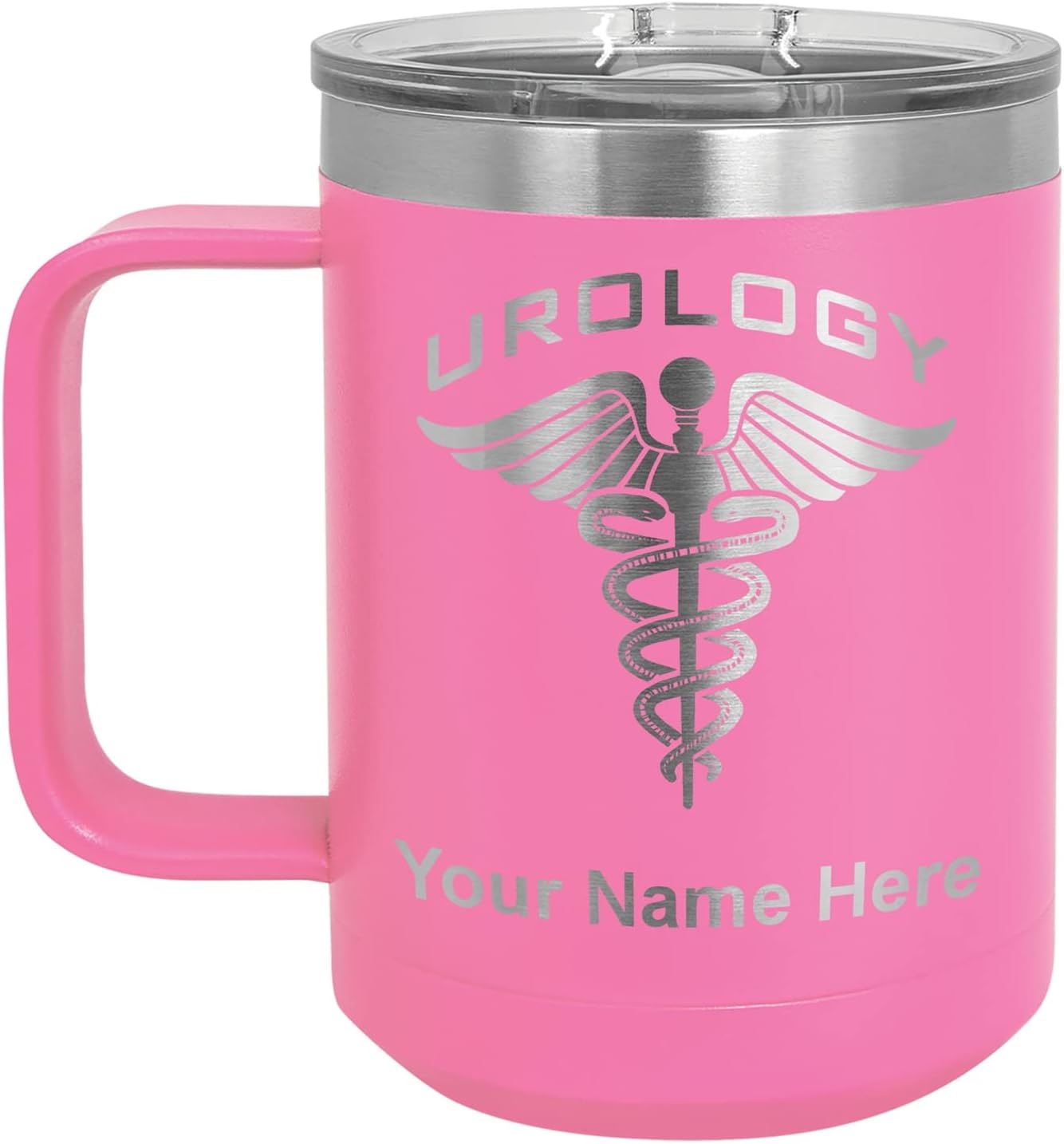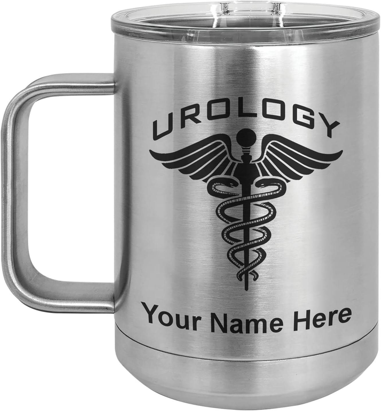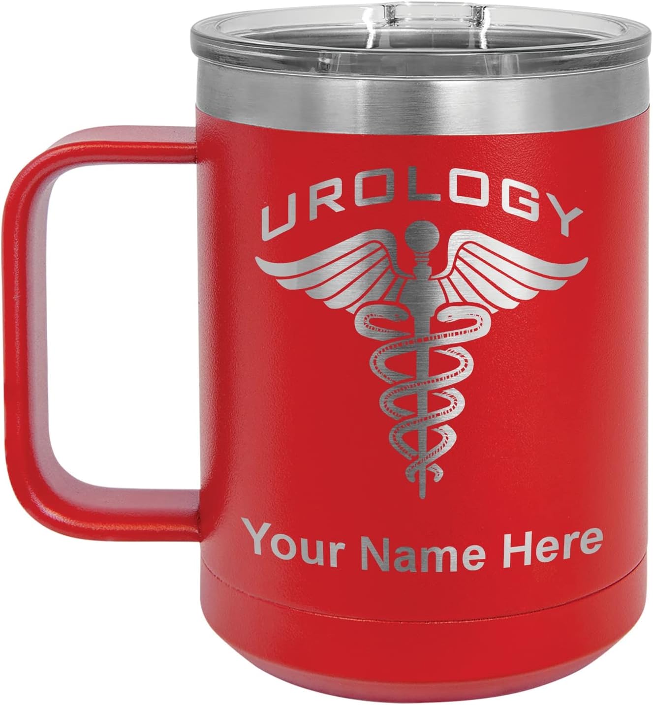 LaserGram 40 ounce Travel Mug with Handle that is laser engraved with the image that you see in the photo. Your own personalized text will be laser engraved below the image. Features double-walled stainless steel vacuum insulation with a clear lid. Click the "Customize Now" button to begin customizing your mug.