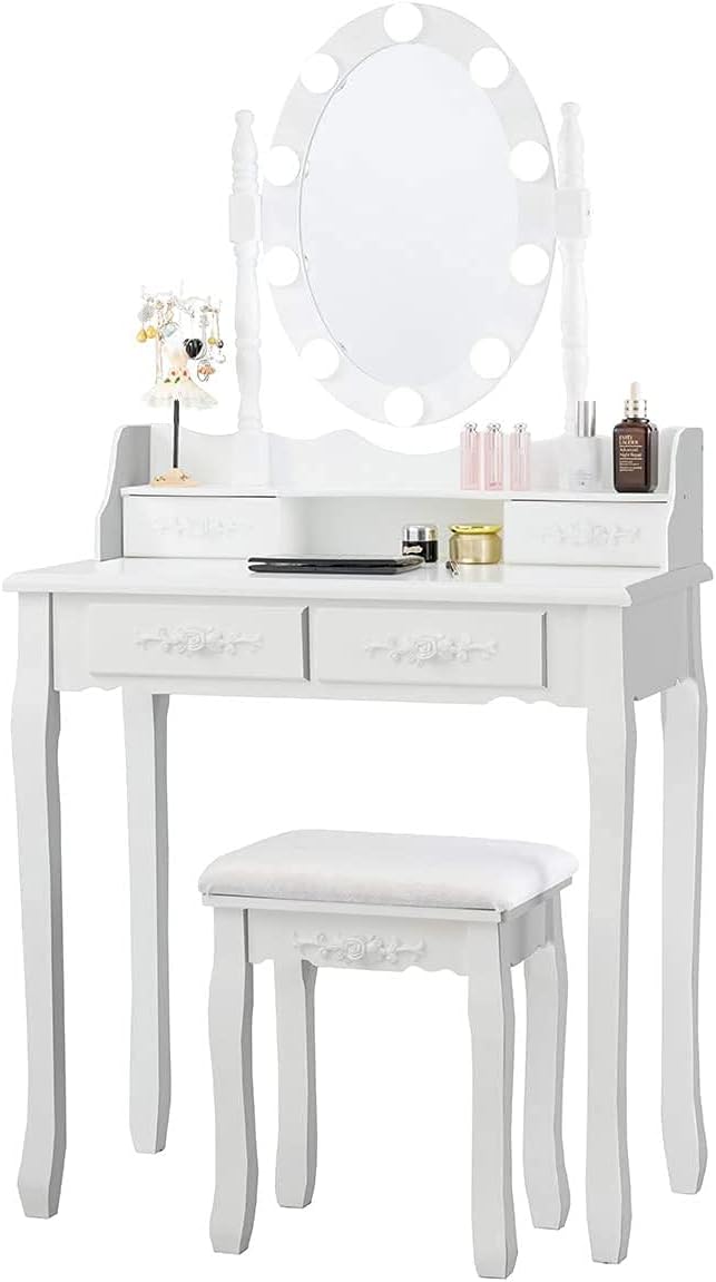 Description: Would you like a beautiful and practical dressing table? This vanity set has beautiful appearance and practical function. It will be a surprise. The design of the 4 drawers has enough room to store your lipstick, eye shadow, jewelry, etc. 10 LED lights are installed around the oval cosmetic mirror, which can adjust the brightness and solve the problem of insufficient light for you. Our products adopt a detachable top design, which perfectly combines the dressing table with the writing table. If you want a desk, take the table off it. More importantly, this makeup dressing table is made of solid wood and will not deform after long-term use. The beautiful stool is equipped with thick cushion, which can reduce the fatigue caused by sitting for a long time. What are you hesitating about? Features: The stool with sponge cushion gives you a comfortable feeling Removable top, perfect combination of dresser and writing desk 4 drawers and a spacious desktop provide enough storage space 10 LED lights with adjustable brightness to meet your needs for light An oval mirror that can rotate 360 degrees provides the best reflection angle Drawer handles has exquisite carved patterns to increase the sense of luxury Made of high-quality MDF and solid pine, durable and has a long service life Slightly curved table and stool legs with anti-skid foot pads to increase stability Specifications: Color: Black, White, Dark Brown Material: P2 MDF, Pine Net Weight: 37.5 lbs Vanity Table Size: 29.5” x 16” x 57”(L x W x H) Stool Size: 14.5” x 11” x 18”(L x W x H) Weight Capacity of Table: 220 lbs Weight Capacity of Stool: 80 lbs Big Drawer Size: 9.5” x 10.5” x 2.5”(L x W x H) Big Drawer Interior Size: 9” x 10” x 2.5”(L x W x H) Small Dra