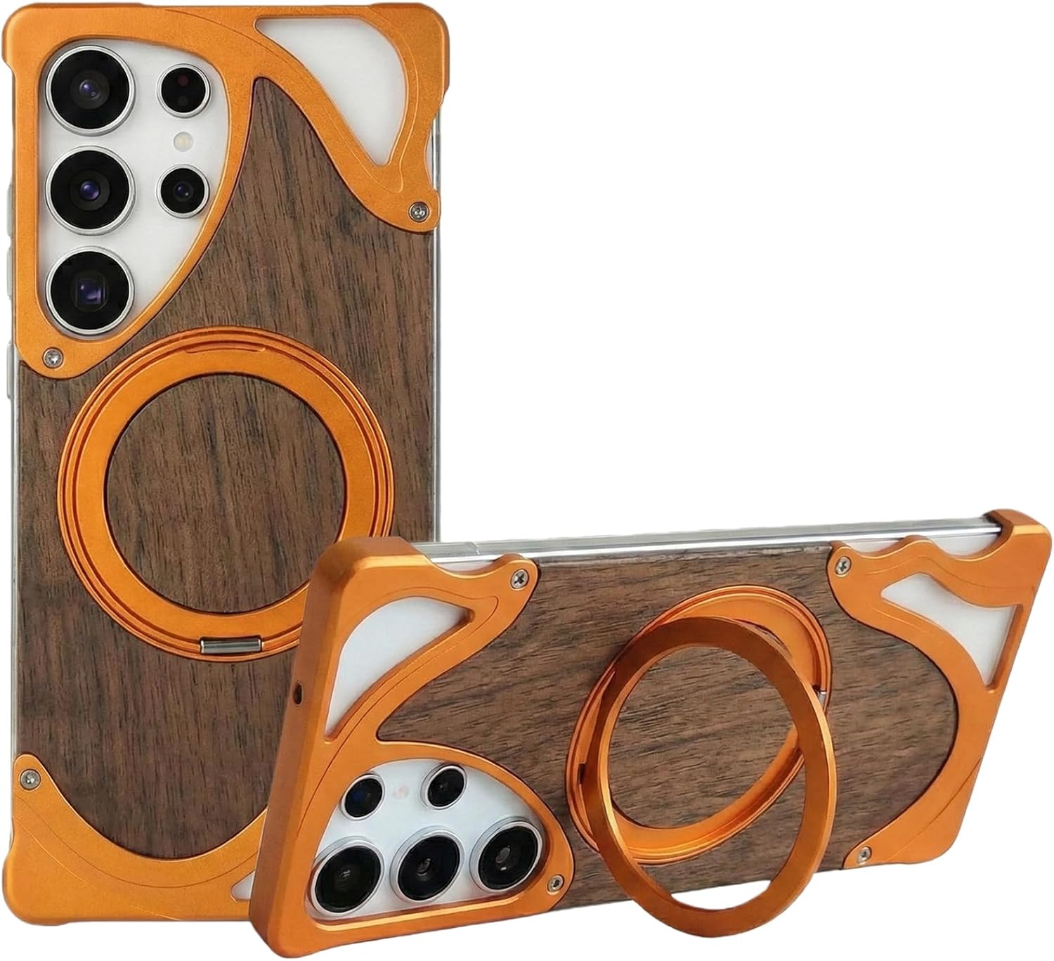 Walnut Wood + CNC Aluminum Magnetic Stand Case "Metal" Body -- Luxury, Slim DESIGN WITH ROBUST DEFENSE More Than a Case -- Come for more fun! Protection and Convenience ♚ Technical Specifications ✔️ Material: CNC-machined aluminum + natural walnut wood inlay ✔️ Rotation: 360° rotating ring + up to 120° flip stand ✔️ Protection: Air-cushioned corners + raised screen/camera lips ✔️ Installation: Screw-lock assembly (tools required) ▲ Why Choose Our Case? -- Durable and Reliable: Metal edge + wood inlay design helps resist everyday wear while keeping a clean, premium look. -- User-Friendly: Rotating ring works as a grip and stand for flexible viewing, scrolling, and hands-free calls. -- Efficient Cooling: Open, slim structure supports airflow and avoids bulky, heat-trapping build-ups. -- Enhanced Protection: Corner cushions and raised lips help reduce scratches and impact damage during daily use. -- A refined, slim case that blends real materials with practical stand-and-mount convenience. ღღ Package includes: 1* Walnut Wood + CNC Aluminum Magnetic Stand Case