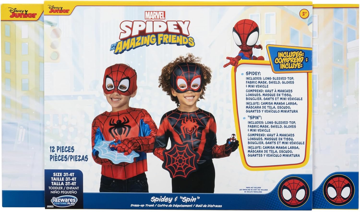 Look out: here comes the MARVEL Spidey and Spin Official Toddler Dress-Up Set. This 12-piece set features two long-sleeved tops based on both Peter Parker and Miles Morales’s unique spider suits. It also includes two fabric half masks with eye holes and two pairs of fabric gloves for each suit. Finally, it comes equipped with two web shield accessories with unique designs based on each suit. Set also contains two Spidey and Spin mini vehicles. All costumes are made from high-quality material with high-resolution prints. Jazwares Costume Play creates costumes for everyday play that are made for every member of the family. Officially licensed MARVEL product from Jazwares.