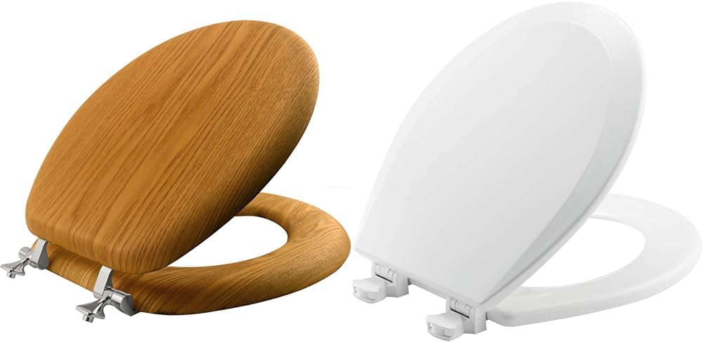 This toilet seat bundle pairs a natural oak veneer round toilet seat from Mayfair with classic non-tarnish chrome hinges (Mayfair 9601CP) with a Dresden blue plastic round toilet seat from Bemis (Bemis 500EC). The Mayfair seat brings a touch of nature to your bathroom with its oak veneer construction that resists splitting and cracking. Its chrome hinges accent your other bathroom hardware with a classic, non-tarnish finish. The Bemis offers a chip and scratch resistant high-gloss colored plastic seat that is easy to clean and replace as needed with its plastic twist-to-unlock hinges and non-corrosive mounting hardware. With the Mayfair wood seat and Bemis plastic seat together, this bundle provides options to match any décor, easy cleaning and maintenance, and long-lasting durability. Both seats fit all standard round bowl toilets from major manufacturers like Kohler, American Standard and TOTO. Whether you want to add a natural look or a pop of color, this toilet seat bundle has you covered.