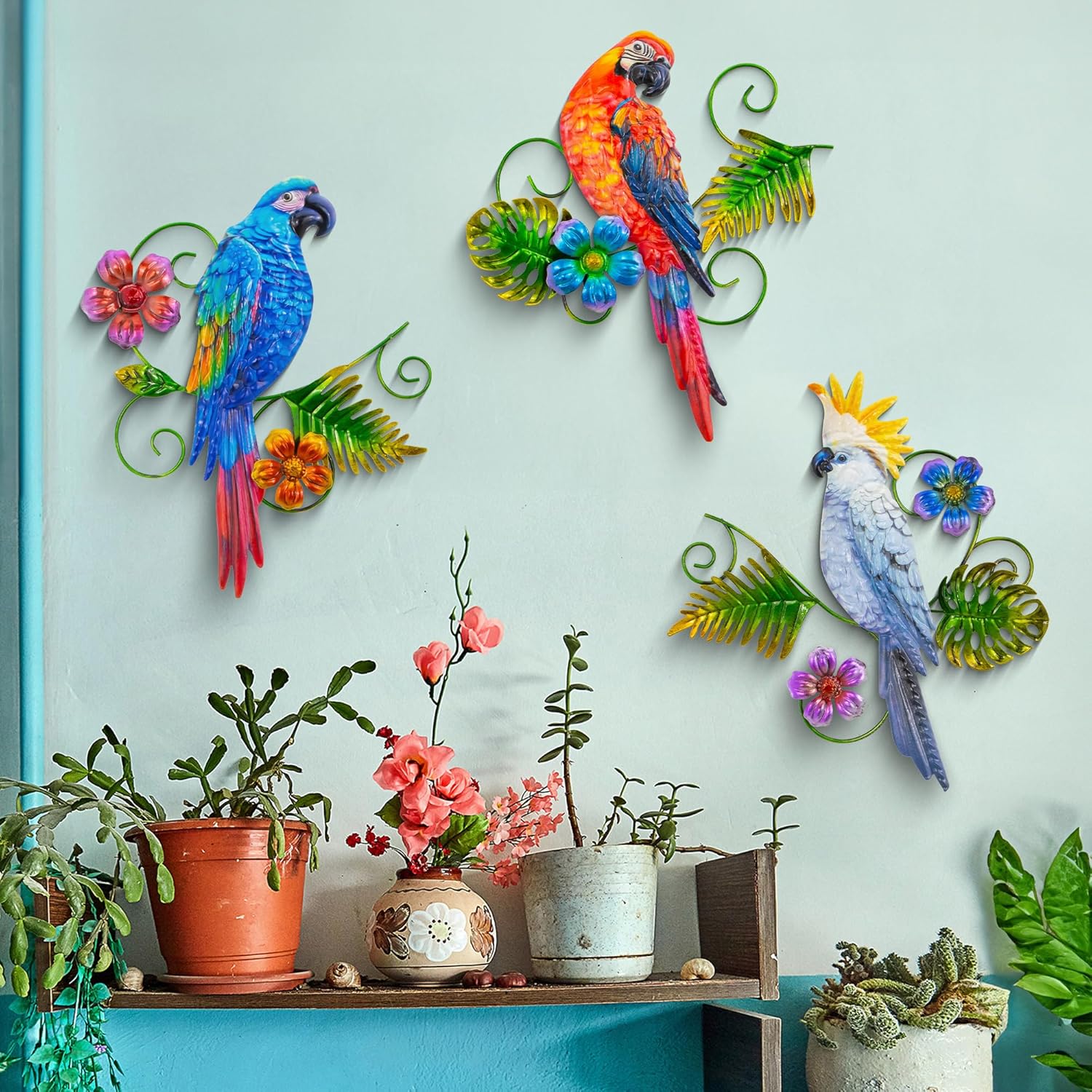 Give your indoor outdoor decoration with beautiful wall hangings, this outdoor tropical decoration is suitable for bedroom, living room, garden, backyard, balcony, patio, metal porch or outdoor fence decoration. Many different species of birds add more fun to your space.After assembly, place the wind turbine outdoors in a location where it can be exposed to sunlight for 6-8 hours. Then press the button on the solar charging panel. At night, it will automatically light up.