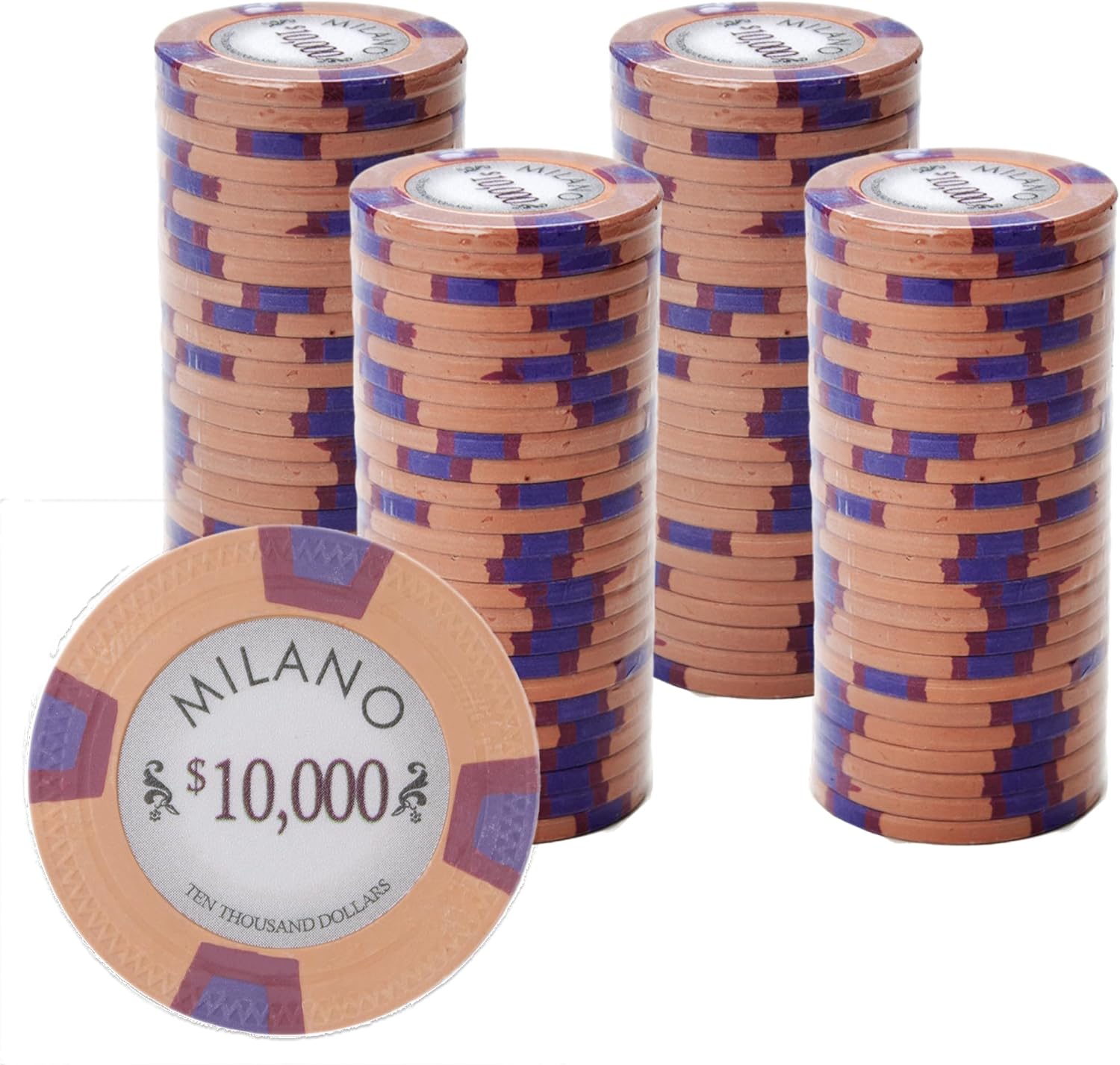 Milano poker chips are top-of-the line casino-grade clay poker chips that don't use any plastics or polymers. Unlike most poker chips on the market, each Milano chip is 100% clay, like all the best vintage casino chips of yesteryear.Pressed with a decorative Stitch & Line mold, each 10-gram chip features a colorful two-tone trapezoid edge design inspired by classic casino chips from across the USA. Each poker chip feels great in the hand because real clay lends our Milano chips a subtle earthy texture and additional heft not found in cheaper plastic poker chips.Did You Know? Casino chips traditionally only weigh 10 grams! Home players who were used to 2-gram plastic chips would visit casinos and feel the heavier chips for the first time. They'd come home and demand heavier chips, but chip manufacturers ended up with 13.5-gram "heavyweight" chips with a metal slug in the center. If you're looking to bring the authentic casino experience to your game room, bring home Milano poker chips.The full Milano collection includes twelve cash denominations: $0.25, $0.50, $1, $5, $10, $25, $100, $500, $1,000, $5,000, and $10,000.