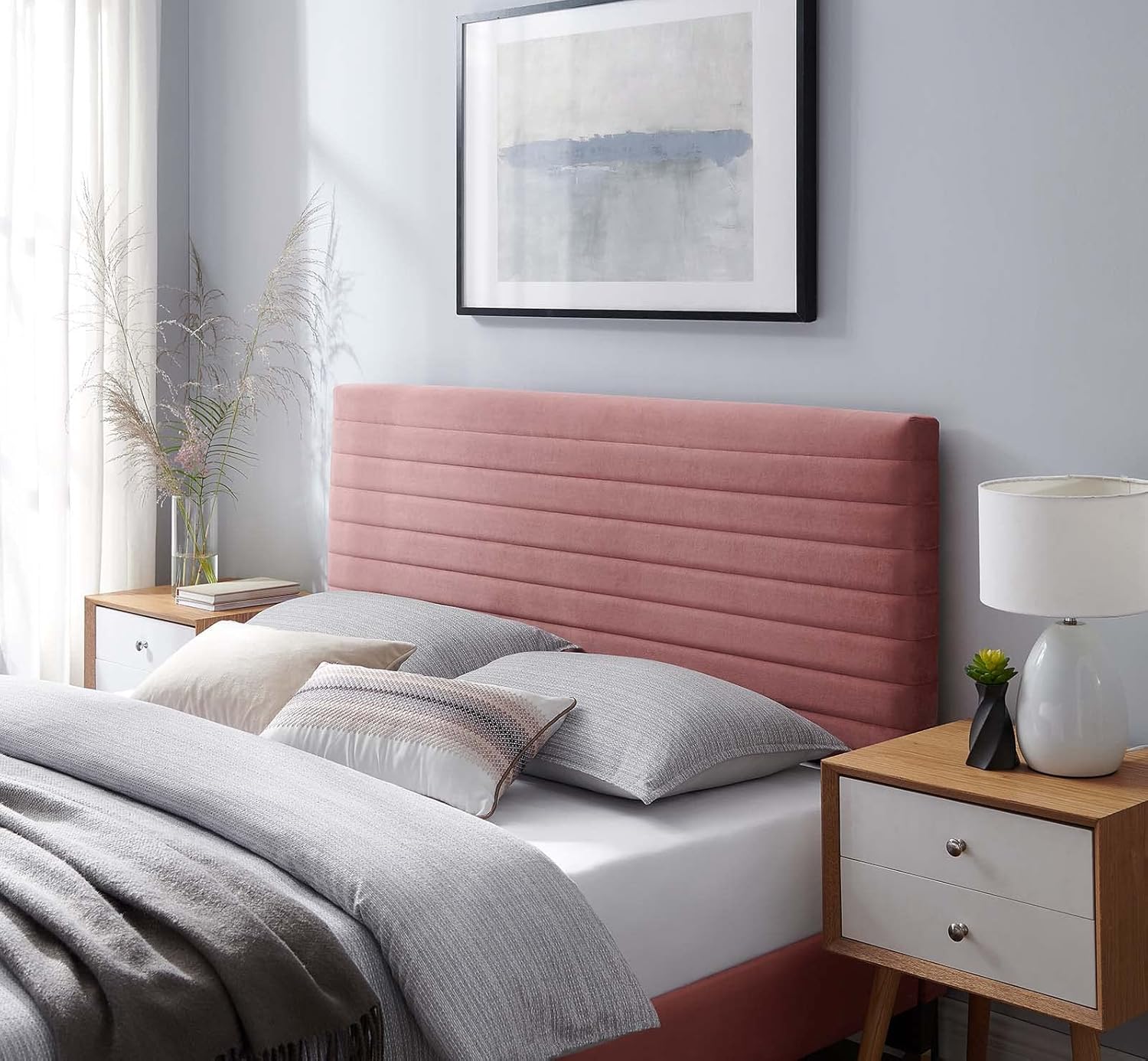 Add distinguished style your master bedroom or a guest room with the timeless elegance of the Tranquil Channel Tufted Performance Velvet King/California King Headboard, meticulously upholstered in stain-resistant performance velvet with horizontal channel tufting. This king/Cali-king padded headboard blends contemporary sleekness and subtle glam deco style for a refined focal point in mid-century modern or minimalist settings. Bolstered with dense foam padding, this king/California king upholstered headboard is a model of firmness and strength. Tranquil is a height-adjustable headboard with seven mounting positions. Assembly required.