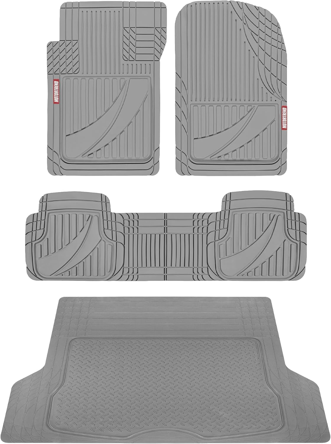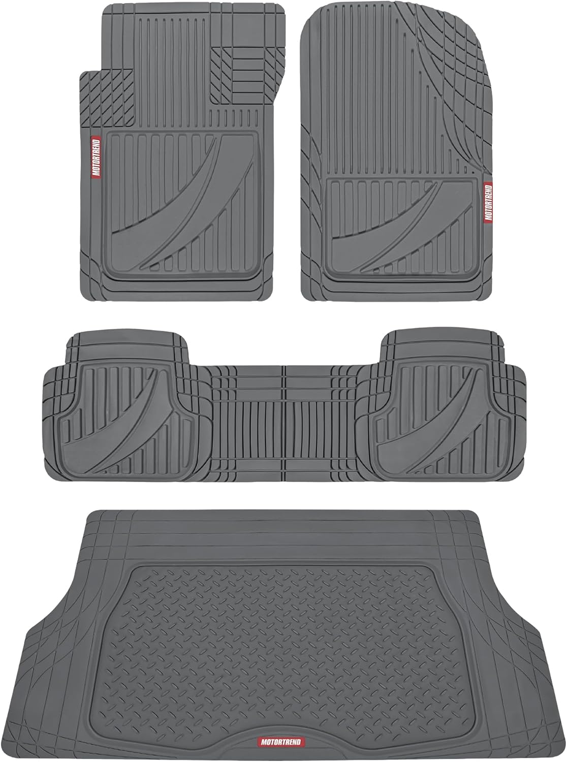 Motor Trend FlexTough Advanced Heavy Duty Black Rubber Car Floor Mats & Cargo Liner:With decades of experience, you can trust in Motor-Trend's all-weather car mats to offer exceptional reliability, providing year-round protection for your vehicle’s floors. Made from durable, heavy duty, deep dish, high-quality materials, these mats are designed to withstand heavy use, trapping dirt, water, and debris to keep your car's interior clean and protected all season in any weather. Motor Trend Automotive offers the ultimate protection for your vehicle’s interior, making it an essential addition to your collection of car accessories for men and women. Whether you drive a car, SUV, or mini-van these rubber mats for floor & trunk protection are the ideal choice to keep your car interior looking pristine.The advanced all weather car floor mats design stand up to snow, rain, mud, and more, making them a reliable choice for protecting your car carpet and preserving the appearance of your vehicle's floors. The tough, slip-resistant surface ensures that debris stays trapped, while the high-quality rubber construction provides a firm grip, keeping the mats and trunk liner securely in place. These mats offer exceptional interior car accessories that are both practical and stylish. These mats are the perfect solution for keeping your vehicle clean and protected.A few examples of SUV or Car make and models these floor mats will fit include: Ford (Explorer, Ranger, Escape, Expedition, Fusion, Lightning Mustang), Toyota (Tacoma, Rav4, Highlander, Prius, Tundra, Camry, Corolla), Chevrolet Chevy, Dodge (Durango, Journey), Honda (Civic, Accord, CR-V, Pilot, Odyssey, HR-V), Nissan (Sentra, Rogue, Altima, Frontier, Titan), Jeep (Wrangler, Grand-Cherokee), Kia (Forte, Telluride, Sorento) and more!
