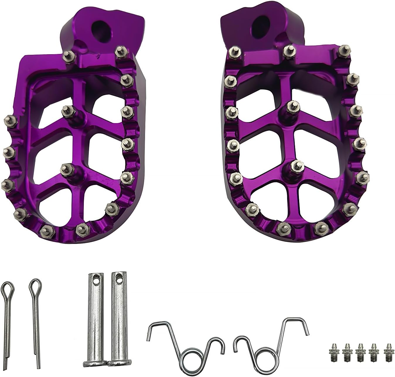 Upgrade your motorcycle's foothold with these premium CNC-machined foot pegs designed for superior grip and control. The aggressive tooth pattern along the edges combined with strategically placed steel studs provides exceptional traction in all riding conditions. Crafted from high-strength aluminum with a sleek black anodized finish, these foot pegs offer both durability and style. The wide platform design increases stability and comfort during long rides, while the honeycomb-style cutouts help shed mud and debris. Installation is straightforward with the included mounting hardware. These foot pegs are perfect for off-road adventures, daily commuting, or track days where reliable foot placement is crucial. The robust construction ensures they can withstand intense riding conditions while maintaining their aggressive grip characteristics. Their versatile design makes them suitable for various motorcycle models, offering a significant improvement over standard pegs in both functionality and appearance.