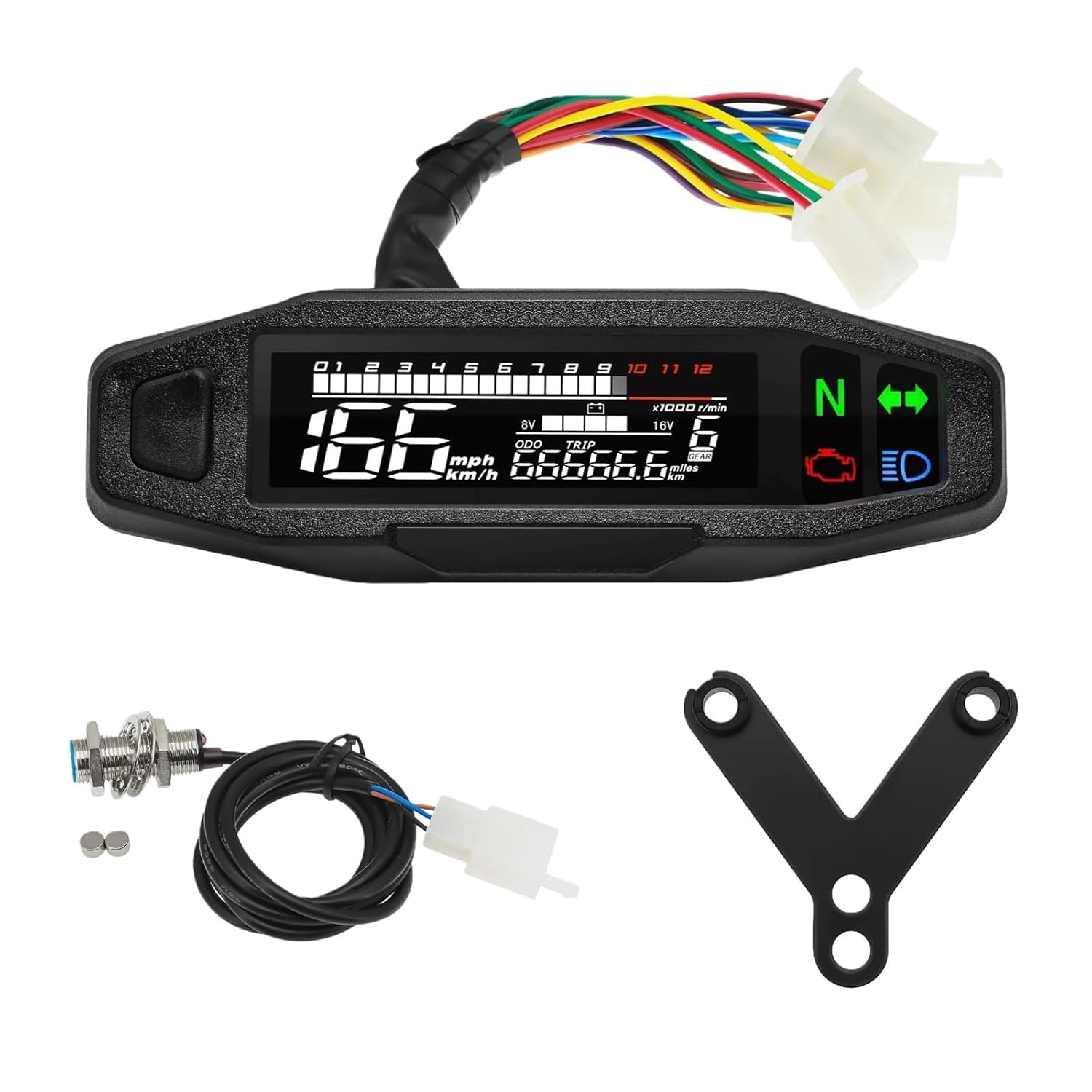Dear friend, thank you for visiting my store. If you have any questions during the purchase process, Contact us,Thank you! Happy shopping!Speedometer Motorcycle Universal Digital Dashboard Km/h MPH Odometer Meter Gauge Sensor with Y/Z/W BracketMotorcycle cluster screen protector transparency maintains clear visibility of dashboard information without affecting display , ensuring driving safetyFits most motorcycle models.Max speed : 199km/hMax trip: 999.9kmMax rpm:1200 rpmblue wire ~High beamyellow-red ~4 levelblue-red~2 levelblue-white~RPMorange~left turning lightgreen~powerblack~positive electrodeyellow-voltage 5vbrowne-white~5 levelgreen-black~3 levelpink~1 levelred~speedgreen-red~ N levellight blue~right turning lightColor:blackMaterial: plastics+metal【Service Guarantee】If you have any installation and product problems after receiving the goods, you can contact us, we will handle the problem properly.
