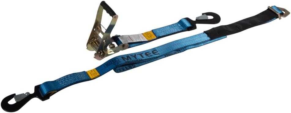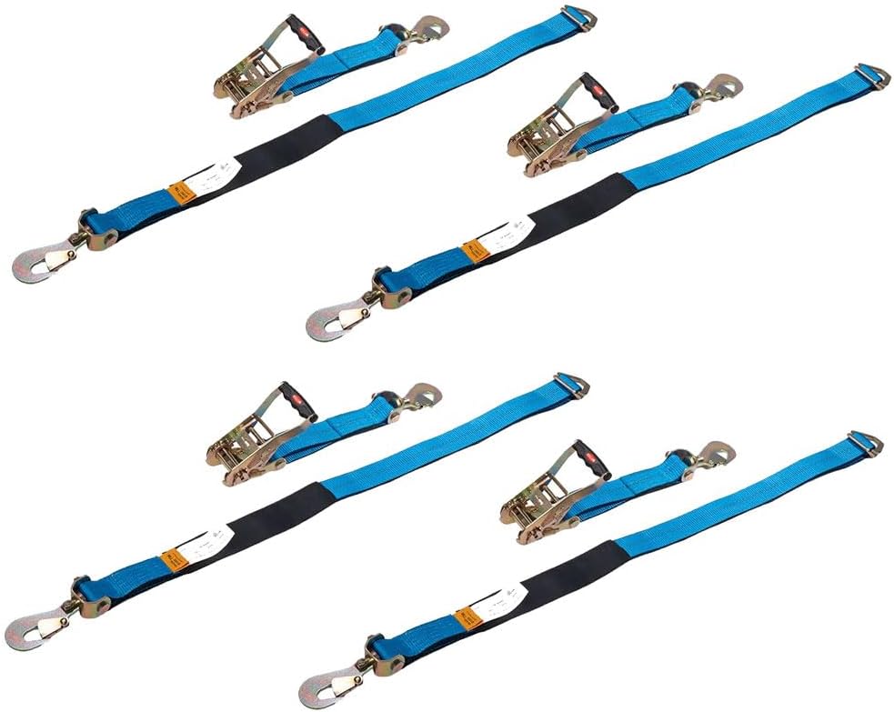 Pack Size: 4 Pack2"x8' Ratchet Axle Strap w/ Floating D-Ring and Snap Hooks Securely tie down your vehicle using our Ratchet Axle Straps. The strap features an adjustable D-Ring that can be moved to the appropriate location on the straps for proper tie-down. Use this strap along with our axle straps in order to securely tie-down your vehicle. Working Load Limit: 3,333 LbsAssembly Breaking Strength: 10,000 LbsSnap Hook on both ends (11,000# Breaking Strength)Fully adjustable D Ring w/locking strap adjuster (10,000# Breaking Strength)Cordura Sleeve for extra abrasion protection2" Heavy Duty Webbing (12,000# Break Strength) with black edging