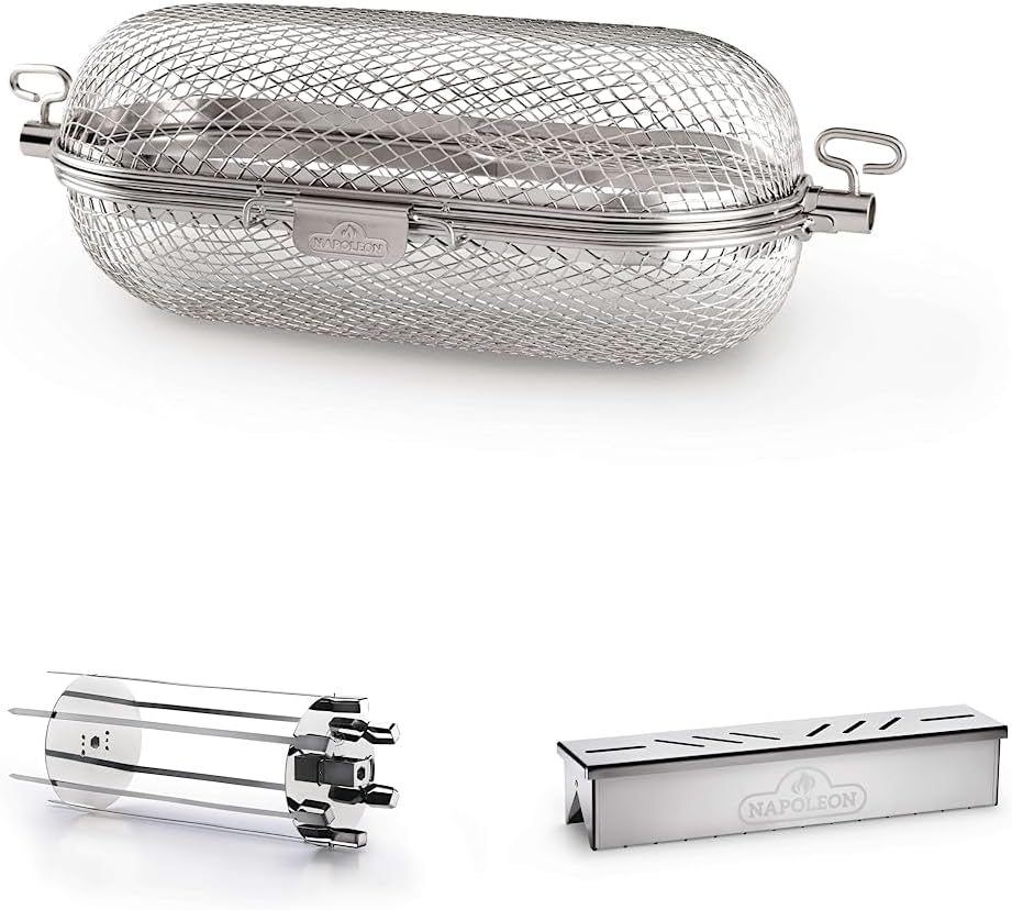 Napoleon 64000 Rotisserie Basket Grill Accessory, Stainless SteelThings just taste better when they're barbecued and with the Napoleon Rotisserie Basket it's easy to make wings, french fries, and so much more right on the grill. The Rotisserie Basket's rod ports fit most rotisserie rod styles and lock in place with the thumb screws. Once you've created the most delicious wings, crispiest fries, and grill roasted veggies without the addition of oil, the stainless steel baskets clean up easily, then nest for space saving storage.Napoleon 64008 Rotisserie Shish-Kebab Skewer Set Grill Accessory, Stainless SteelBuild colossal kebabs and make masterful meals using the Napoleon Rotisserie Shish Kebab Wheel. This unconventional way to grill skewers is a conversation starter that allows you to continue the conversation instead of monitoring your kebabs constantly. Create custom meals for everyone in an easy-to-use barbecue grill accessory. Simply thread your favorite foods onto the wide skewers and load them onto the wheel and rotisserie spit rod. Use the infrared rear burner or main bottom burners on the barbecue grill to perfectly cook every single morsel. Chrome-plated parts are easy to clean and assemble. This unit will fit most rotisserie spit rods. Spin your next meal right round with a healthy and delicious way to cook on a barbecue. Clever, multifunctional and easy to maintain, every kitchen benefits from the addition of a Napoleon barbecue accessory. Our accessories provide you with the essentials to create delicious grilled food and then some to enhance your cooking arsenal with a wide variety of creative additions to broaden your culinary horizons.