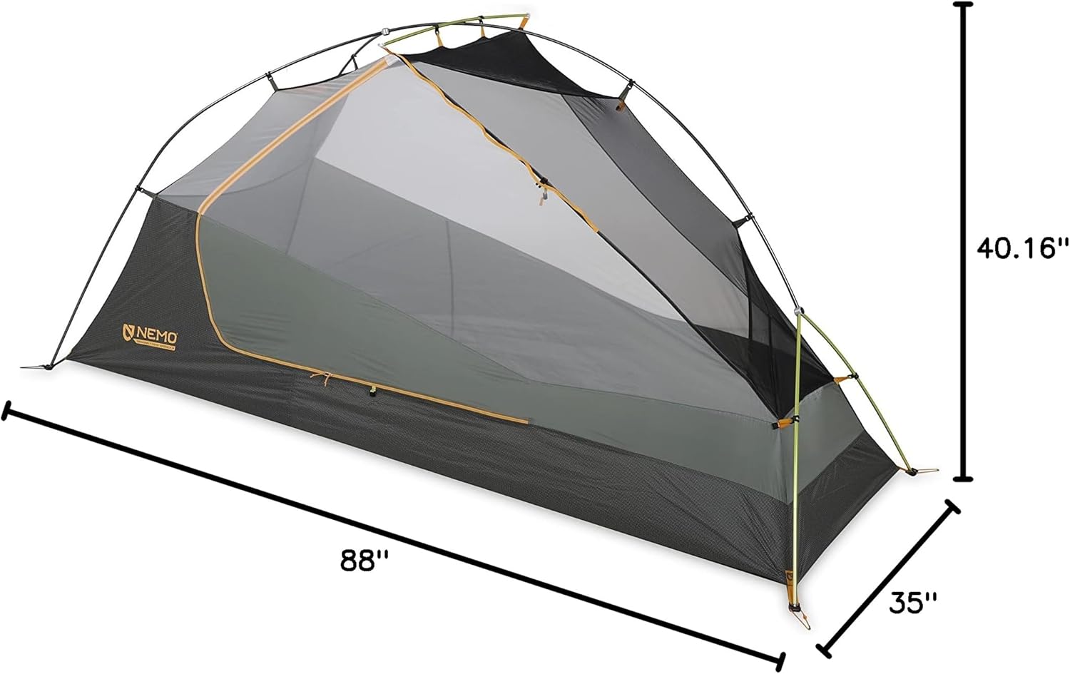 Dragonfly Bikepack OSMO is an ultralight tent tailored specifically for two-wheeled journeys, canoe trips, and other excursions where its ultra-small pack-down size makes a huge difference. Now made with an improved pole structure and unique cross bar that increases its interior space, this Dragonfly can travel swiftly and truly stretch its wings.The stronger, more stable pole set is paired with NEMO’s custom Elements hardware collection, which includes a new forged hub design that enables the crossbar “wings” to angle upward before tension is applied. Once the tent is clipped in and tensioned, this Precurve approach creates a near-horizontal roof and ample headroom at more than just the peak. Lightweight variations of our Axial corner anchor are included to make the rain fly attachment process painless.A roomy interior is only a plus when you’re protected from harsh weather, and that’s where OSMO comes in. A stealthy, solution-dyed version of our proprietary fabric is used on this tent, and it continues to excel at repelling water and staying taut even when wet. Even better, it has a superior tear strength to complement this tent’s now-tougher frame. (Crazy winds? Bring ‘em on.)The generously sized doors pair with roomy vestibules and a Landing Zone storage “tub” that can be placed on either side of the tent to help protect gear from muddy terrain. Inside, a gear loft and pockets keep belongings tidy while an overhead Nightlight Pocket casts headlamp light with a warm, even glow. Included, as well, is a configurable daisy chain that can be positioned both inside and outside the tent to aid in drying wet gear.When it’s time to move, Dragonfly Bikepack neatly stores away in its bike-optimized dry bag, an updated design that’s sized for easy packing, opens from either end, and securely attaches to the headtube and handlebars. NEMO’s Adventure Forever Guarantee covers this product to help keep the journey smooth on your roads ahead.