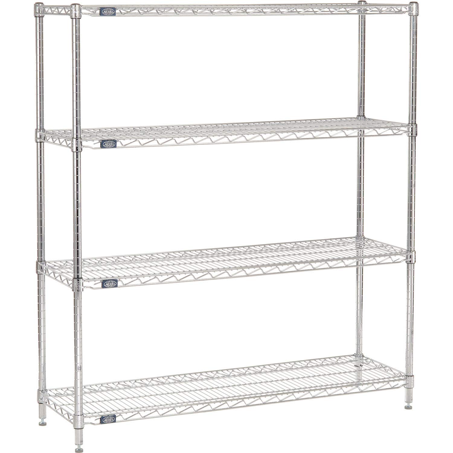Nexel 4-Shelf Wire Shelving Unit ● Chrome Finish ● 14"W x 60"L x 74"H ● Complete Shelving Unit includes 4 shelves, 4 posts, 16 shelf clips and 4 leveling bolts (with non-marring floor glides) ● Shelves measures: 14"W x 60"L ● Posts measure: 74"H ● 600 lbs. - 800 lbs. capacity per shelf ● Great for any home or office environment ● Nexel's Chrome is electroplated nickel chrome resulting in a brilliant high gloss finish ● NSF listed ● Limited One Year Warranty against rust and corrosion ● Open wire construction maximizes light and air circulation to keep stored items dry and ventilated ● Shelves easily adjust without tools and align accurately at 1" increments ● Nexel also offers several accessories (baskets, hooks, ledges, casters, etc.) which can be purchased separately and extend the usefulness of your shelving unit ● *Photos may not reflect advertised size.