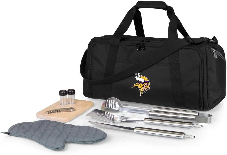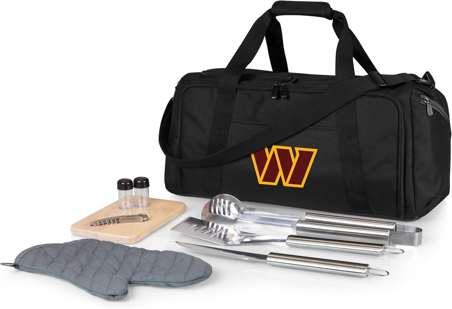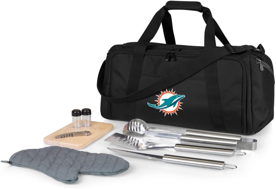 This NFL Picnic Time BBQ Kit Cooler Tote offers the perfect combination to take along to the beach, the park or tailgating. The tote features durable polyester construction on the exterior with your favorite team's logo, multiple utility pockets for your extra stuff, and has dual handles plus an adjustable shoulder strap, giving you transport options. The interior liner is heat-sealed PVC for keeping your food and drinks chilled to just the right temperature, with a 46-can capacity when chock full. Unzip the front pocket to reveal all the BBQ and picnic accessories that are included-one each: long BBQ knife, spatula and tongs, all in stainless steel, BBQ mitt, stainless steel waiter's style corkscrew, a set of salt and pepper shakers, and a 9-inch cutting board made from Schima Superba wood, a hardwood often used in construction, underscoring its durability. This kit makes a fabulous gift for the grillmaster! Measures 21 by 11 by 10 inches, and comes with Picnic Time's Lifetime Warranty.