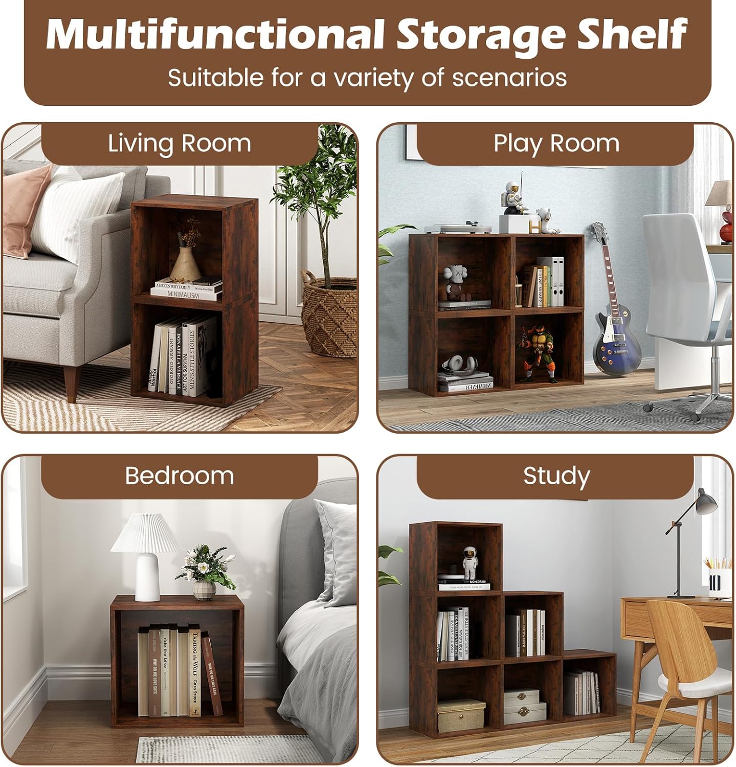 Description:Transform your home with these stackable storage cubes, designed to maximize space and provide versatile storage solutions. Each cube is crafted from high-quality boards and features a load capacity of up to 55 lbs, making them perfect for storing books, vinyl records, clothes, decorations and more. The modular design allows for customizable stacking, creating a unique storage solution tailored to your needs. With a compact size and open design, these cubes are ideal for small spaces, ensuring that you can keep your items organized and within easy reach. The sleek, easy-to-maintain surface adds a touch of elegance to any room , while the protective foot pads avoid scratches. Plus, the 2 included anti-tipping kits (for set of 4) provide added safety.Features:Convenient storage units to save your valuable spaceCustomizable stacking and layout with modular designHigh-strength board is easy to cleanKeep the appearance tidy and elegant with screw hole coversEnhanced firmness with plastic angle code bracketsAvoid scratches with protective foot padsStack up to 4 cubes vertically at most for safety reasonsInclude anti-tipping kits for added safety (for sets of 4)Perfect for use in the study, living room, bedroom and moreAssembly is requiredSpecifications:Color: Rustic Brown/WhiteMaterial: Engineered WoodOverall Dimensions: 13.5” x 11” x 12.5” (L x W x H)Inner Size: 12.5” x 10.5” x 11.5” (L x W x H)Load Capacity of Each Cube: 55 lbsNet Weight of Each Cube: 7.5 lbsPackage Includes:1/2/4 x Storage Cubes1/2 x User Guides