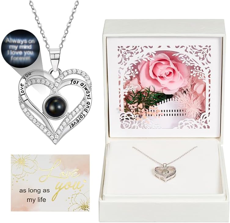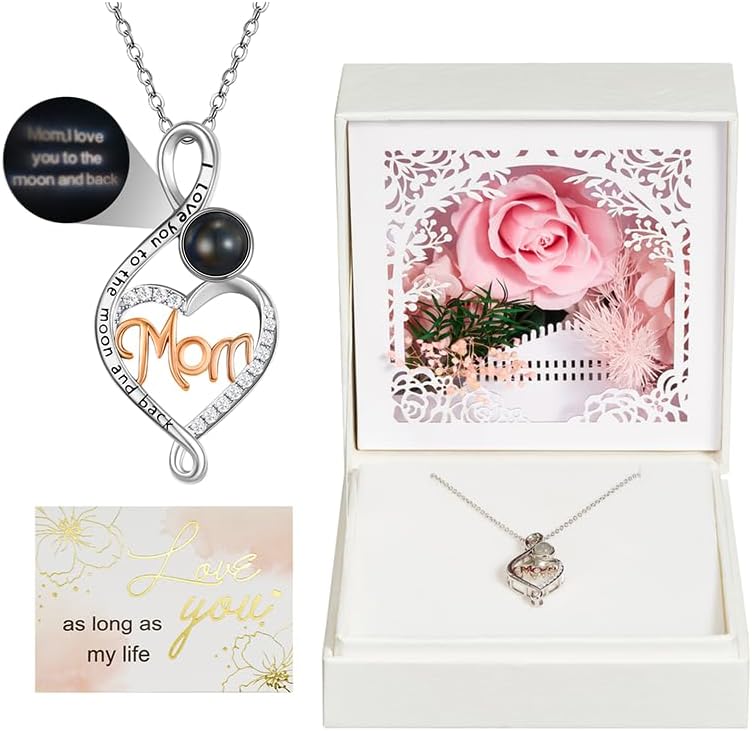 Elevate the Art of Gifting with Timeless Beauty and Eternal Love — more than a keepsake, this infinity heart projection necklace + preserved flower gift box set is designed to create unforgettable moments. Nestled within an exquisitely crafted display of real preserved roses that can last for years without maintenance, the heart-shaped necklace features a sparkling projection stone that reveals hidden messages of love in light — a magical touch that makes every glance meaningful.Each piece is thoughtfully presented in a luxury gift box that showcases the delicate preserved flowers and necklace, turning every unboxing into a moment of surprise and joy. The necklace’s heart silhouette and projection stone symbolize infinite affection and connection, making it an ideal expression of gratitude and devotion for Mother’s Day, birthdays, anniversaries, or any day you want her to feel truly cherished.This set also includes a beautiful greeting card for your personal message, so you can speak from the heart without needing extra wrapping — it’s ready to gift right out of the box. Whether you’re celebrating your mom, wife, grandma, or another special woman who’s given you love without limits, this elegant combination of floral art and meaningful jewelry transforms your sentiment into a treasured keepsake she’ll hold close forever.