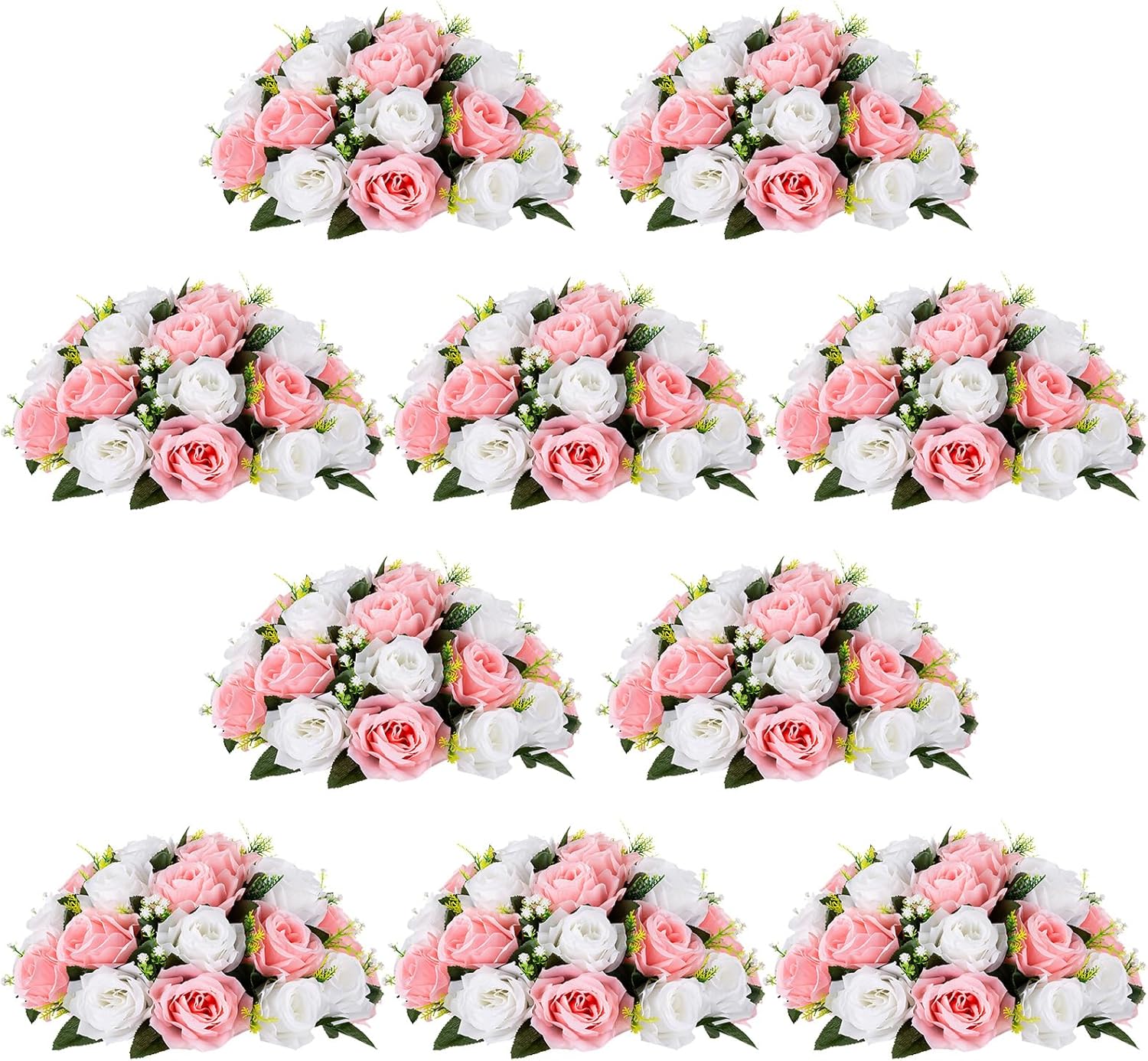 • Beautifully Designed: Our package includes 10 hemispherical fake flower balls with a patented base (US Patent No. D935347S) and 10 ties. With the base, these half flowerballs can be placed directly on the flower stands/vases or on the table. Each flower ball has 30 rose heads. These flower balls are 13.8 inches/ 35cm in diameter and 7 inches/ 18cm tall, making them the perfect size for any occasion.